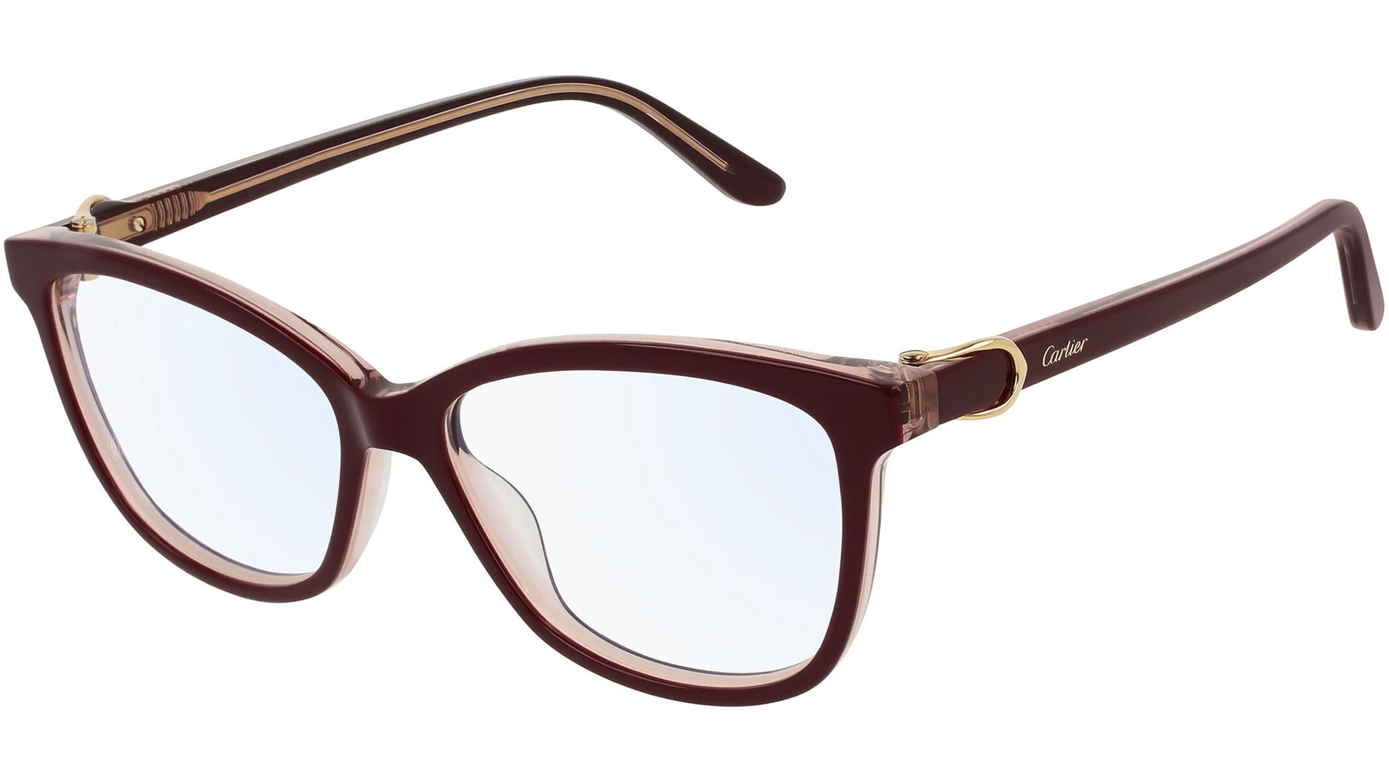 Cartier Initiation optical collection model CT0129O 003 featuring bilayer burgundy and rose frame and red temple.