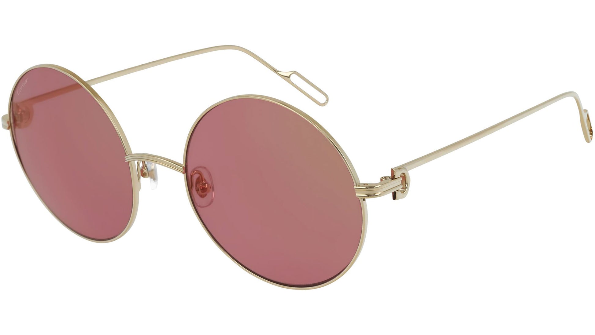 Cartier CT0156S 003 sunglasses with smooth golden frame and cyclamen with a golden flash lens.
