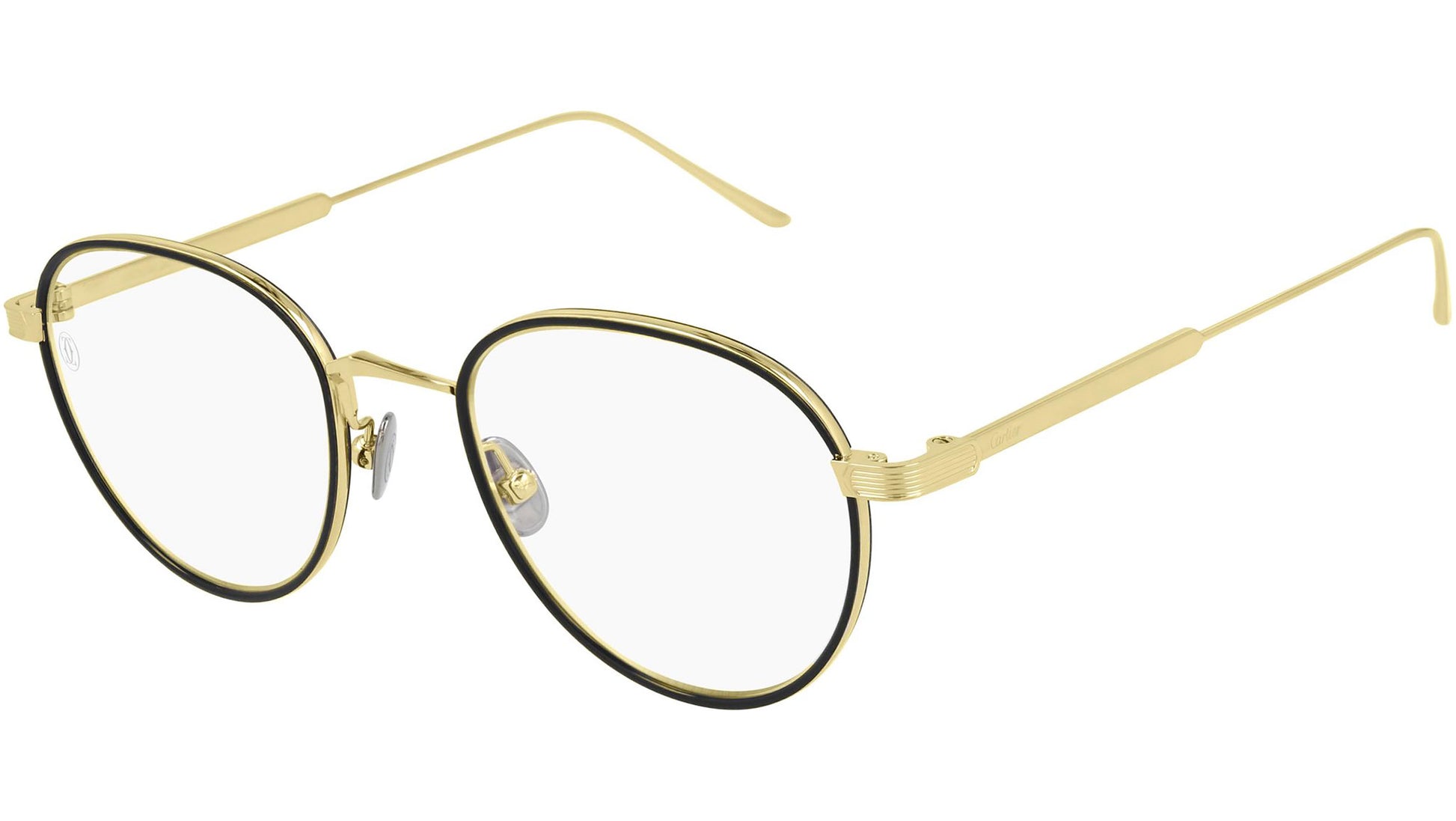 Cartier Core Range optical collection model CT0250O 001 featuring smooth golden frame and gold temple.