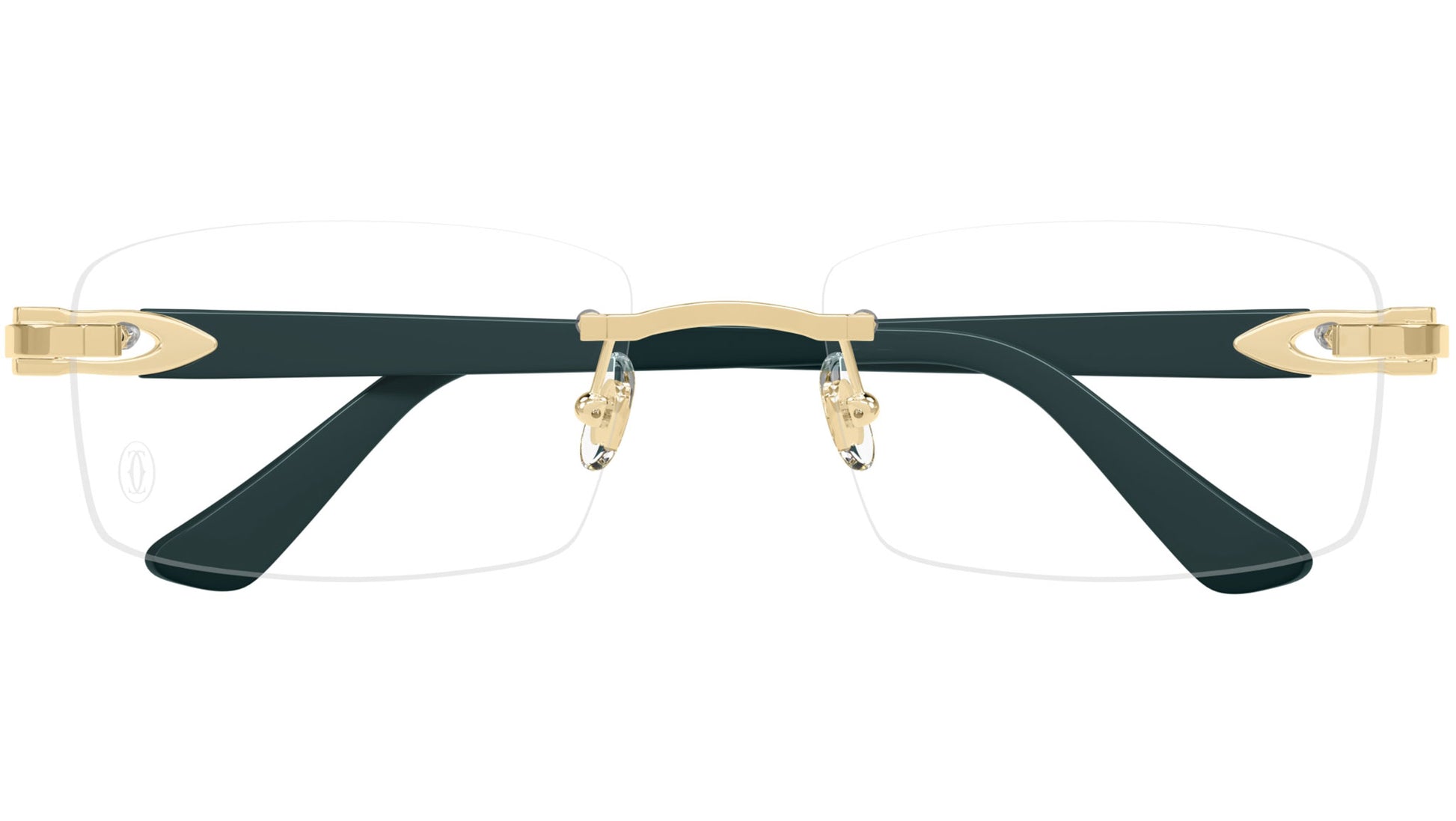 Cartier Core Range eyewear model CT0287O rectangle metal glasses color code 009 smooth golden finish with green temple and recycled demo lens with hard coating and AR blue out.