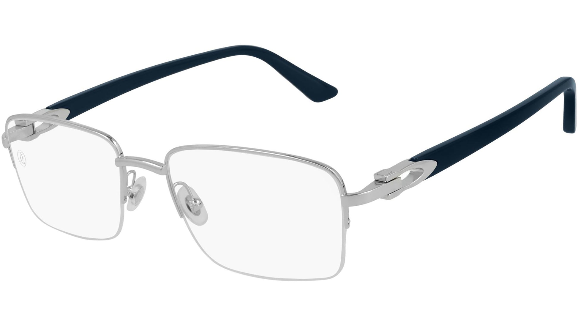 Cartier Core Range optical collection model CT0288O 004 featuring smooth platinum frame and blue temple.