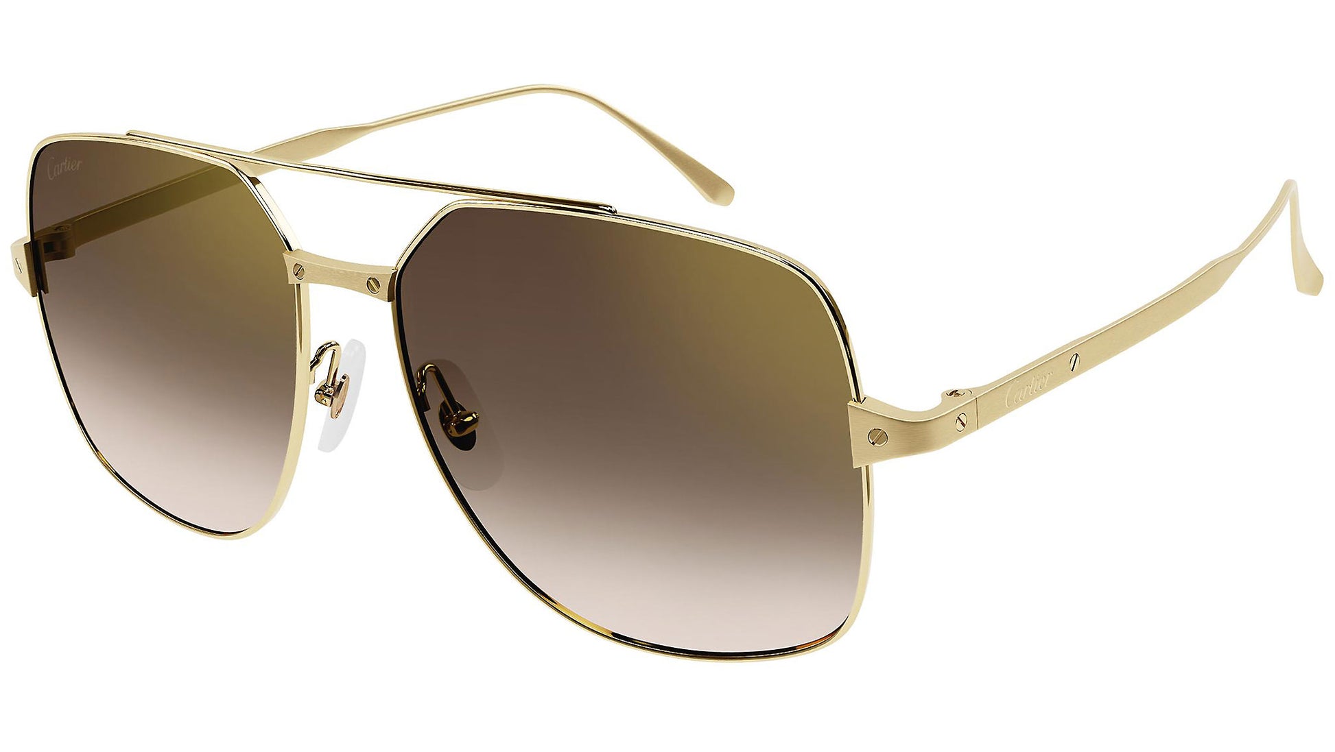 Cartier 0329S 002 sunglasses with smooth and brushed golden finish frame and graded brown with a golden flash lens.