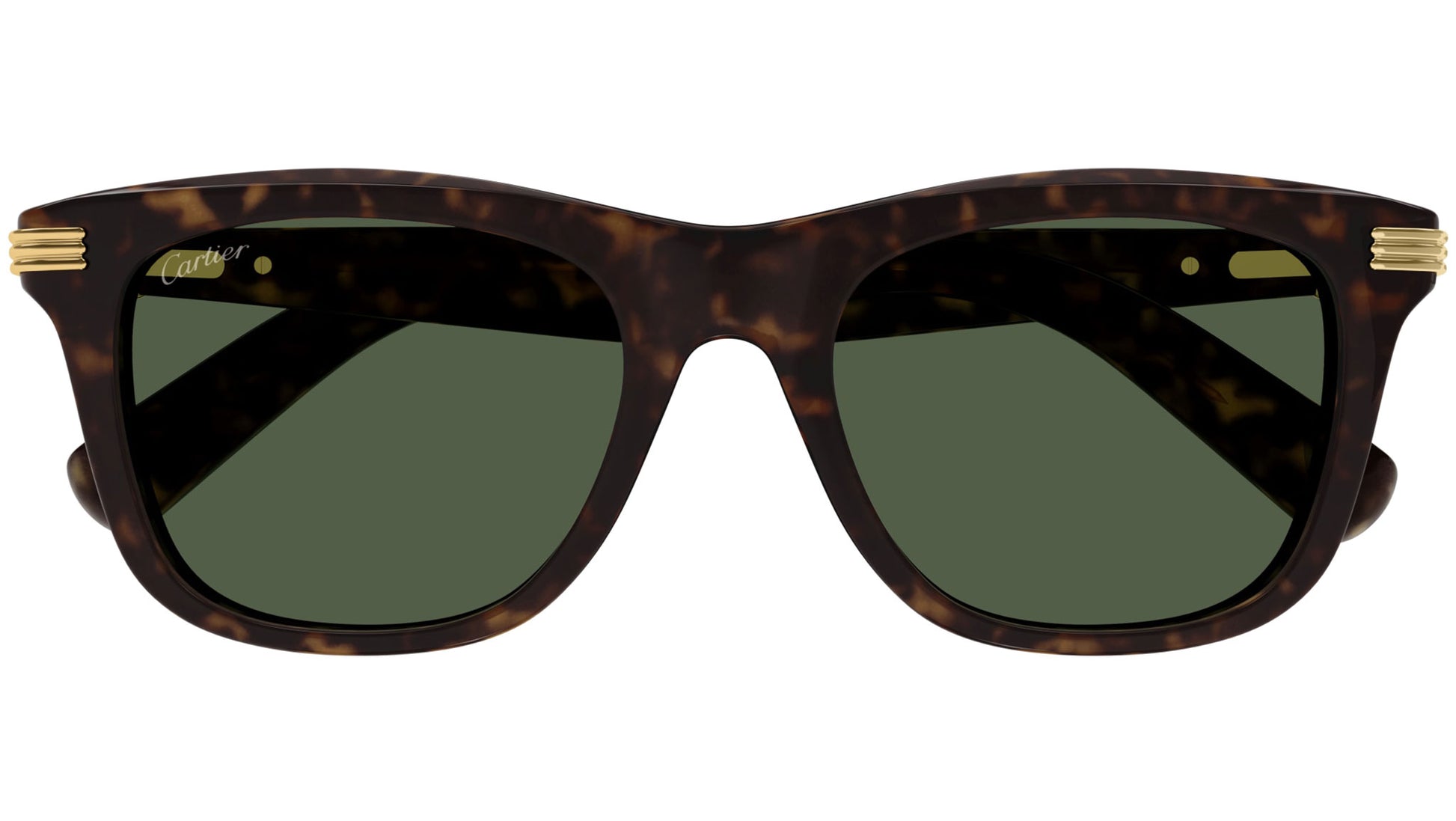 Cartier Contemporary sunglasses collection model CT0396S 002 featuring dark tortoiseshell effect frame and green lens.