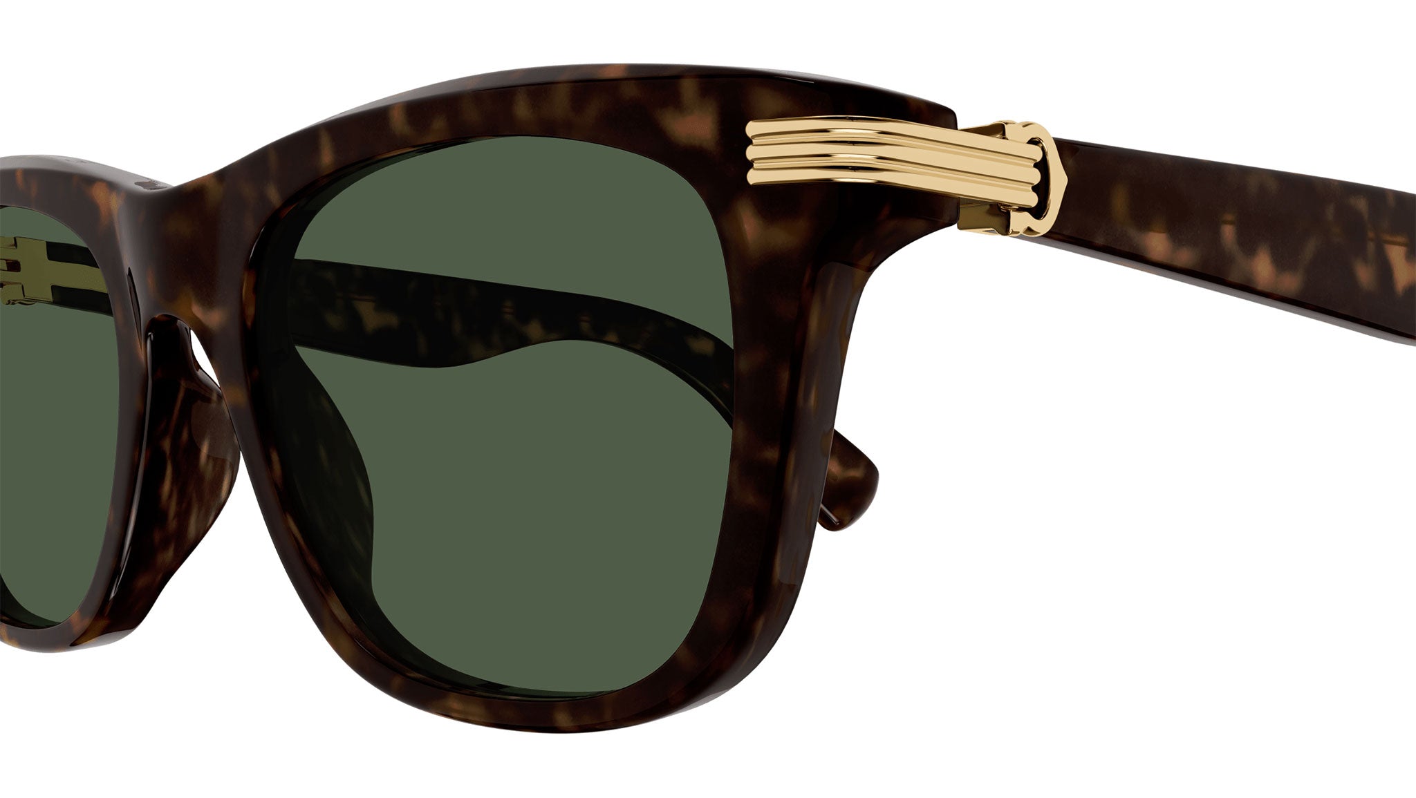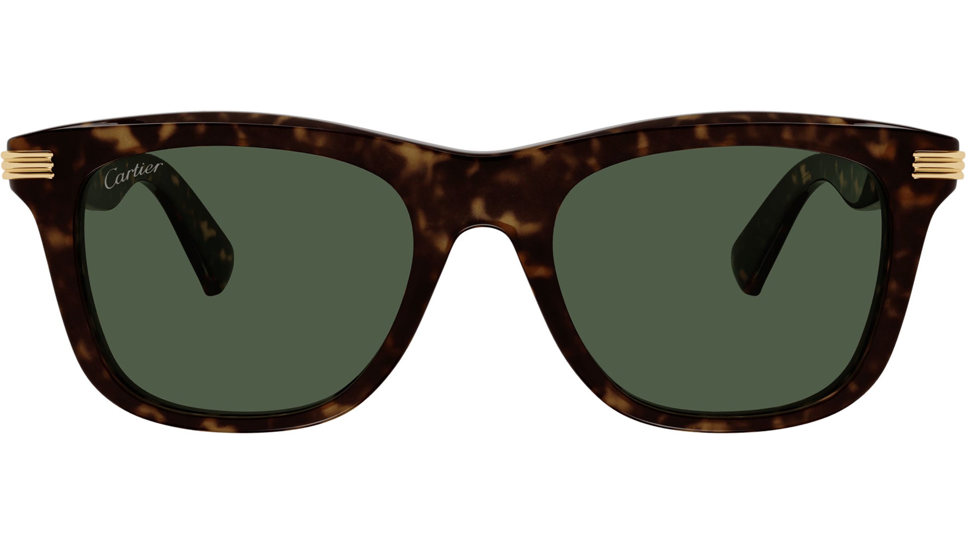 Cartier Première CT0396S 002 sunglasses for men, featuring dark tortoiseshell effect rectangular recycled acetate frame and green nylon lenses. Brand line: Première de Cartier. Style code: CT0396S. Color code: 002. Made in Italy. Authorized Cartier online reseller. Your glasses will include the original case and accessories and are covered by a 12-month global warranty.
