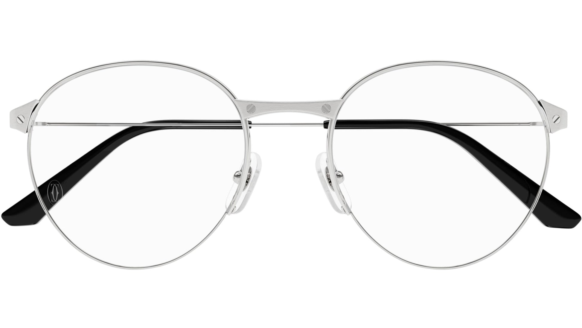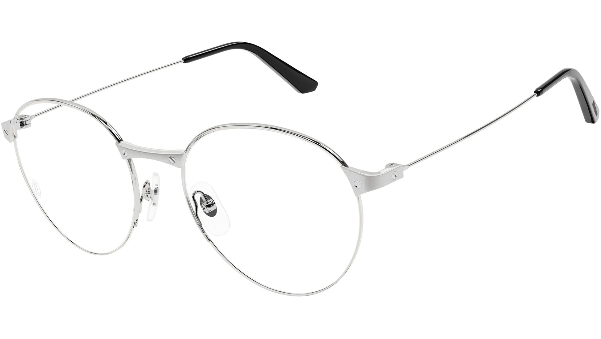 Cartier Core Range optical collection model CT0405O 002 featuring smooth platinum finish frame and silver temple.