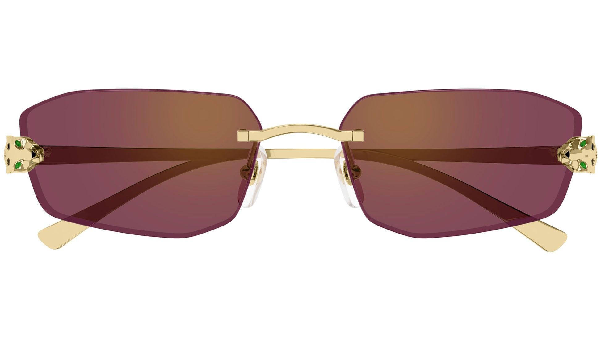 Cartier Exception sunglasses model CT0474S geometric metal frame color code 002 smooth golden finish with gold temple and bordeaux with a golden flash lens.