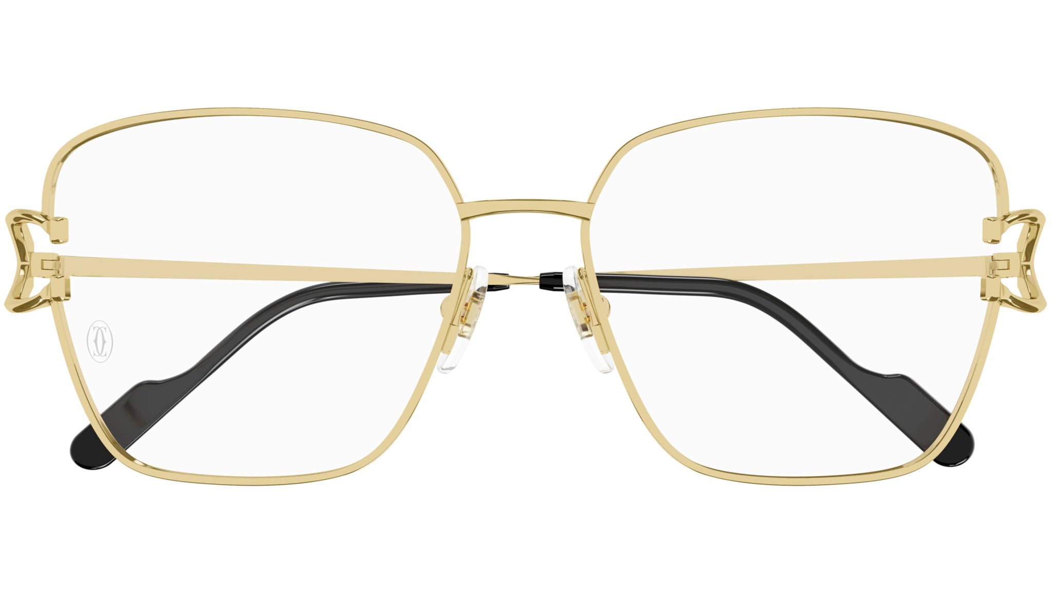 Cartier Core Range eyewear model CT0486O cat eye metal glasses color code 001 smooth golden finish with gold temple and recycled demo lens with hard coating and AR blue out.
