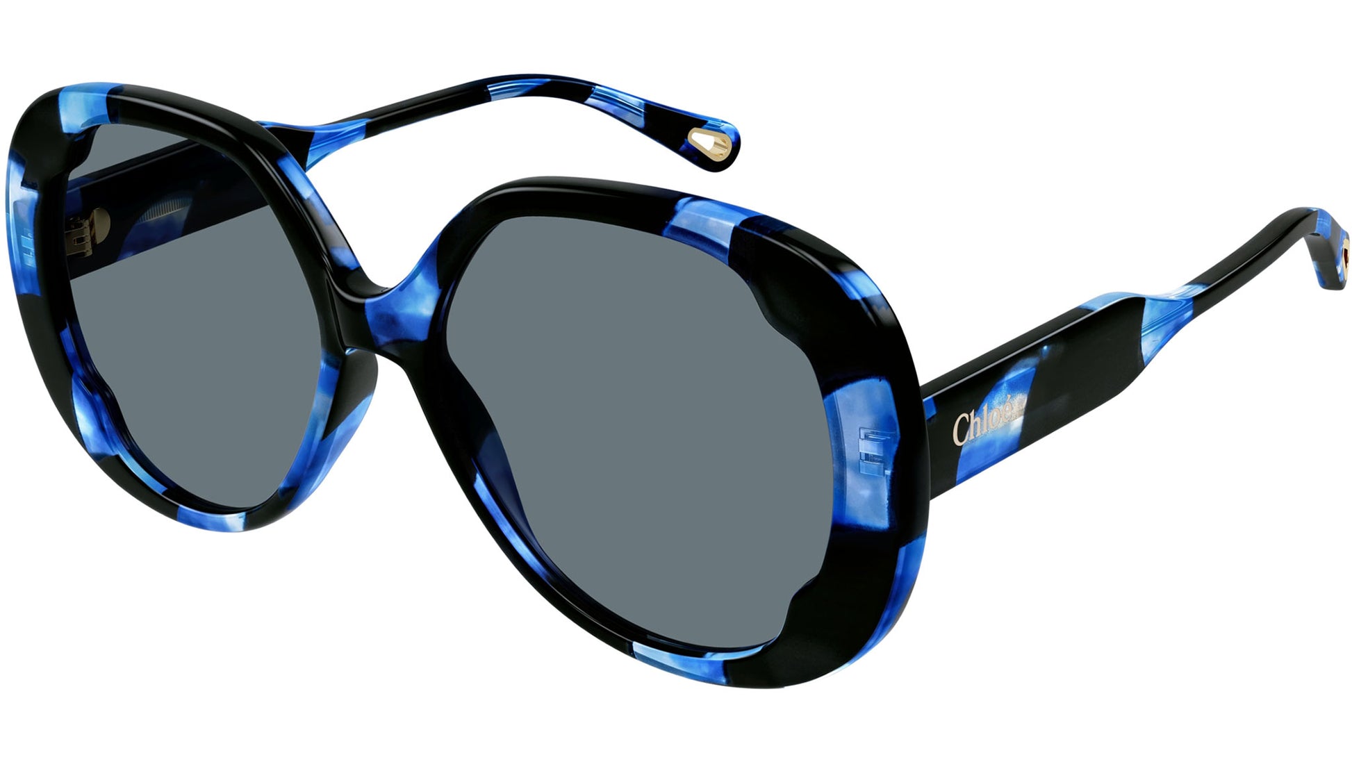 Chloé CH0195S 003 sunglasses for women, featuring shiny scalloped chloé havana black / blue butterfly recycled acetate frame and solid azure bio nylon lenses. Brand line: Chloé. Style code: CH0195S. Color code: 003. Made in Italy. Authorized Chloé online reseller. Your glasses will include the original case and accessories and are covered by a 12-month global warranty.
