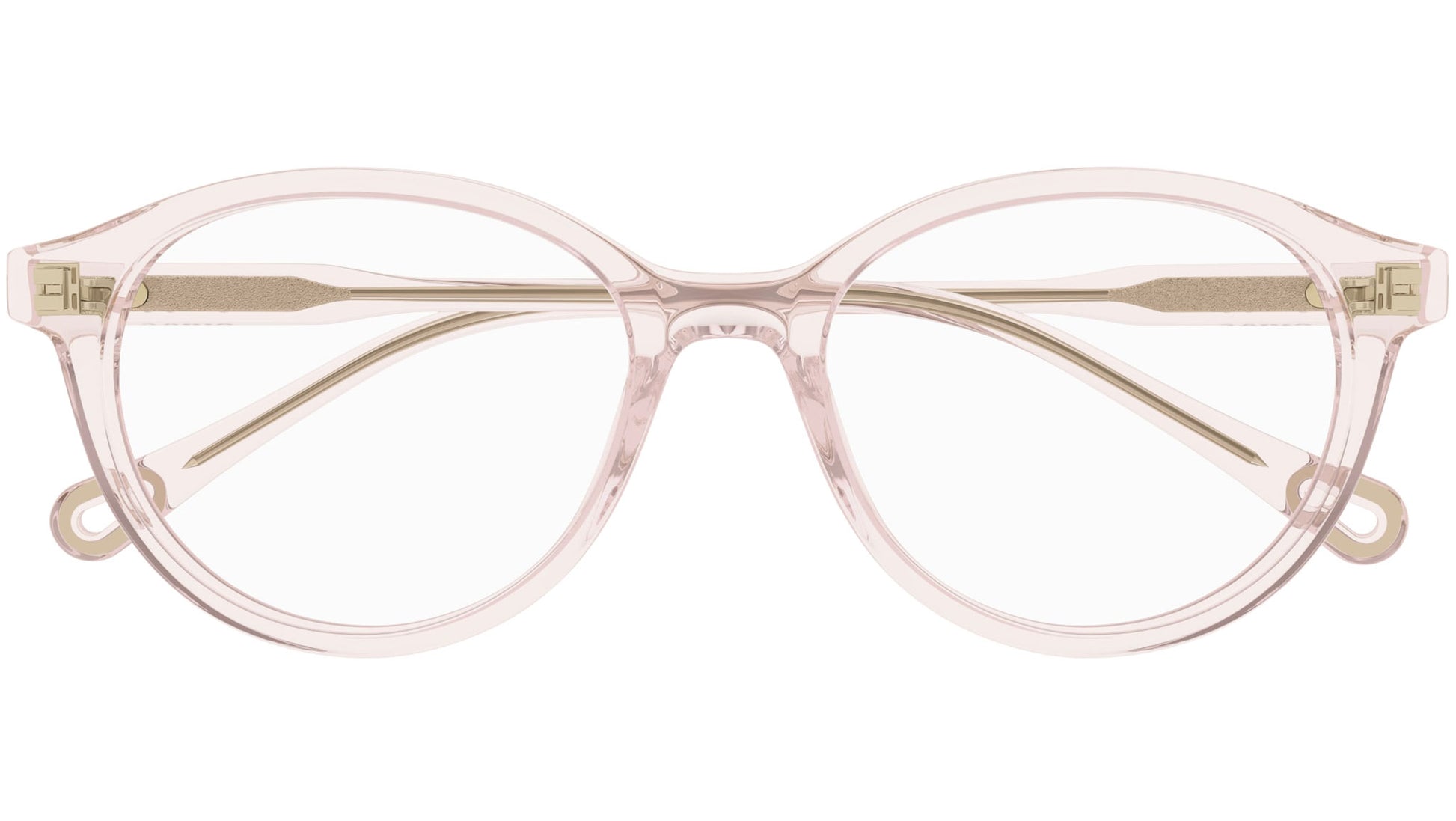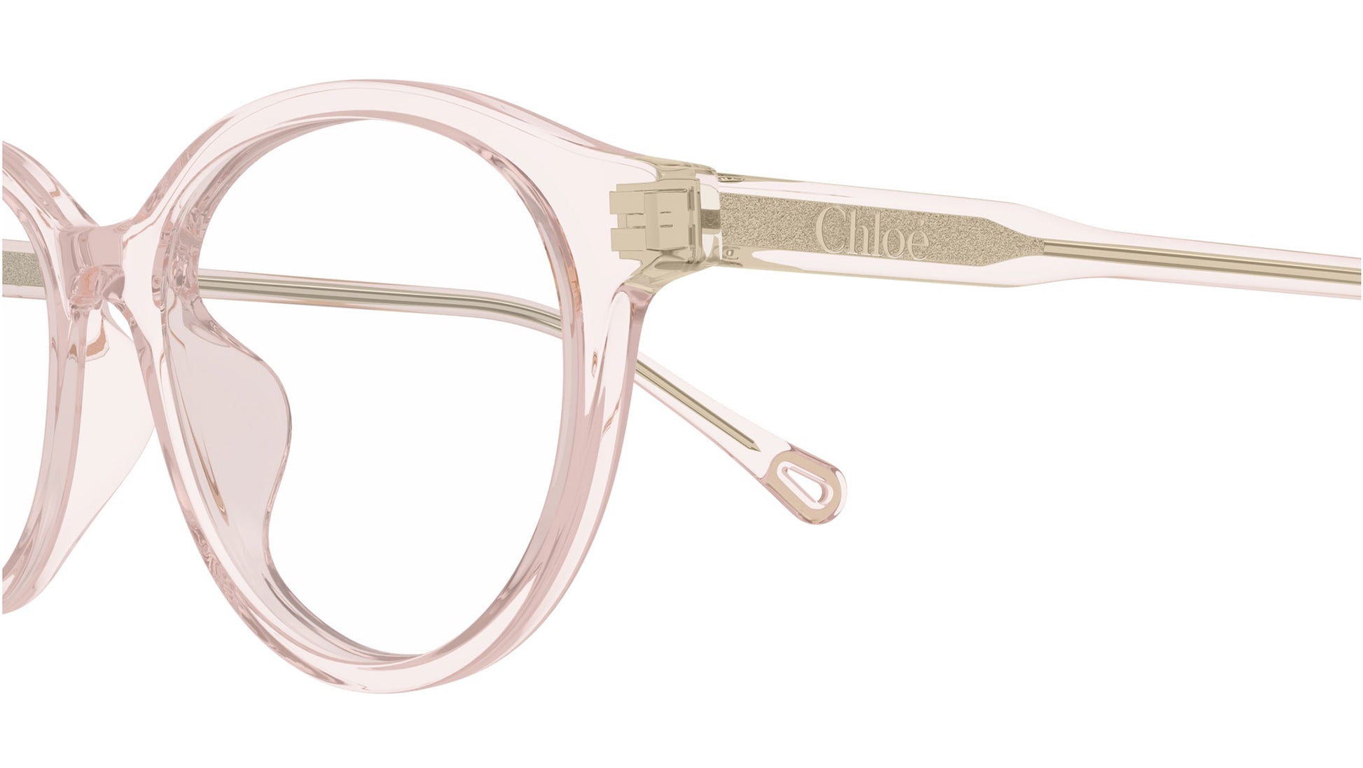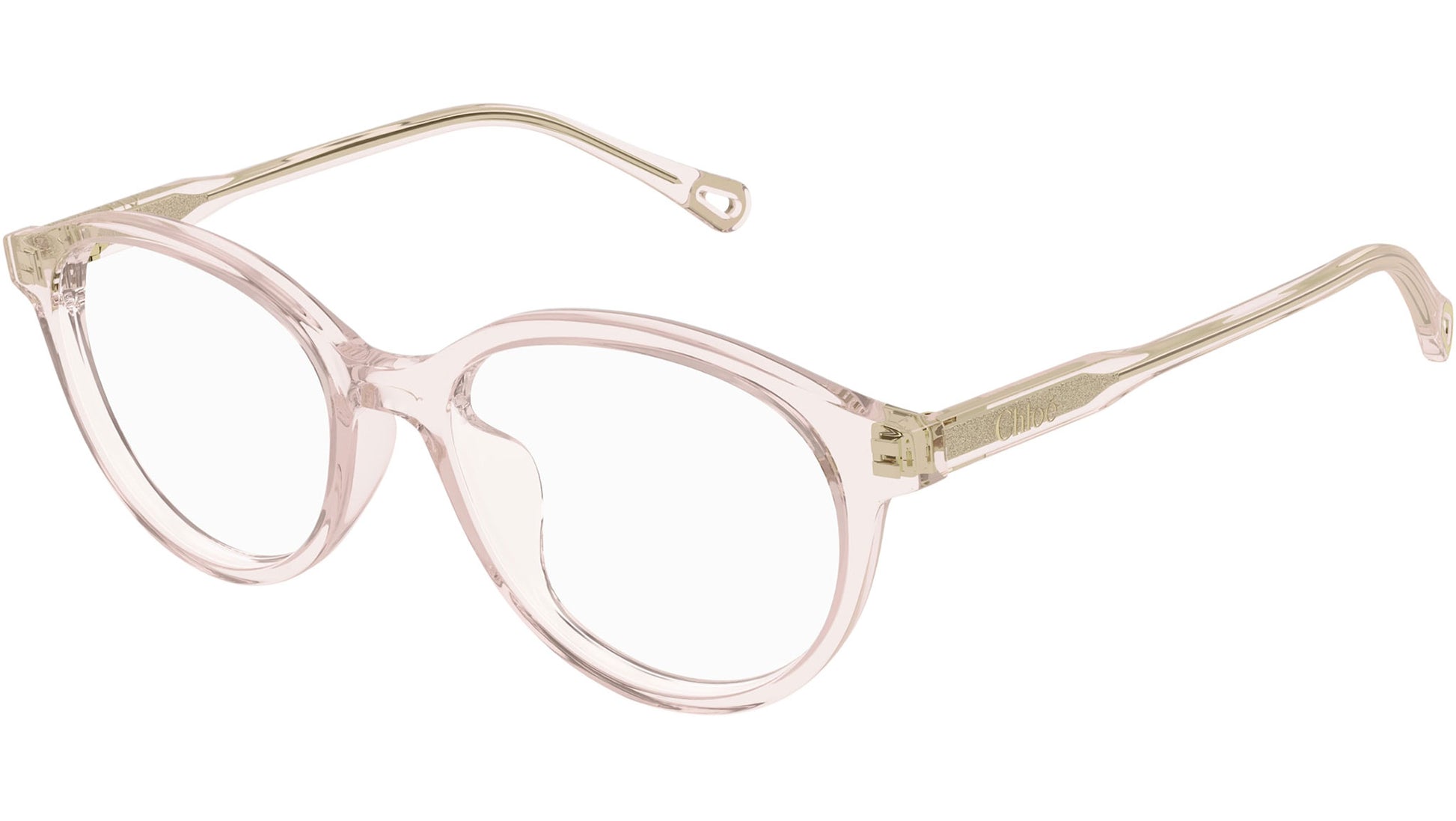 Chloé CH0316OA 004 glasses for women, featuring shiny transparent pink panthos recycled acetate frame and demo lenses. Brand line: Chloé. Style code: CH0316OA. Color code: 004. Made in Italy. Authorized Chloé online reseller. Your glasses will include the original case and accessories and are covered by a 12-month global warranty.