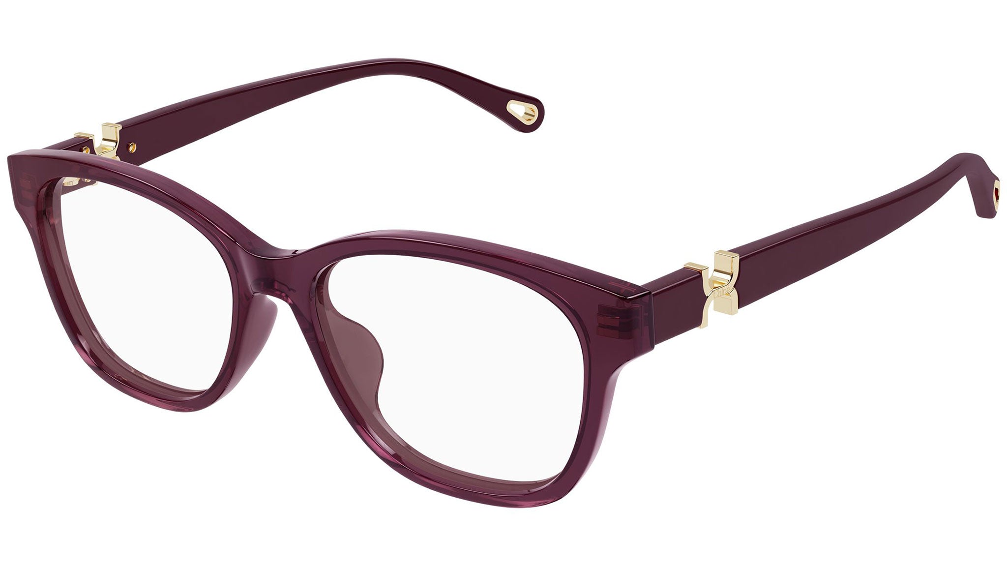 Chloé CH0336OA 005 glasses for women, featuring shiny transparent dark wine cat eye recycled acetate frame and demo lenses. Brand line: Chloé. Style code: CH0336OA. Color code: 005. Made in Japan. Authorized Chloé online reseller. Your glasses will include the original case and accessories and are covered by a 12-month global warranty.