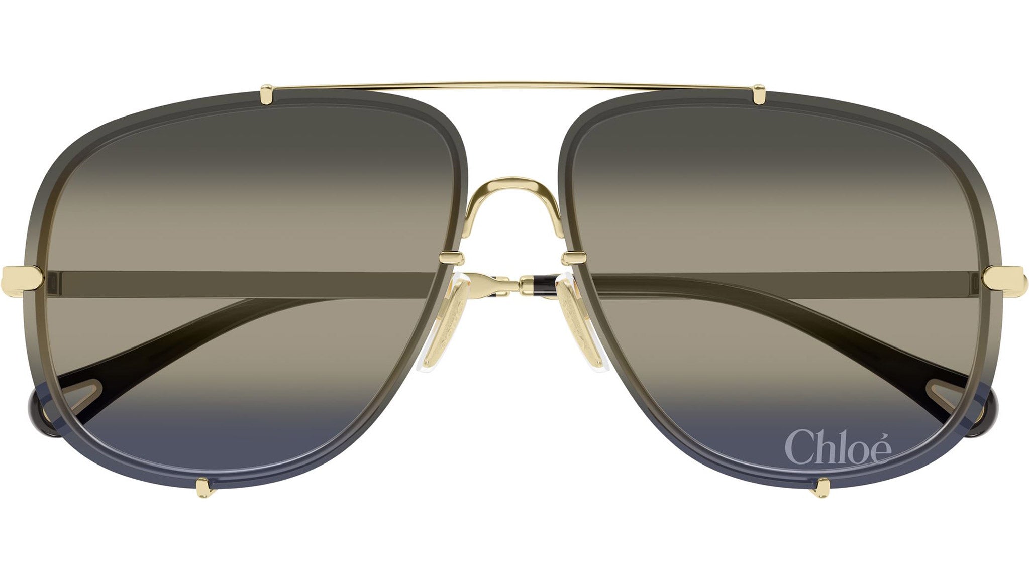 Chloé CH0348S 005 sunglasses for women, featuring shiny classic gold pilot metal frame and triple gradient blue / cream / dark green bio nylon lenses. Brand line: Chloé. Style code: CH0348S. Color code: 005. Made in Italy. Authorized Chloé online reseller. Your glasses will include the original case and accessories and are covered by a 12-month global warranty.