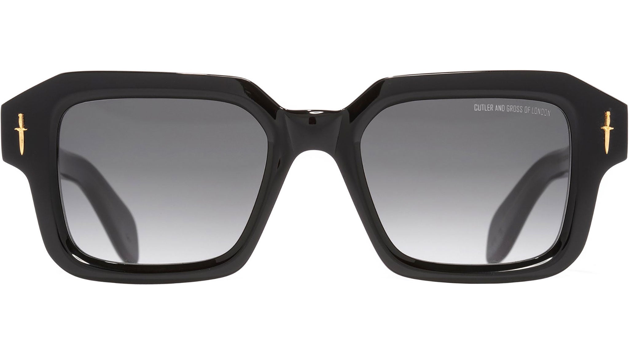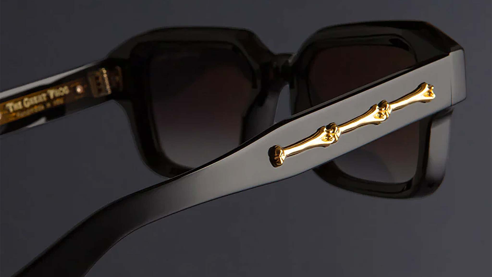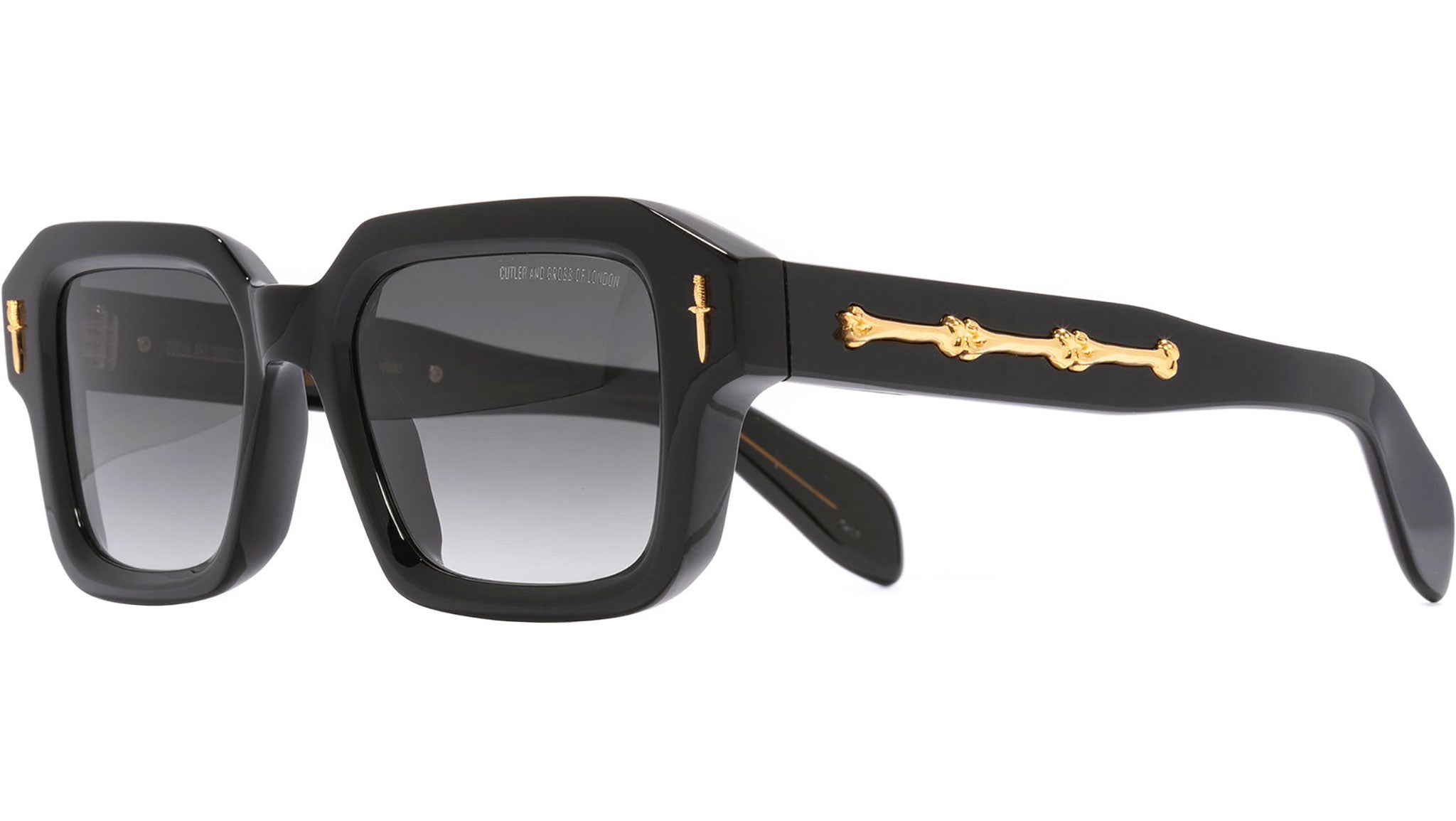 Cutler and Gross The Great Frog 005 O1 sunglasses for men and woman, featuring black gold bones link rectangular acetate frame and grey lenses. Brand line: The Great Frog. Style code: 005. Color code: O1. Authorized Cutler and Gross online reseller. Your glasses will include the original case and accessories and are covered by a 12-month global warranty.