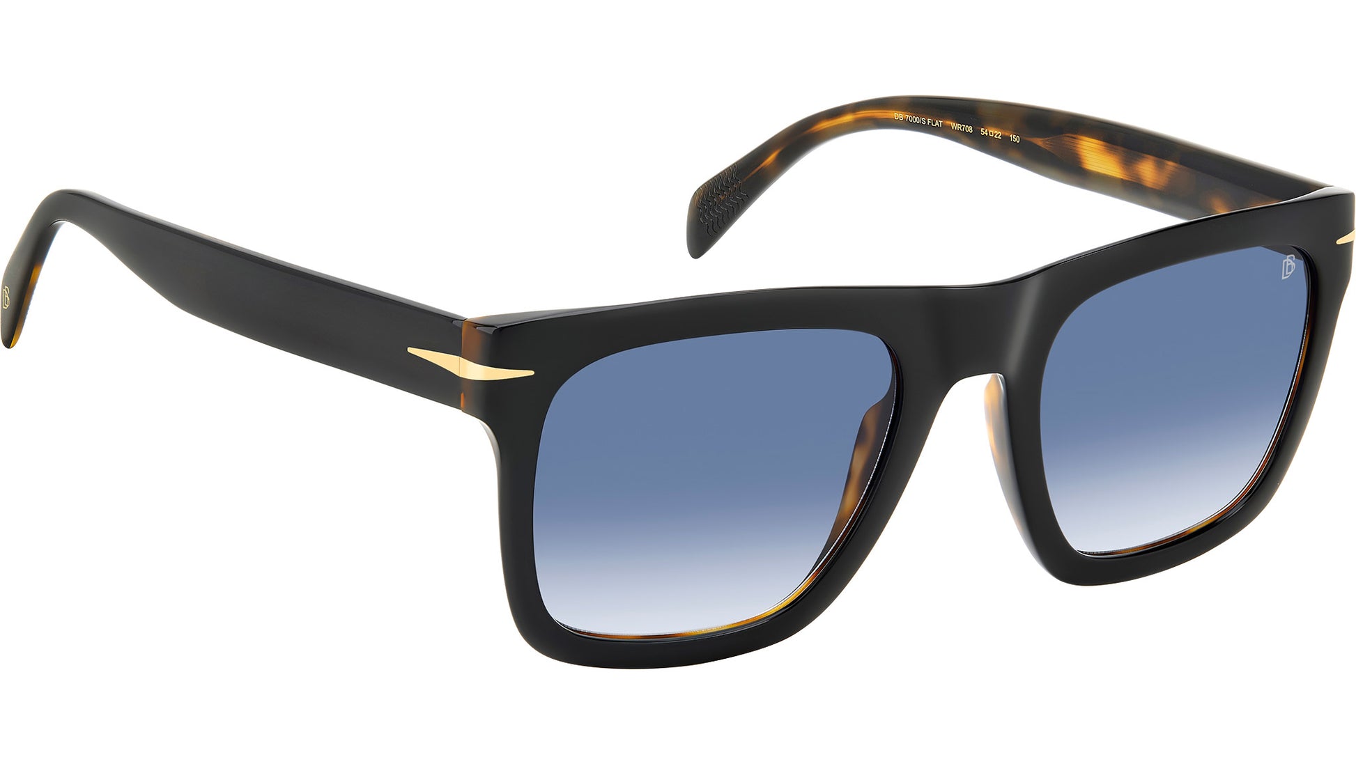 David Beckham DB 7000/S FLAT WR7 08 sunglasses for men, featuring black havana rectangular acetate frame and dark blue shaded lenses. The recognizable and seductive style of Eyewear by David Beckham is embodied in these iconic sunglasses, which are anything but ordinary. The bold acetate frame is characterized by notable yet flat volumes, which ensure a lightweight fit. The temples, which also come in a clear version with a visible wire core, are trimmed by the brand’s metal symbol and, on the inside, the full "by David Beckham" signature. These glasses can be fitted with prescription lenses. Brand line: Style Pioneer. Style code: 206608. Color code: WR7 08. Authorized David Beckham online reseller. Your glasses will include the original case and accessories and are covered by a 12-month global warranty.