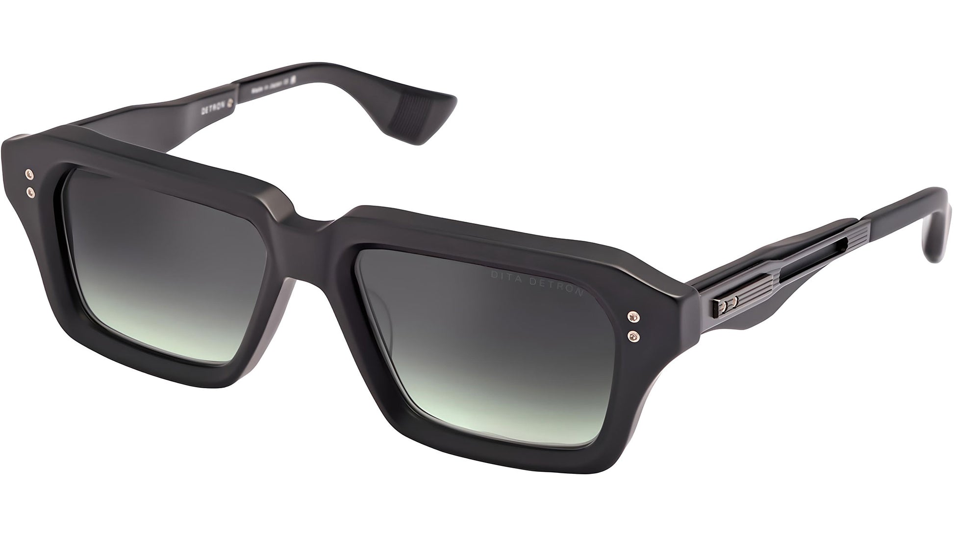 Dita Detron 02 sunglasses for men and woman, featuring matte black / black iron rectangular acetate-titanium frame and demo lenses. The DETRON features a sophisticated rectangular acetate frame complemented by the unique HAKATRON temple, which incorporates an acetate base with a dual titanium temple plate that showcases meticulously pressed line detailing and contrasting finishes. This model is available in three striking color combinations: Black - Yellow Gold, Matte Black - Black Iron, and Khaki Crystal - Silver. Key specifications include a high-quality Japanese acetate frame, a custom oversized titanium 3-barrel hinge plate with enamel inlay, proprietary titanium hex screws, and lenses that offer 100% UVA and UVB protection with an anti-reflective coating. Each pair is hand-finished in Japan, ensuring exceptional quality and craftsmanship. Brand line: Dita. Style code: DTS459. Color code: 02. Authorized Dita online reseller. Your glasses will include the original case and accessories and are covered by a 12-month global warranty.