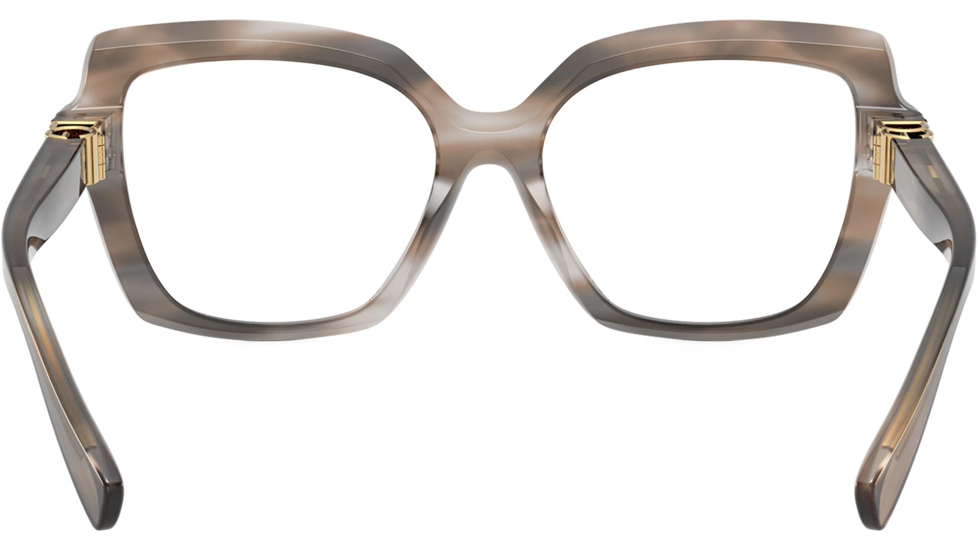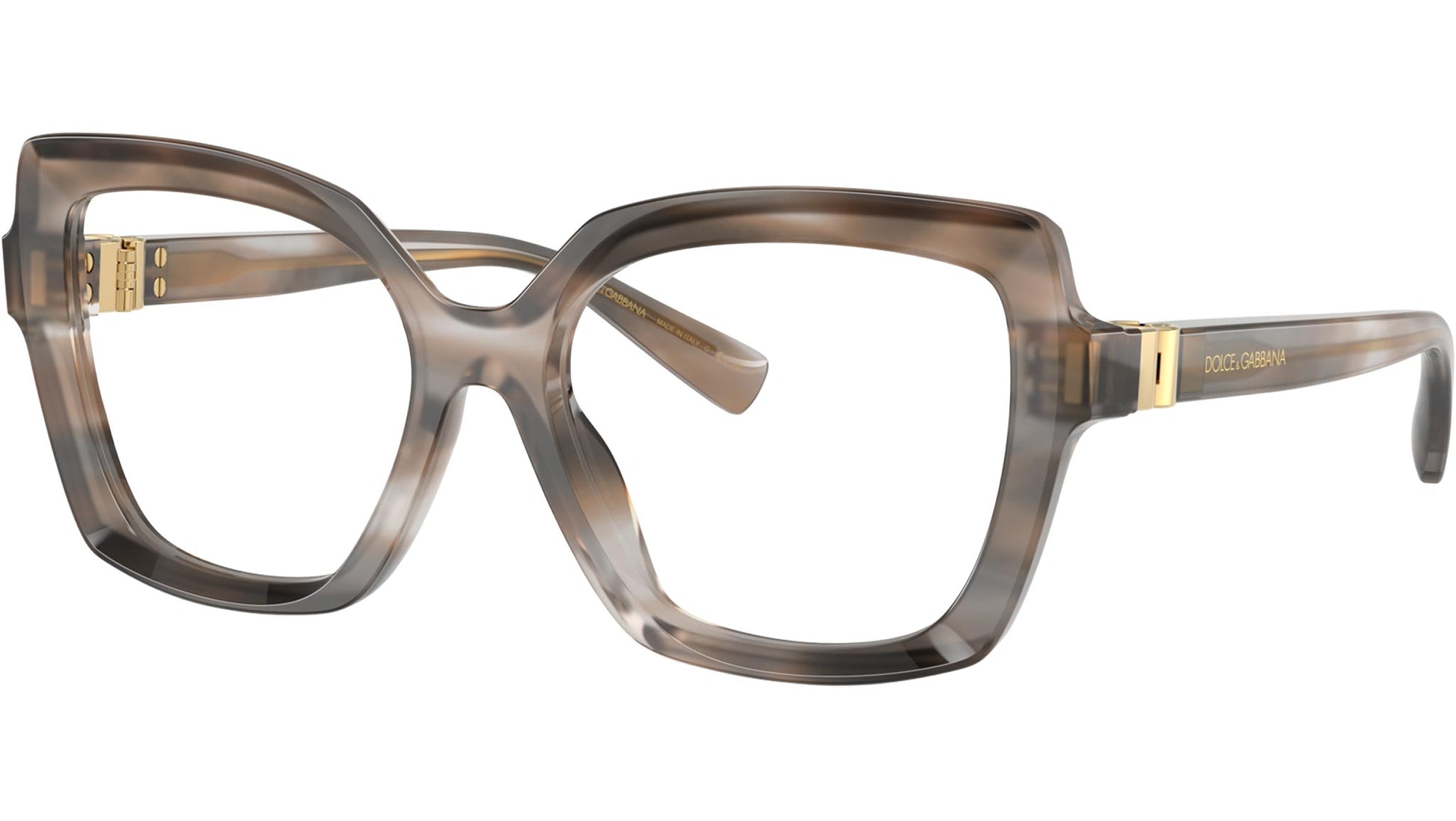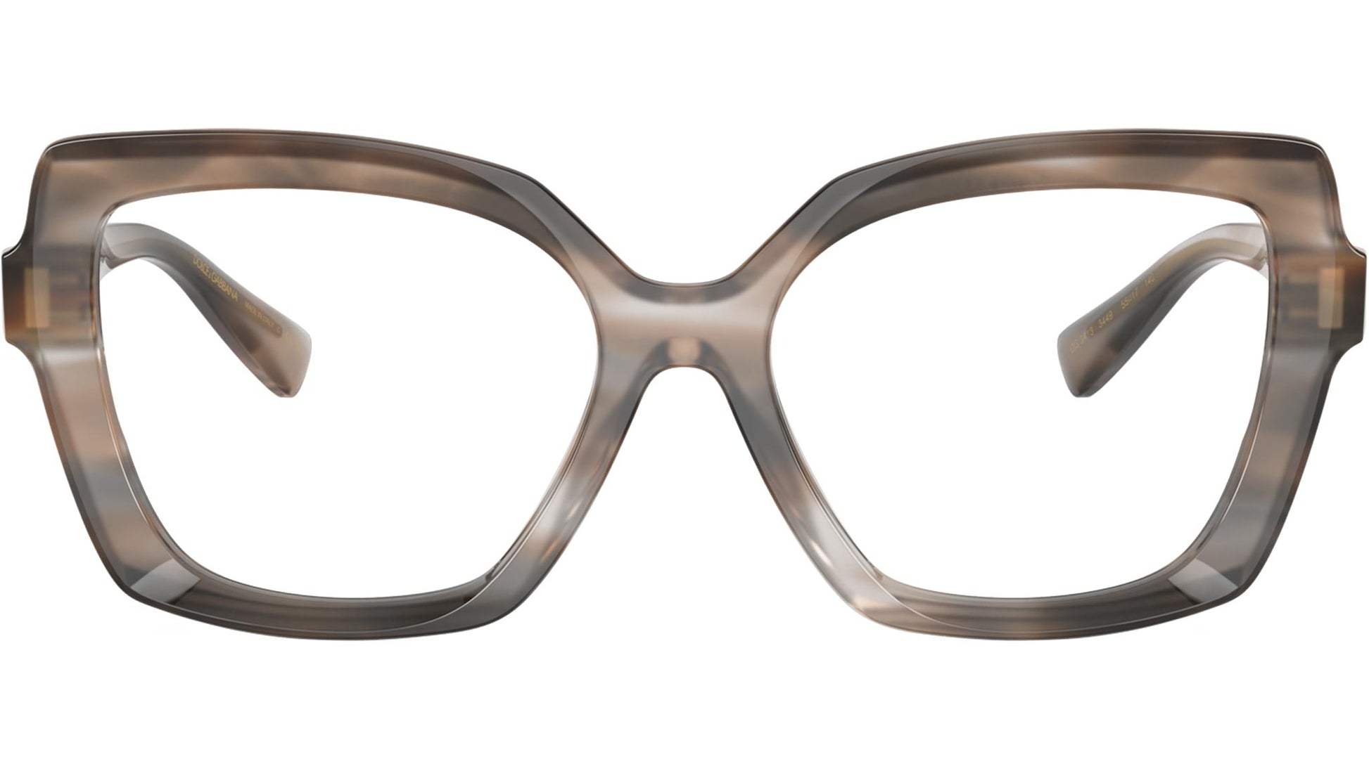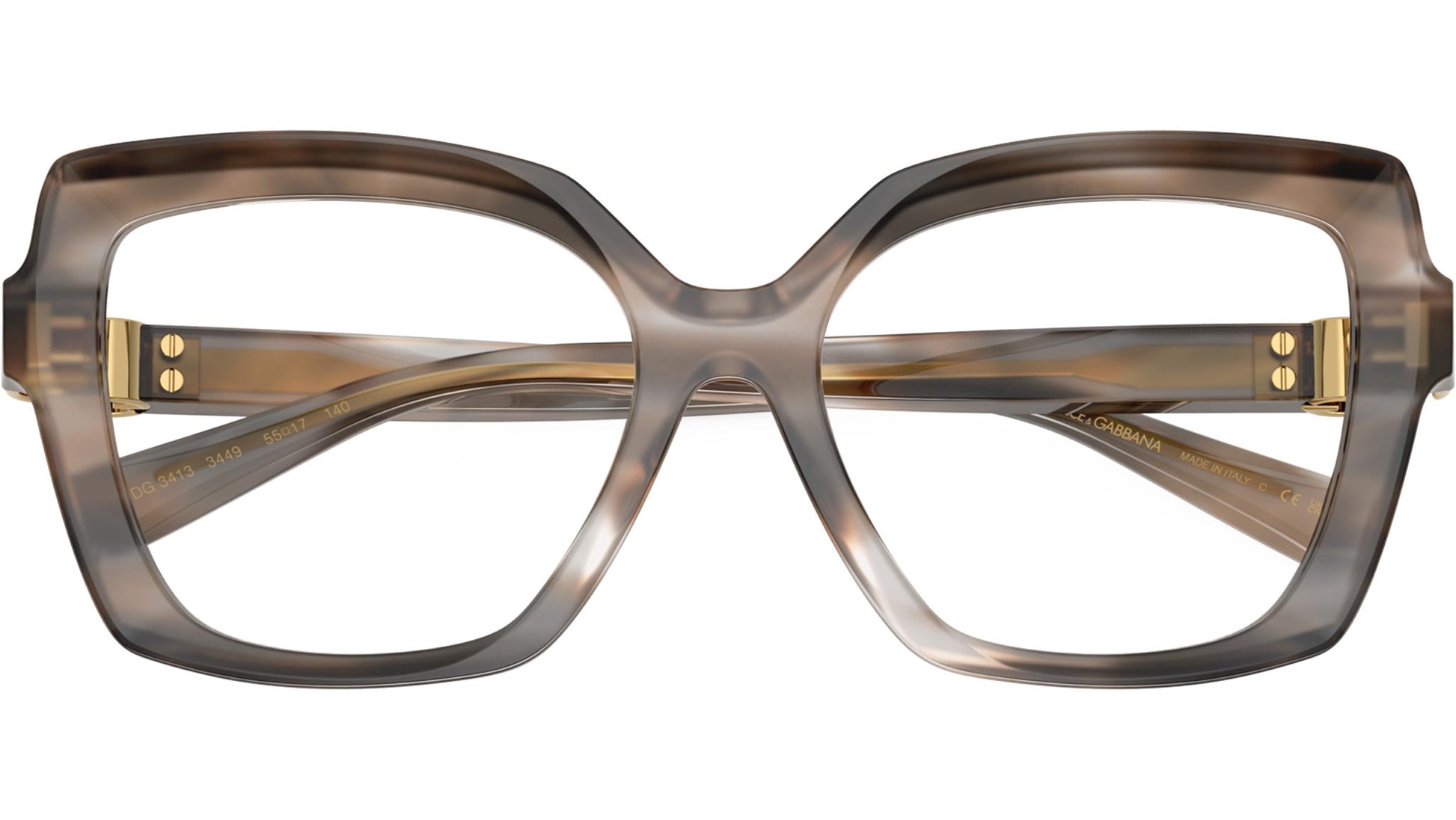 Dolce & Gabbana DG 3413 3449 glasses for women, featuring striped grey butterfly acetate frame and demo lens. Universal fit. Brand line: Dna. Style code: 0DG3413. Color code: 3449. Made in Italy. Authorized Dolce & Gabbana online reseller. Your glasses will include the original case and accessories and are covered by a 12-month global warranty.
