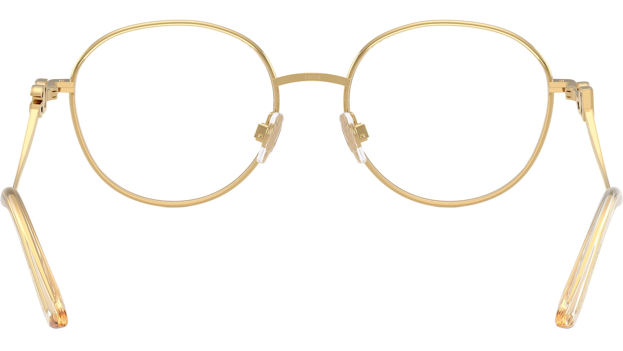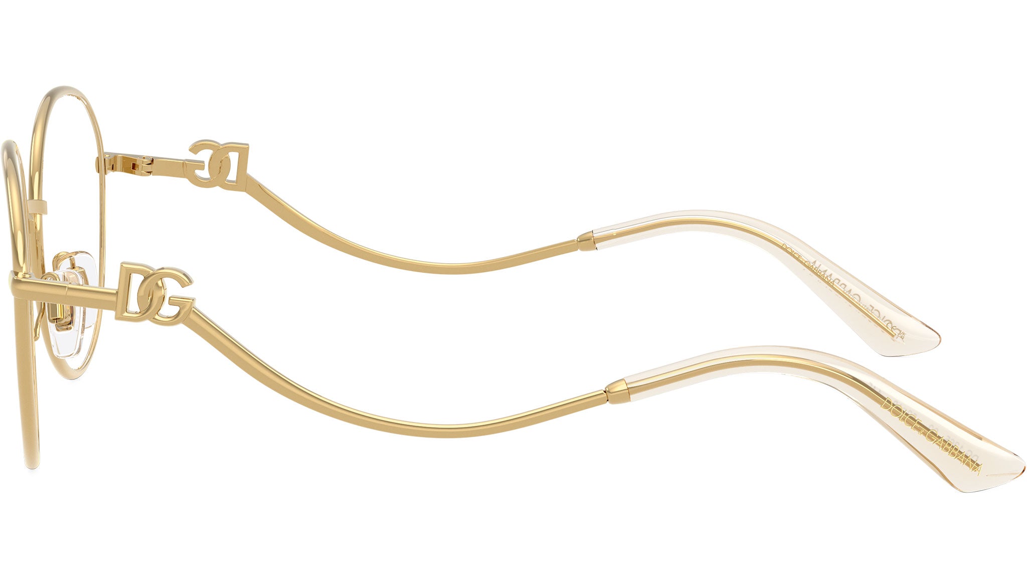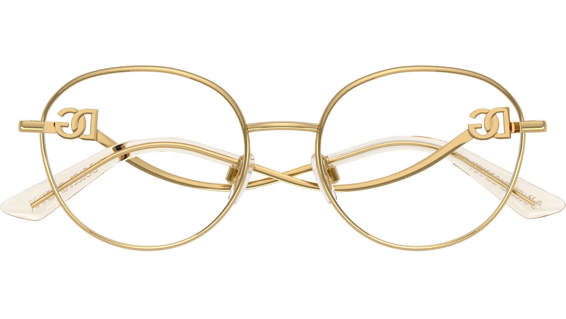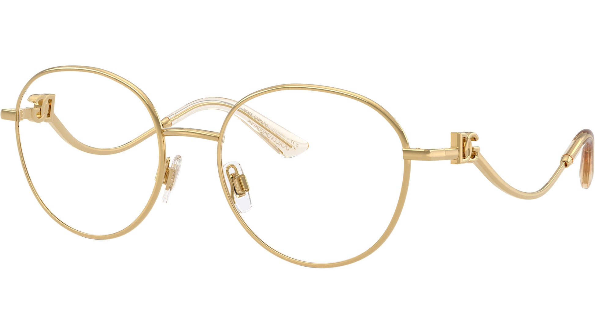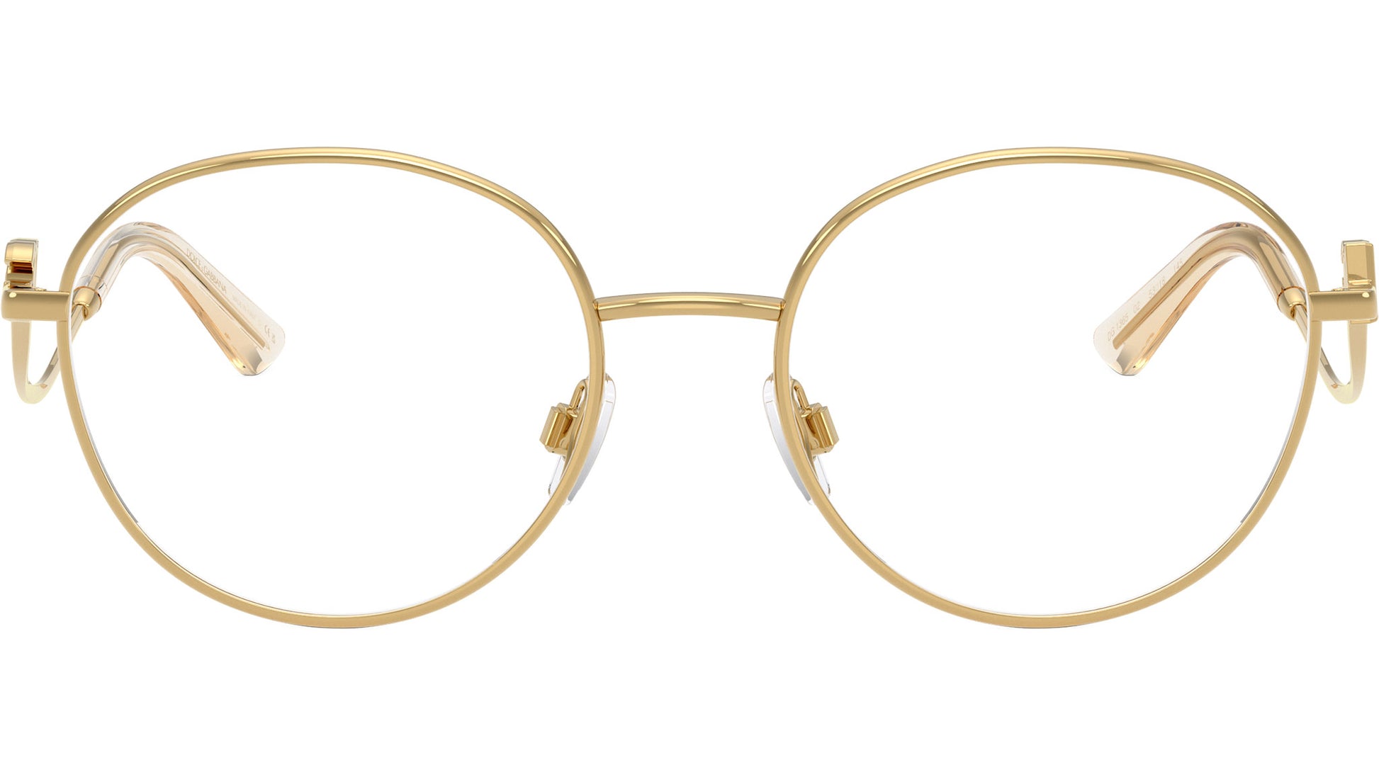 Dolce & Gabbana DG 1365 02 glasses for women, featuring gold round metal frame and demo lens. Adjustable nosepads. Brand line: Statement. Style code: 0DG1365. Color code: 02. Made in Italy. Authorized Dolce & Gabbana online reseller. Your glasses will include the original case and accessories and are covered by a 12-month global warranty.