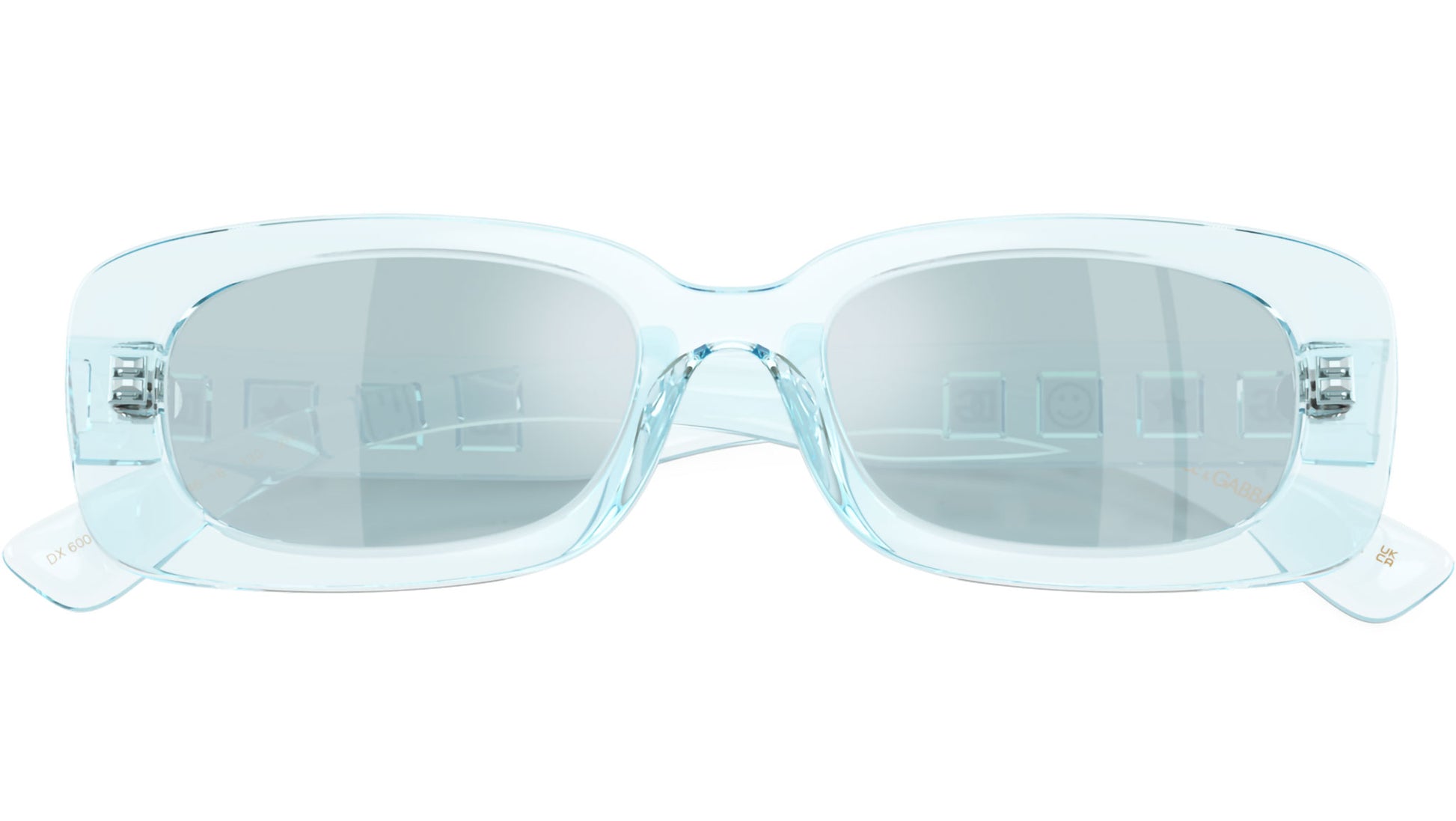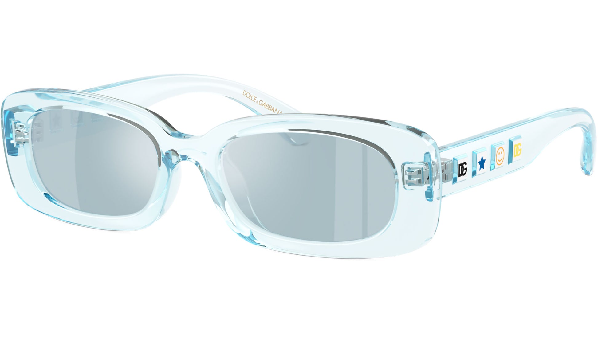 Dolce & Gabbana Kids DX 6006U 33466J sunglasses, featuring transparent azure rectangular injection frame and blue mirror white polycarbonate lenses. Universal fit. Brand line: Dna. Style code: 0DX6006U. Color code: 33466J. Made in Italy. Authorized Dolce & Gabbana Kids online reseller. Your glasses will include the original case and accessories and are covered by a 12-month global warranty.