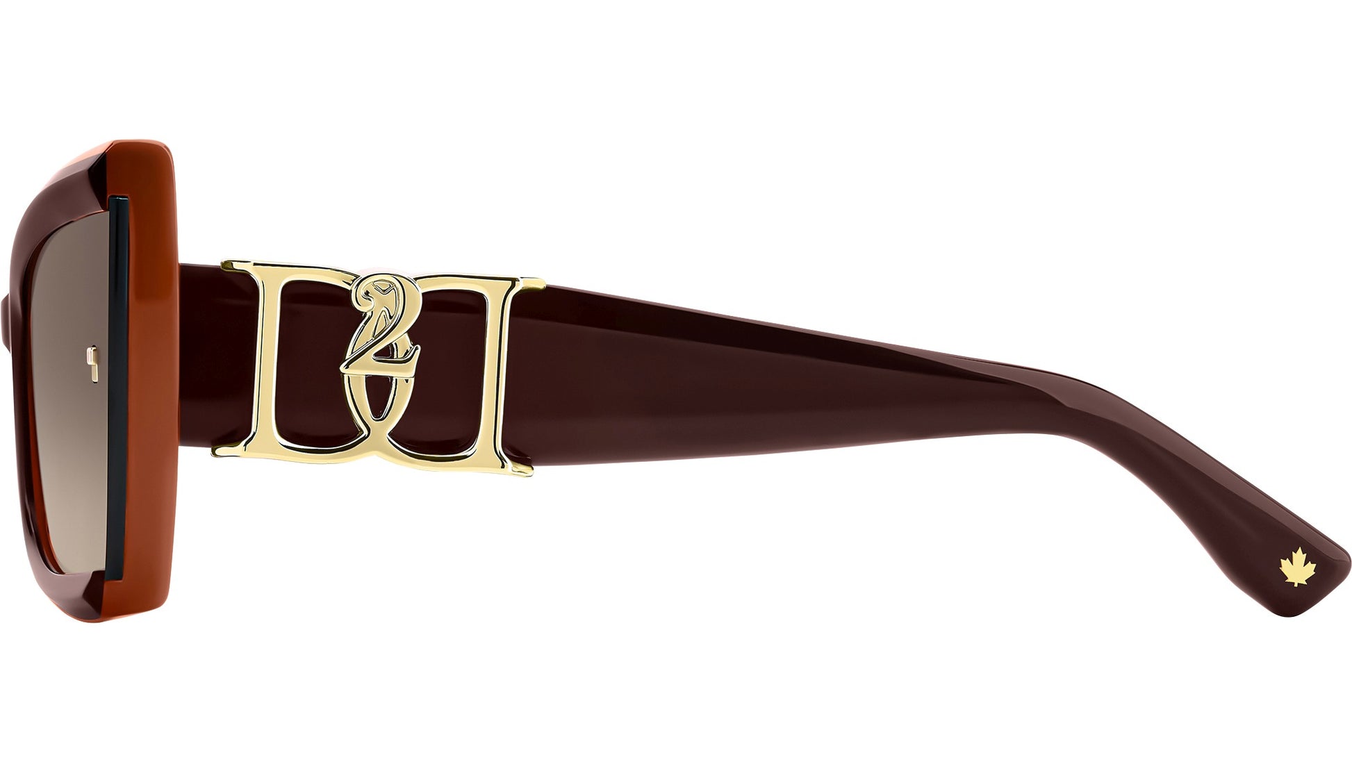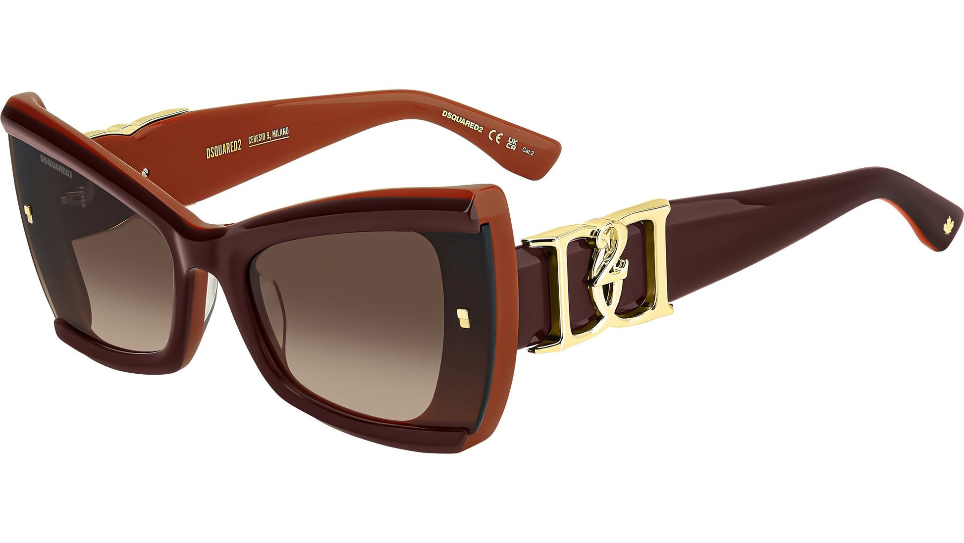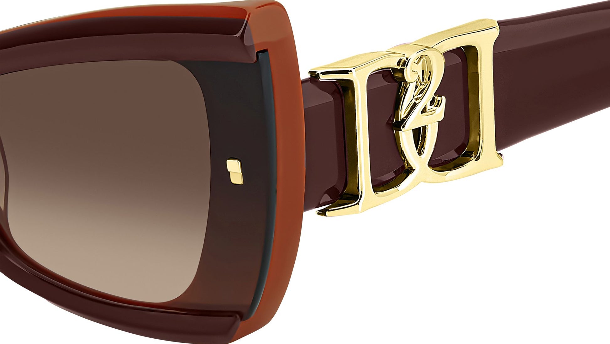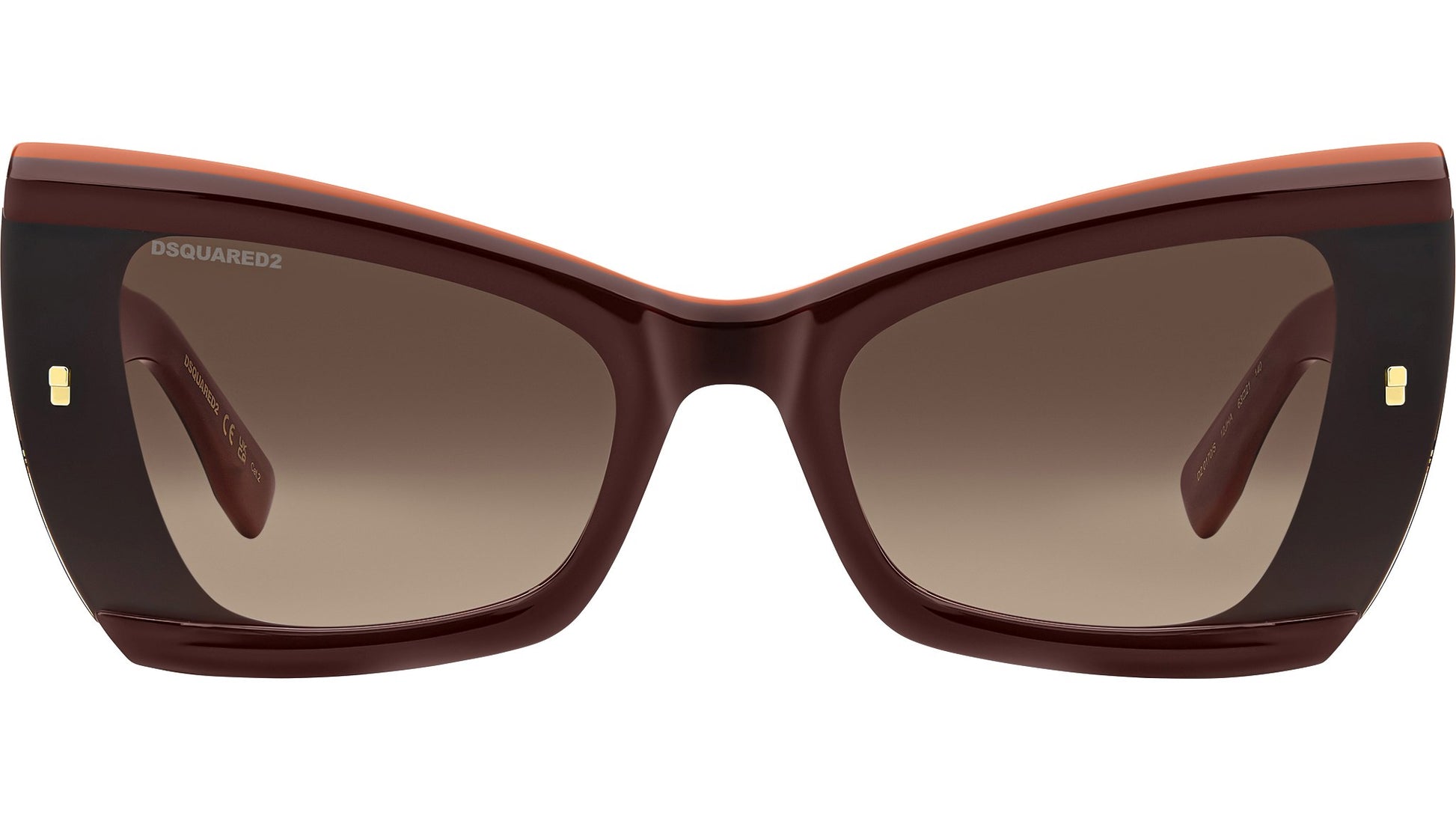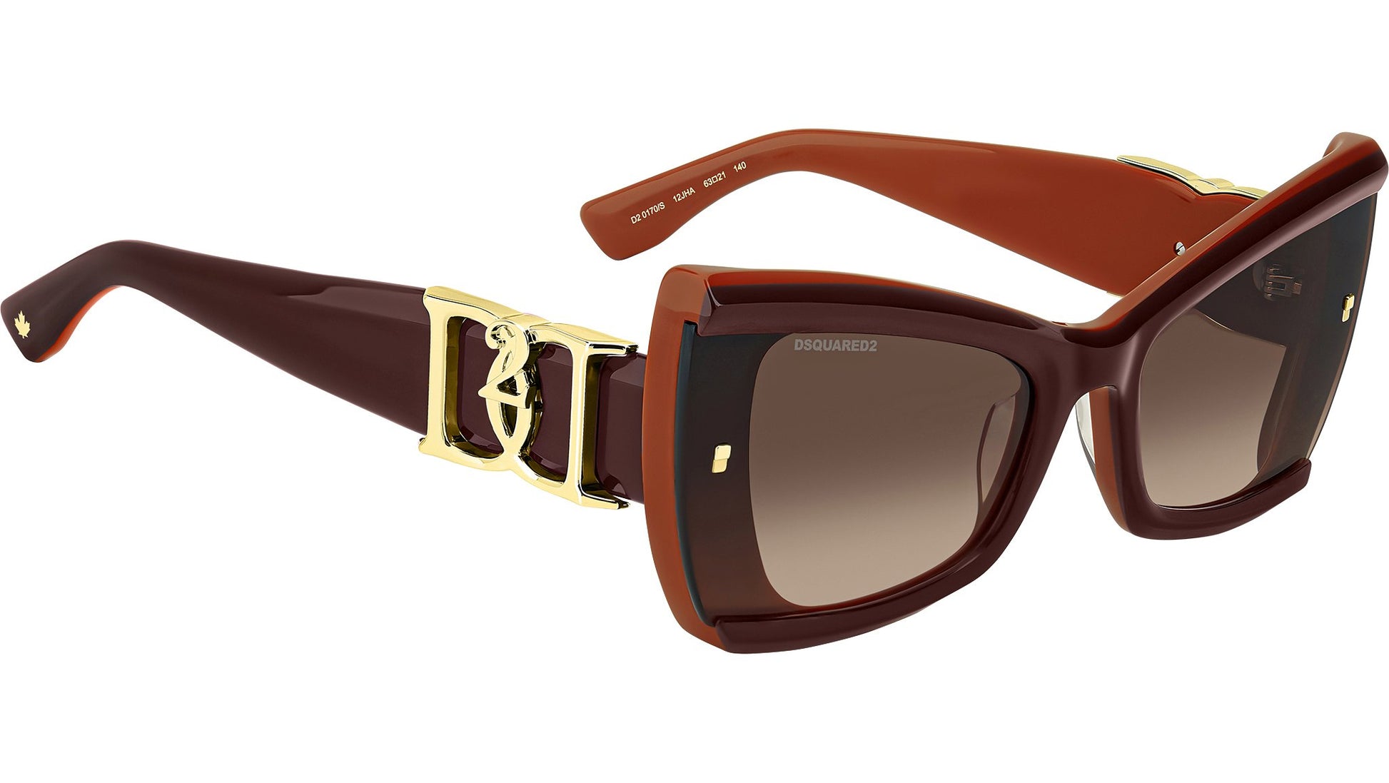 Dsquared2 D2 0170/S 12J HA sunglasses for women, featuring brown orange butterfly acetate frame and brown shaded lenses. These Dsquared2 sunglasses for women are finely detailed and sculpted. The frames are a masterpiece of design: decisively bold, they feature full volumes, lenses which are left open at the sides, and square rivets in metal. The new intertwined ‘D’ logo embraces the temples, set like a metal jewel onto their surface. This style comes in a heat-moulded version composed of two layers of acetate with contrast finishes. Brand line: Hype. Style code: 207906. Color code: 12J HA. Authorized Dsquared2 online reseller. Your glasses will include the original case and accessories and are covered by a 12-month global warranty.