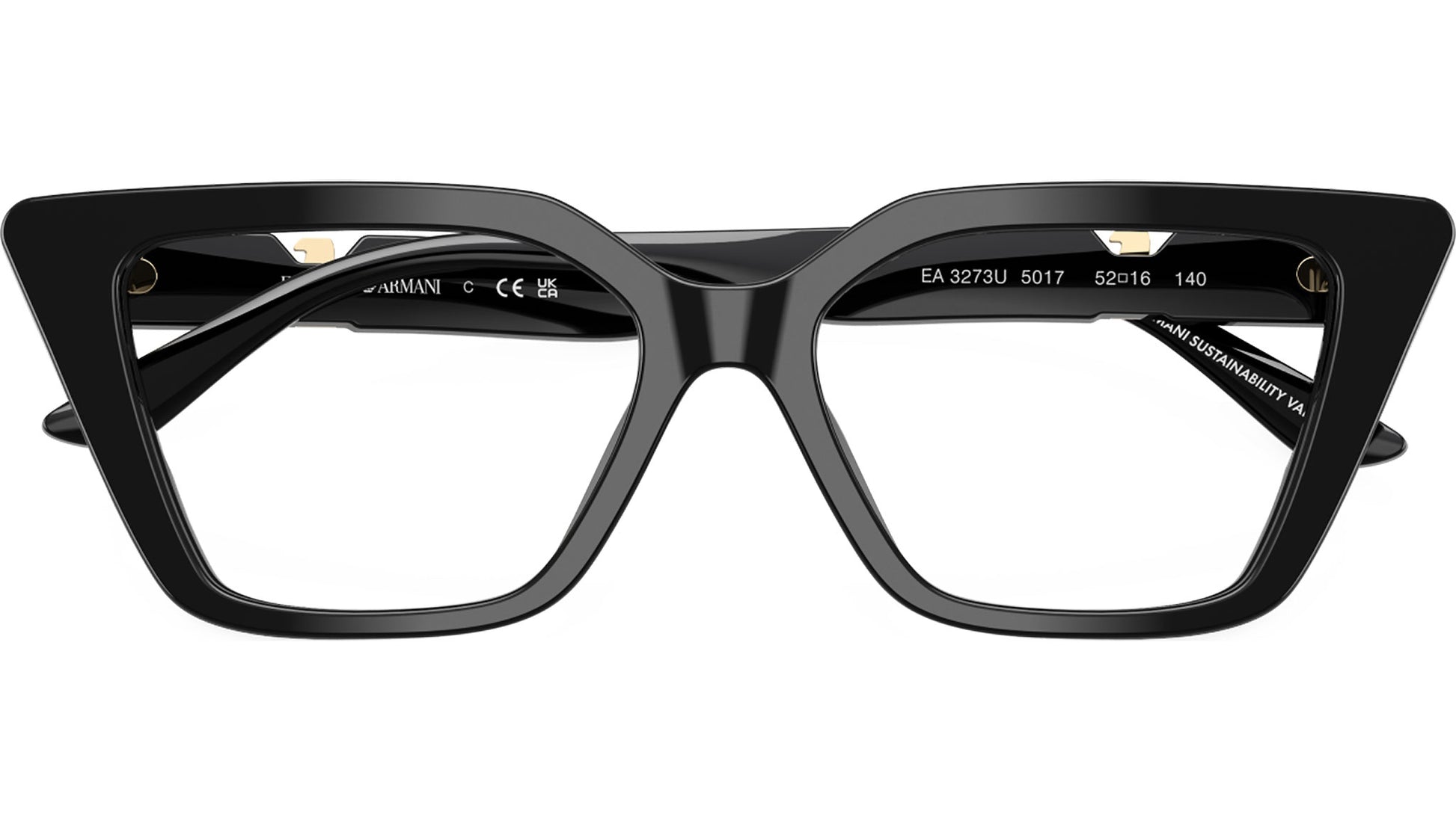 Emporio Armani EA3273U 5017 glasses, featuring shiny black cat eye acetate frame and demo lenses. Universal fit. Brand line: Modern. Style code: 0EA3273U. Color code: 5017. Authorized Emporio Armani online reseller. Your glasses will include the original case and accessories and are covered by a 12-month global warranty.