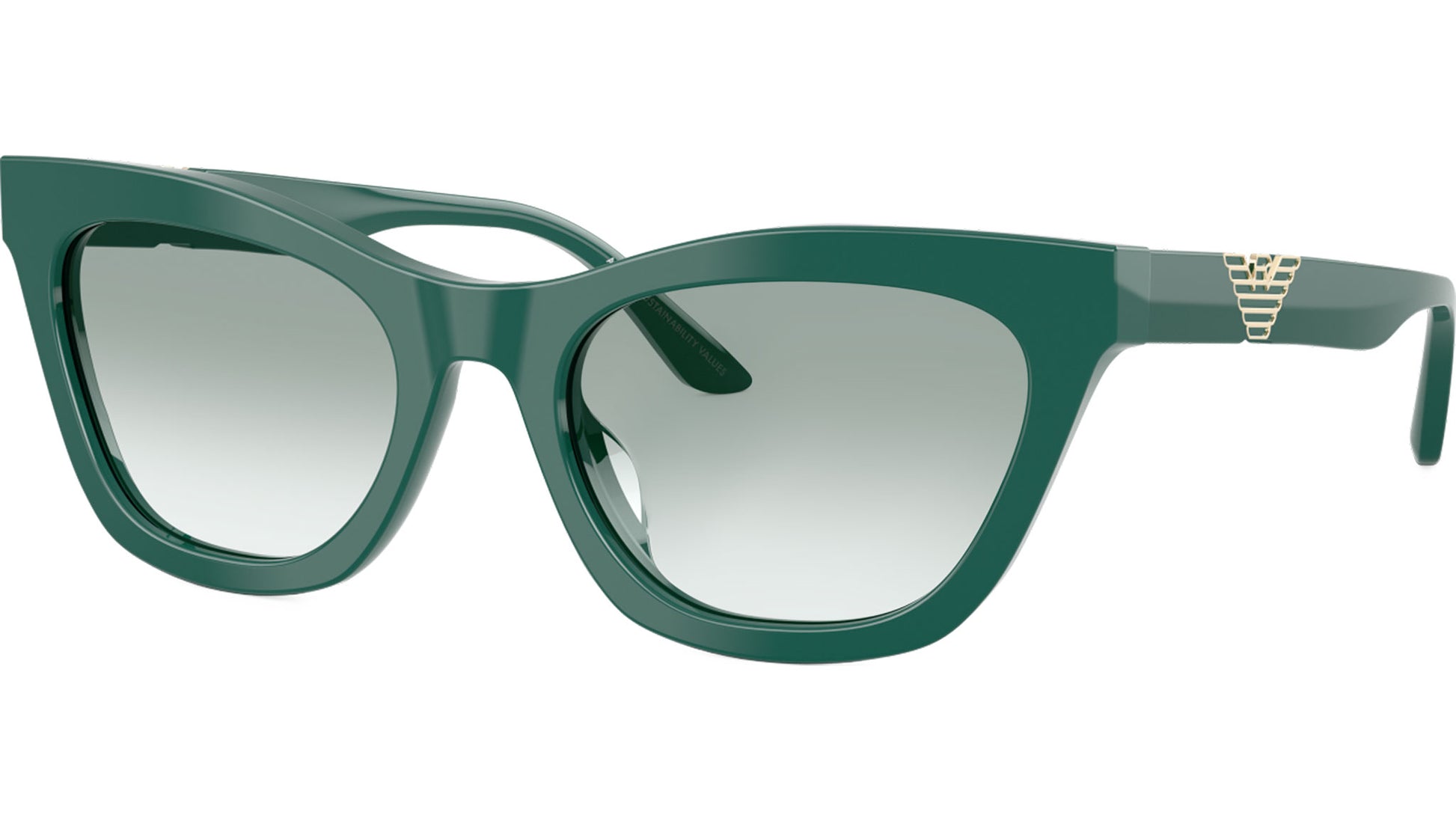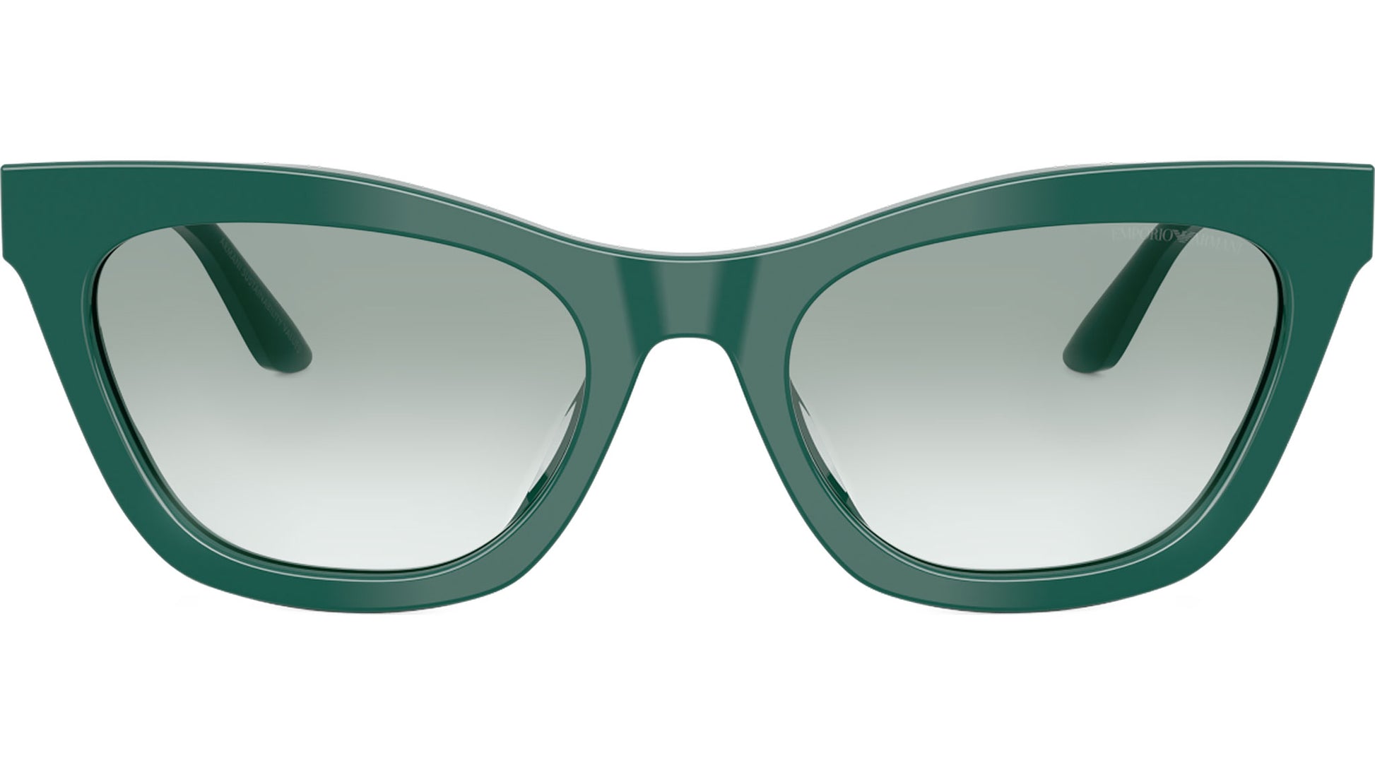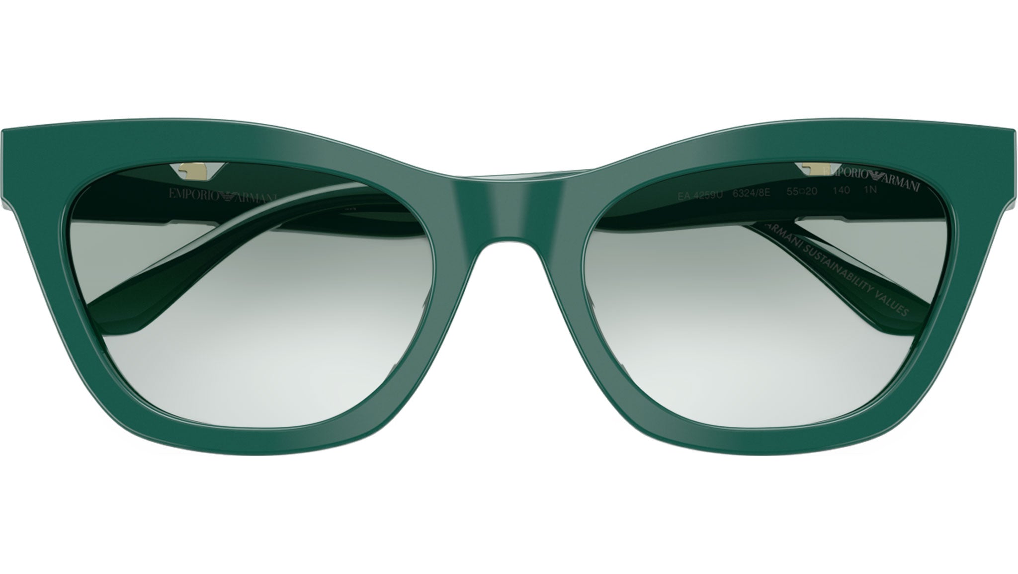 Emporio Armani EA4259U 63248E sunglasses, featuring shiny green cat eye acetate frame and clear gradient green bio polyamide lenses. Universal fit. Brand line: Modern. Style code: 0EA4259U. Color code: 63248E. Authorized Emporio Armani online reseller. Your glasses will include the original case and accessories and are covered by a 12-month global warranty.
