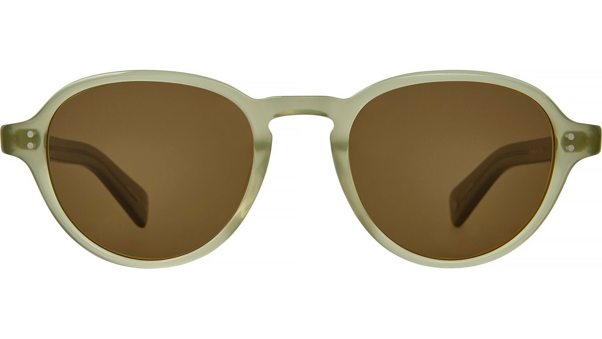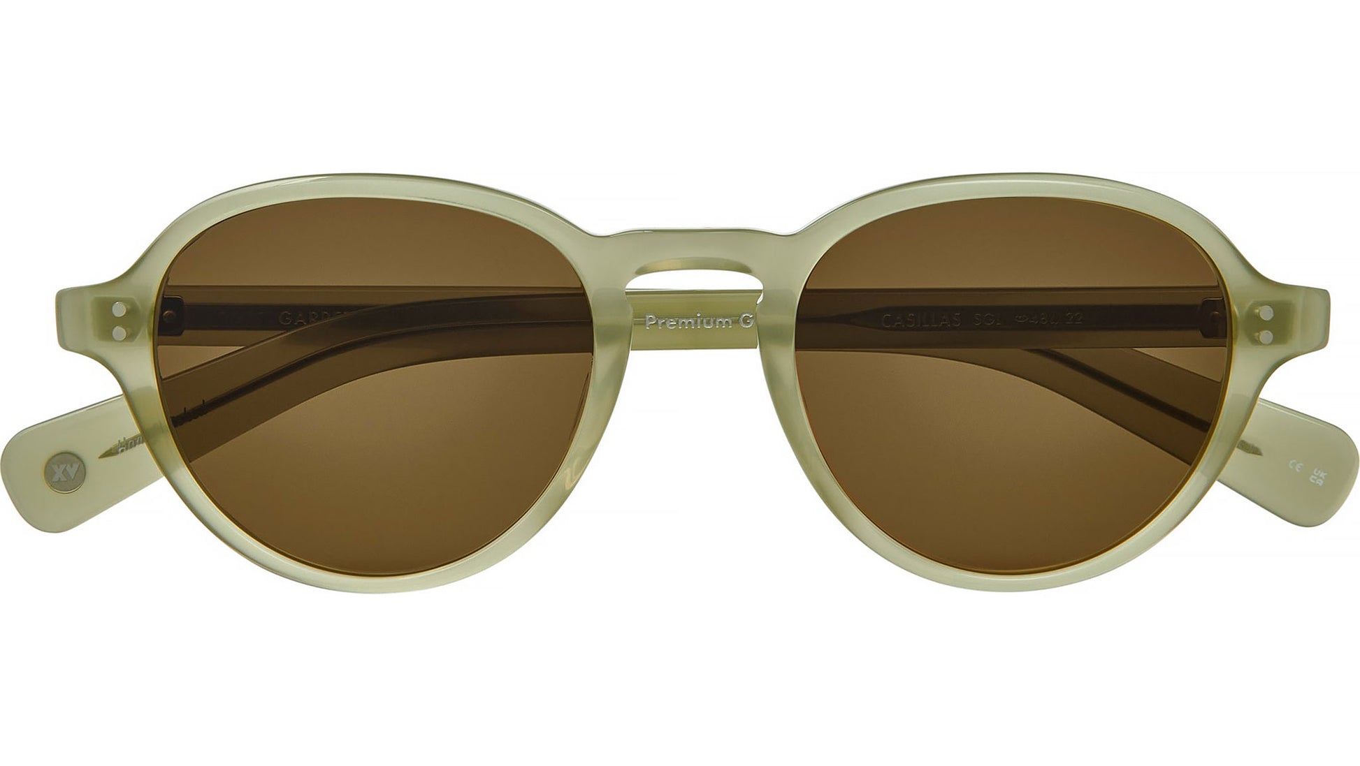 Garrett Leight Casillas sunglasses featuring sea glass round acetate frame and semi-flat pure coffee lenses. The Garrett Leight Casillas Sun is a refined unisex classic featuring a subtle teardrop lens shape and balanced proportions that offer timeless versatility. Hand-finished in Japan from cured cellulose acetate, it incorporates the signature GLCO core wire for structure and durability, along with dual-plated rivet hinges and vertical polished pins for an elevated touch. Premium glass lenses provide 100% UV protection, while paddle temples ensure a secure and comfortable fit. This elegant frame is accompanied by a GLCO soft case and cleaning cloth in seasonal colors and designs. Brand line: GLCO. Style code: 2172. Color code: SGL/SFPCOF. Authorized Garrett Leight online reseller. Your glasses will include the original case and accessories and are covered by a 12-month global warranty.