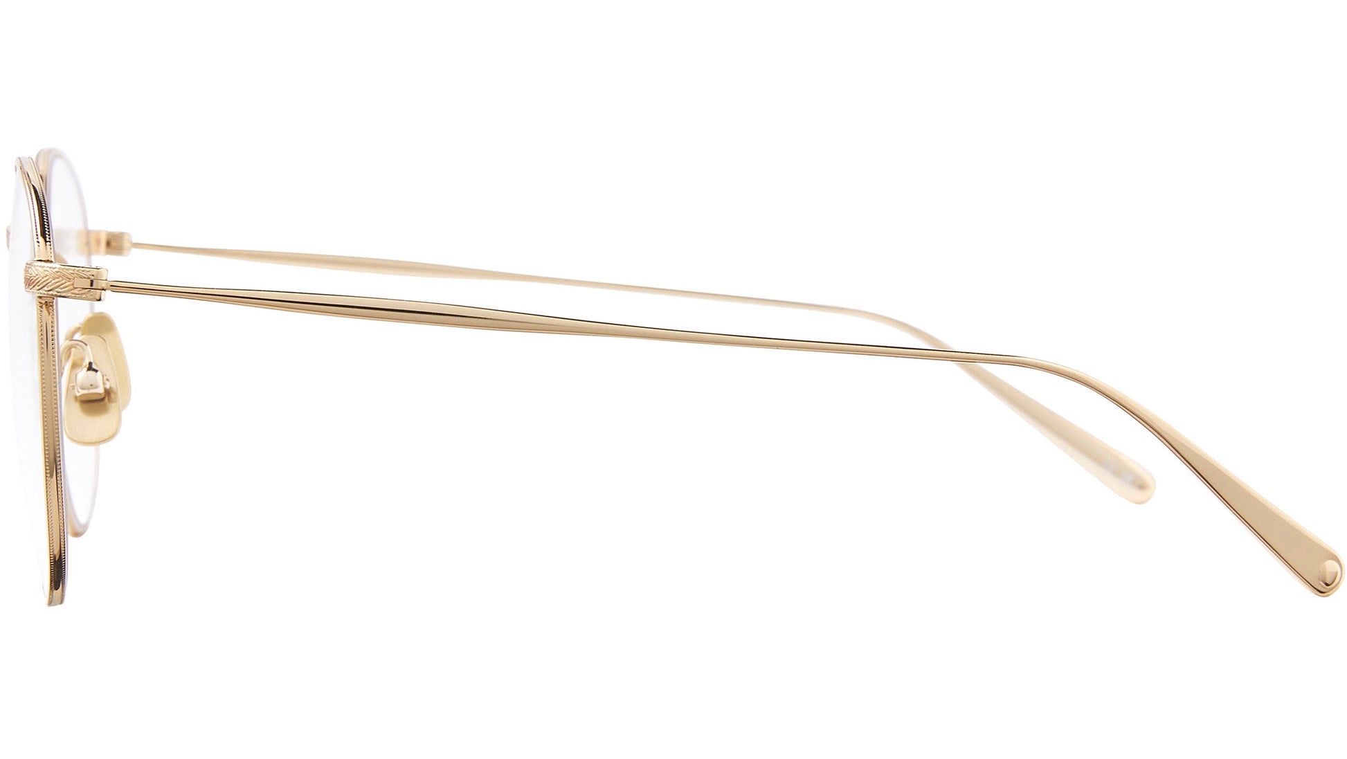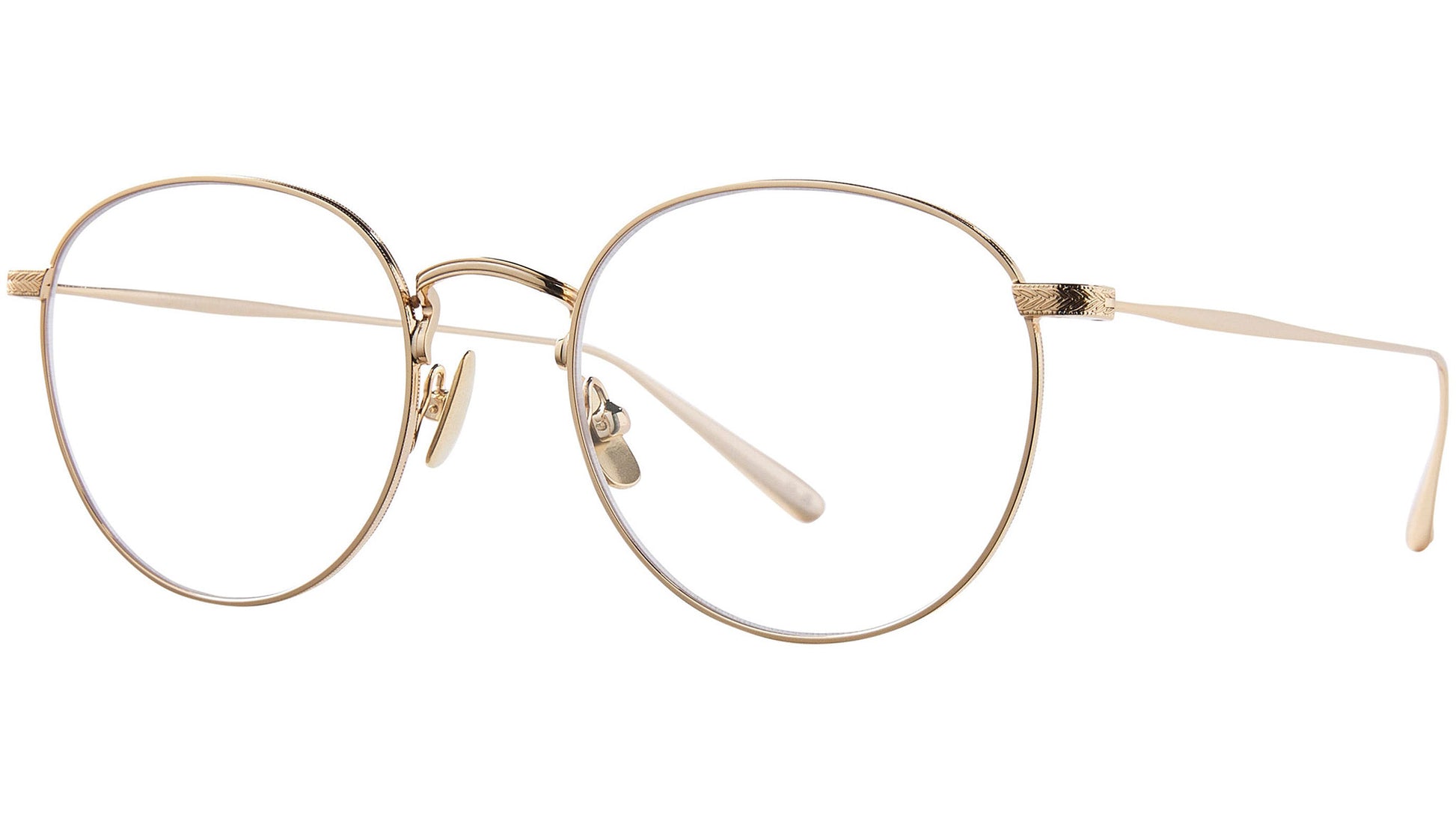 Garrett Leight Morningside M glasses featuring gold round metal frame and demo lens lenses. The Morningside M is a sophisticated rendition of the oversized round style, featuring an ultra-thin metal frame complemented by custom-etched braid endpieces and coin edge eye rim filigree. Titanium nose pads enhance comfort and durability, ensuring a superior fit. Equipped with optical quality CR-39 lenses, the design includes a 4 base lens with backside anti-reflective coating. This model is unisex and comes with a GLCO soft case and cleaning cloth for protection and care. Brand line: GLCO. Style code: 3070. Color code: G. Authorized Garrett Leight online reseller. Your glasses will include the original case and accessories and are covered by a 12-month global warranty.