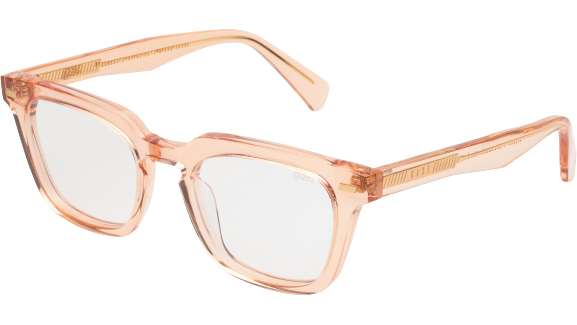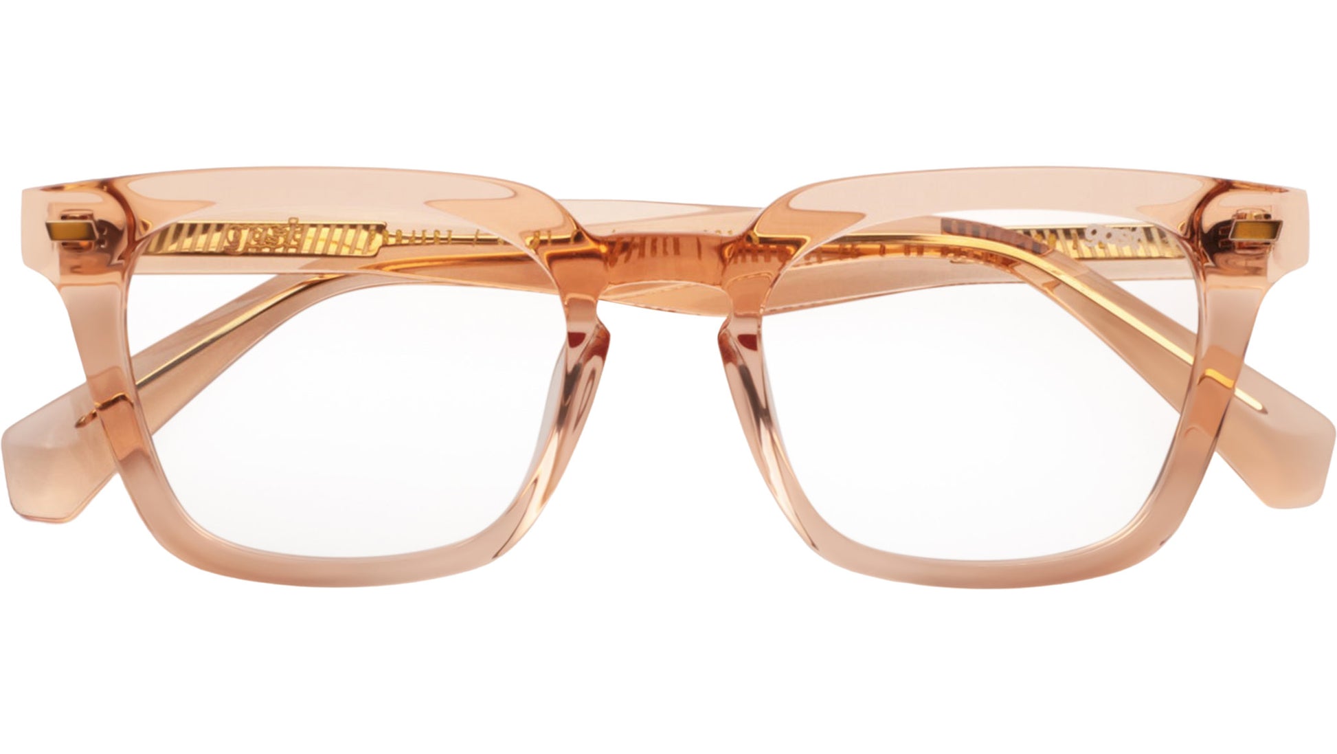 Gast CIACER glasses featuring peach squared acetate frame and demo lenses. This handmade optical frame features a distinctive peach acetate color, complemented by five barrels metal hinges for durability and flexibility. It is prescription-ready, allowing for easy customization to meet individual vision needs, and is sold with clear demo lenses for immediate use. Style code: CIACER. Color code: A904. Authorized Gast online reseller. Your glasses will include the original case and accessories and are covered by a 12-month global warranty.