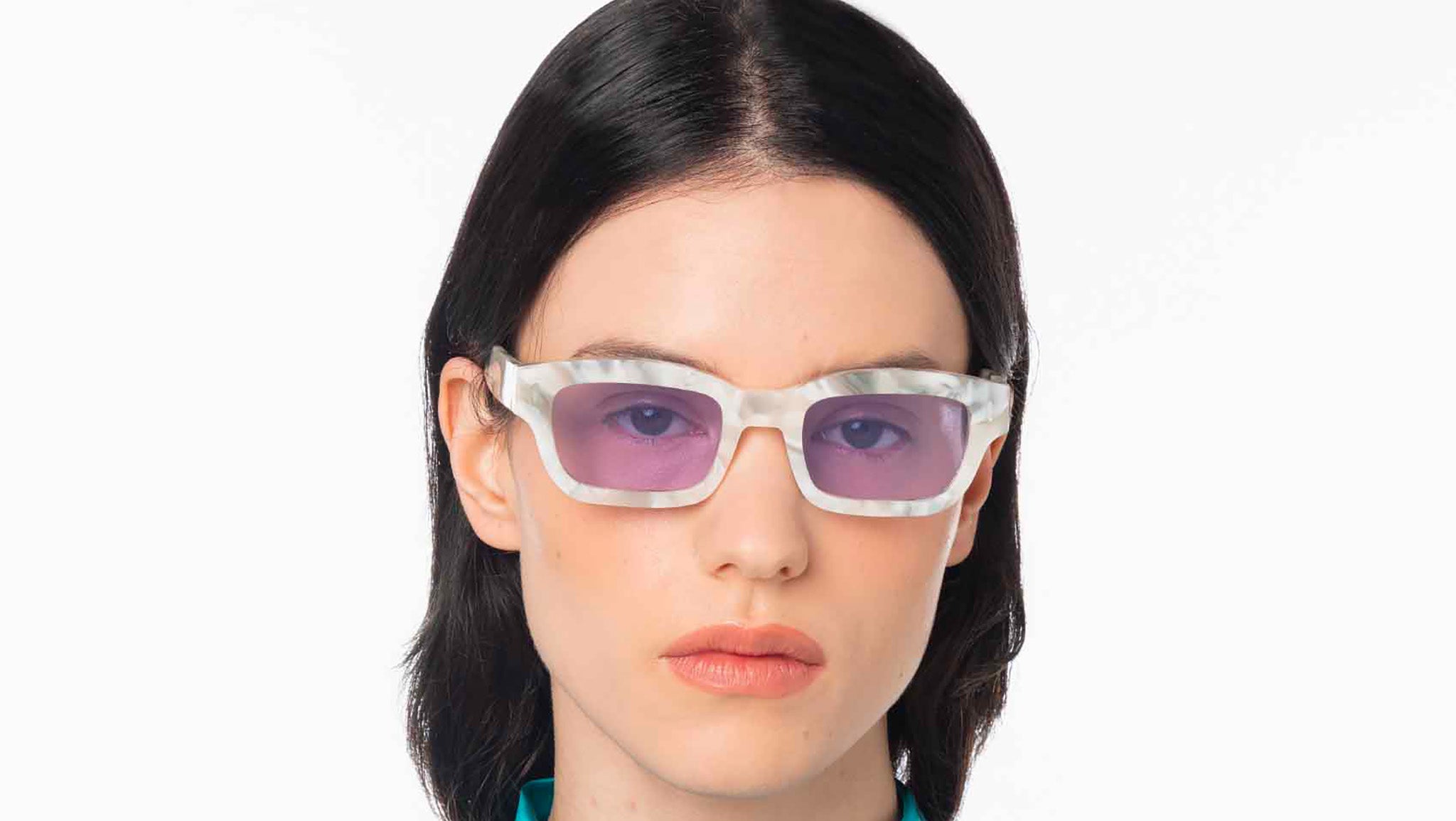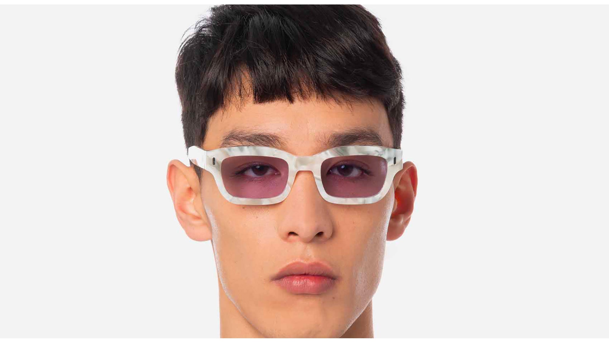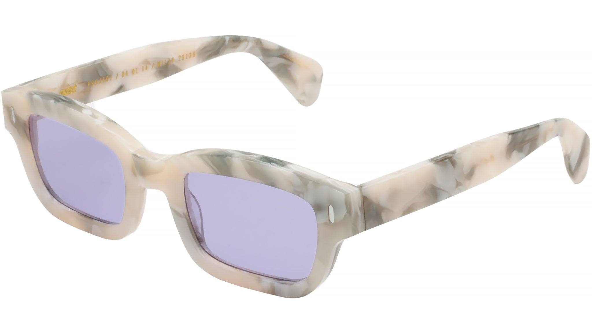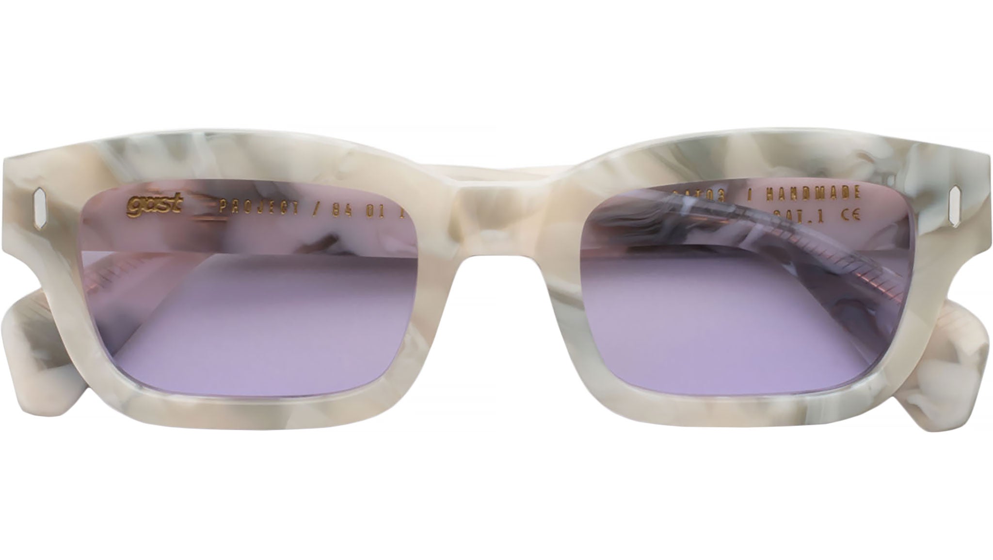 Gast GATE White Pearl. Handmade sunglasses with white pearl acetate frame and tinted violet semi-flat nylon lenses with anti-reflective inside coating 100% UVA / UVB protection. Five barrels metal hinges. Premium hard case and microfiber cleaning cloth.