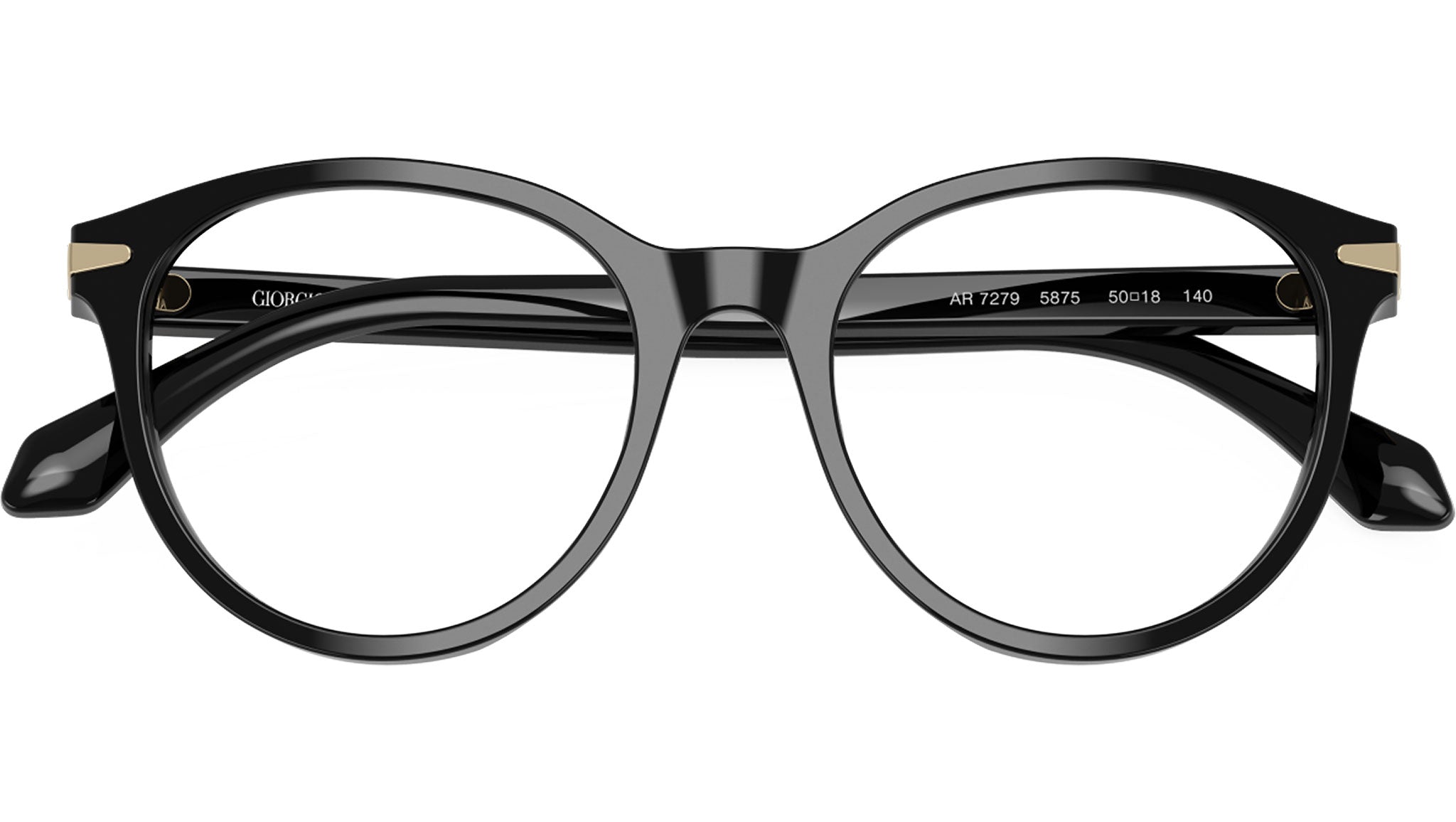 Giorgio Armani AR 7279 5875 glasses, featuring black round acetate frame and demo lenses. High bridge fit. Brand line: Armani Code. Style code: 0AR7279. Color code: 5875. Authorized Giorgio Armani online reseller. Your glasses will include the original case and accessories and are covered by a 12-month global warranty.