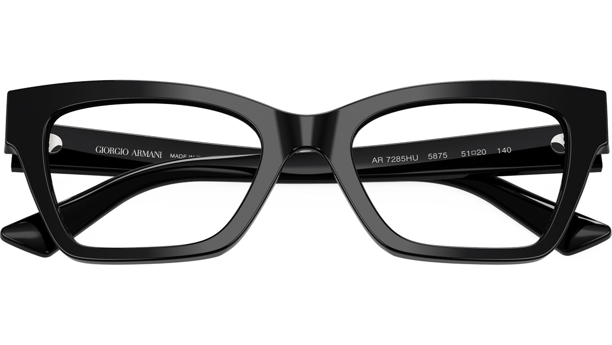 Giorgio Armani AR 7285HU 5875 glasses, featuring black cat eye acetate frame and demo lenses. Universal fit. Brand line: Armani Code. Style code: 0AR7285HU. Color code: 5875. Authorized Giorgio Armani online reseller. Your glasses will include the original case and accessories and are covered by a 12-month global warranty.