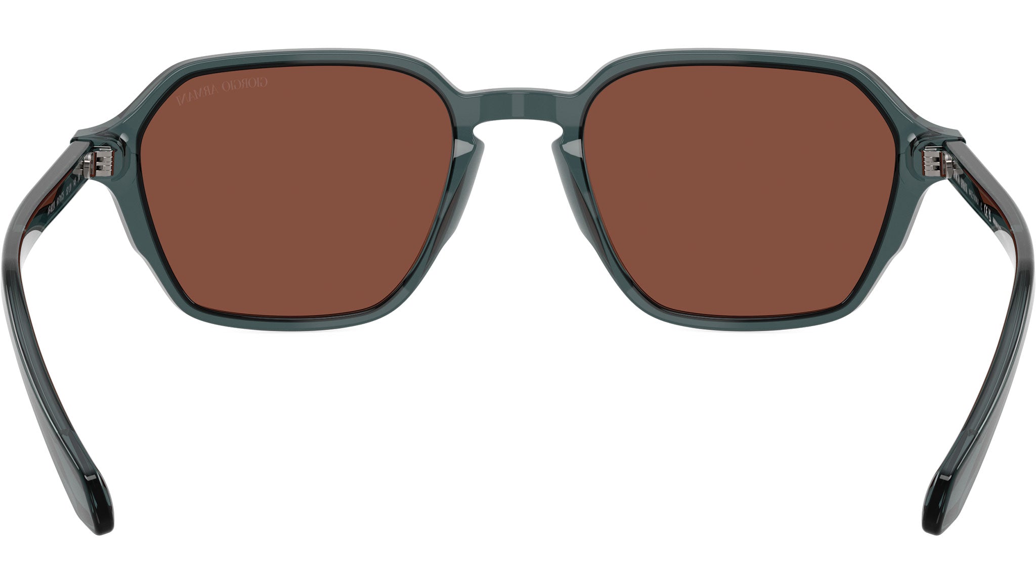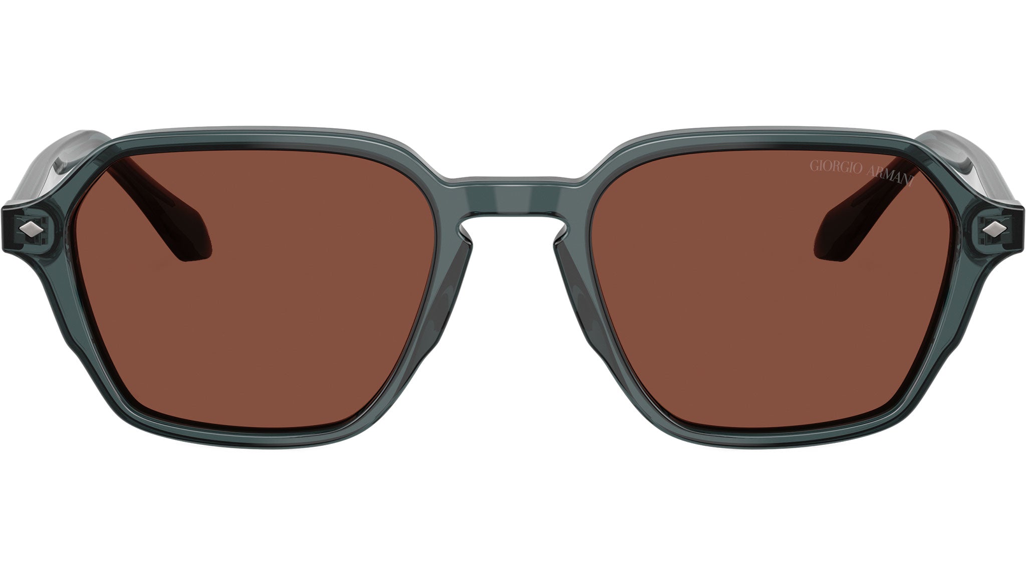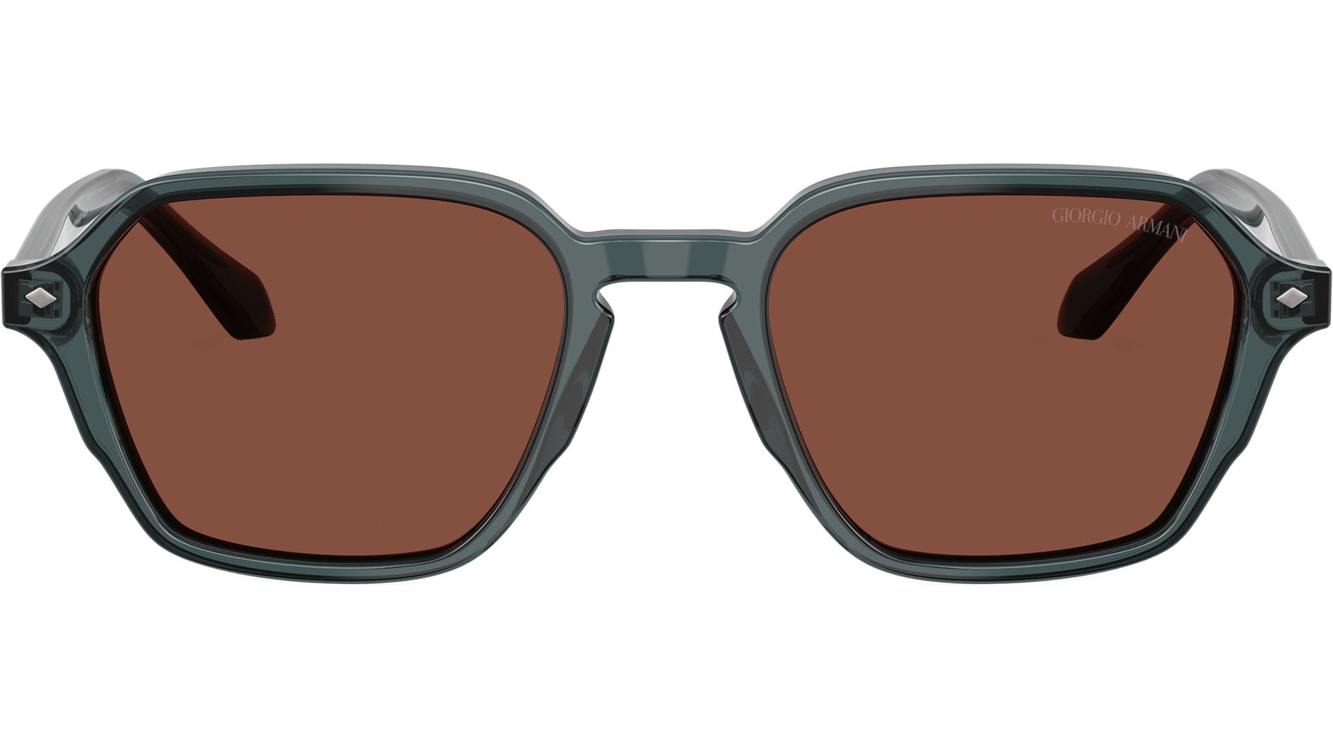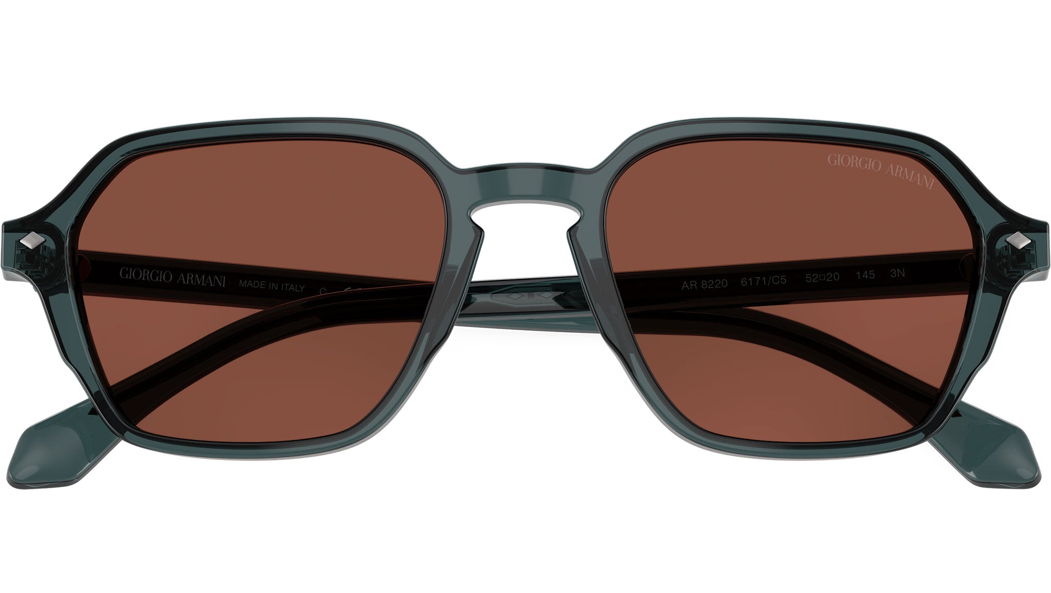 Giorgio Armani AR 8220 6171C5 sunglasses, featuring transparent grey squared acetate frame and red glass lenses. High bridge fit. Brand line: Armani Code. Style code: 0AR8220. Color code: 6171C5. Authorized Giorgio Armani online reseller. Your glasses will include the original case and accessories and are covered by a 12-month global warranty.