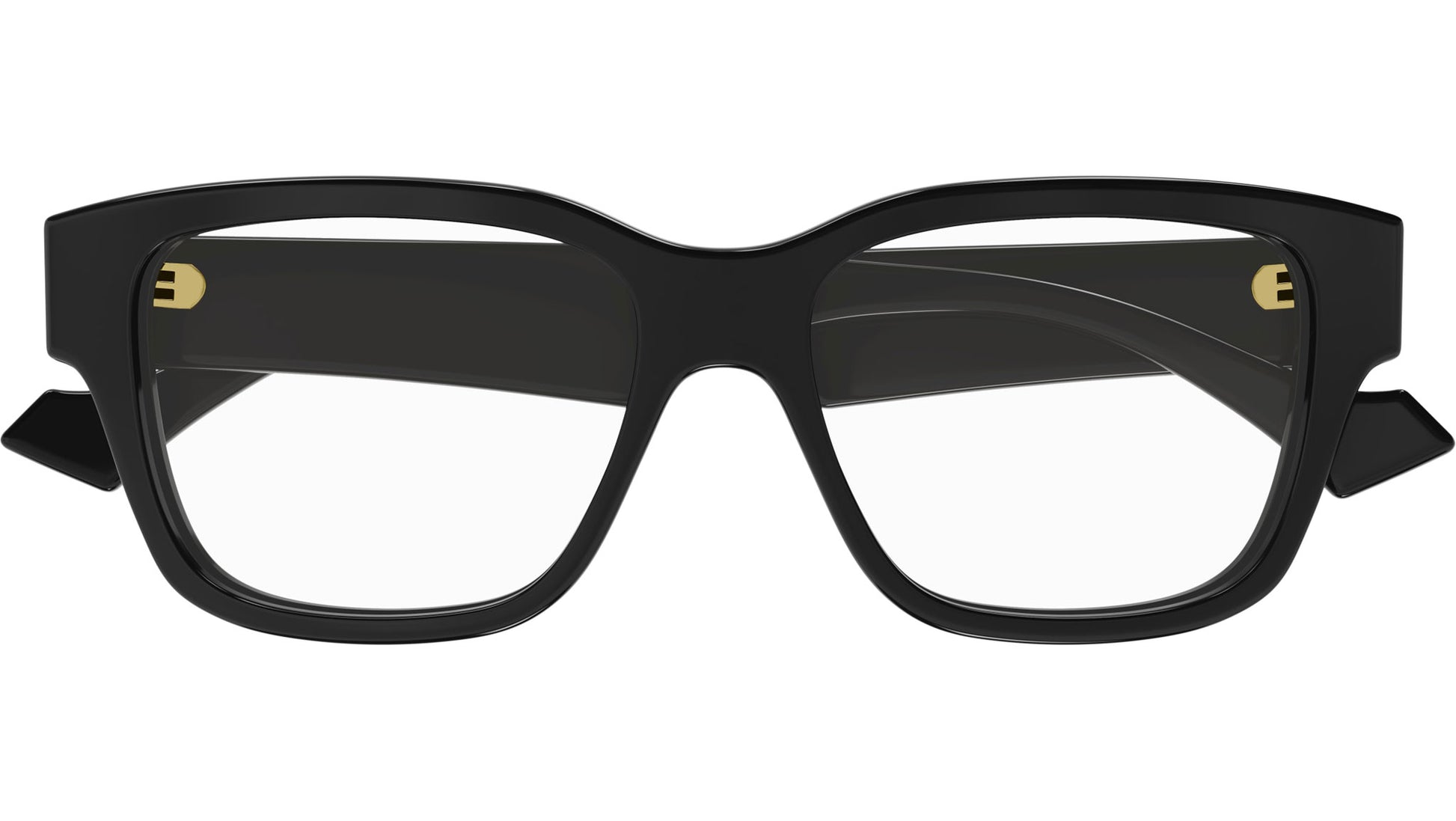 Gucci Lettering optical collection model GG1428O rectangle recycled acetate glasses color code 001 featuring shiny solid black frame and black temple.