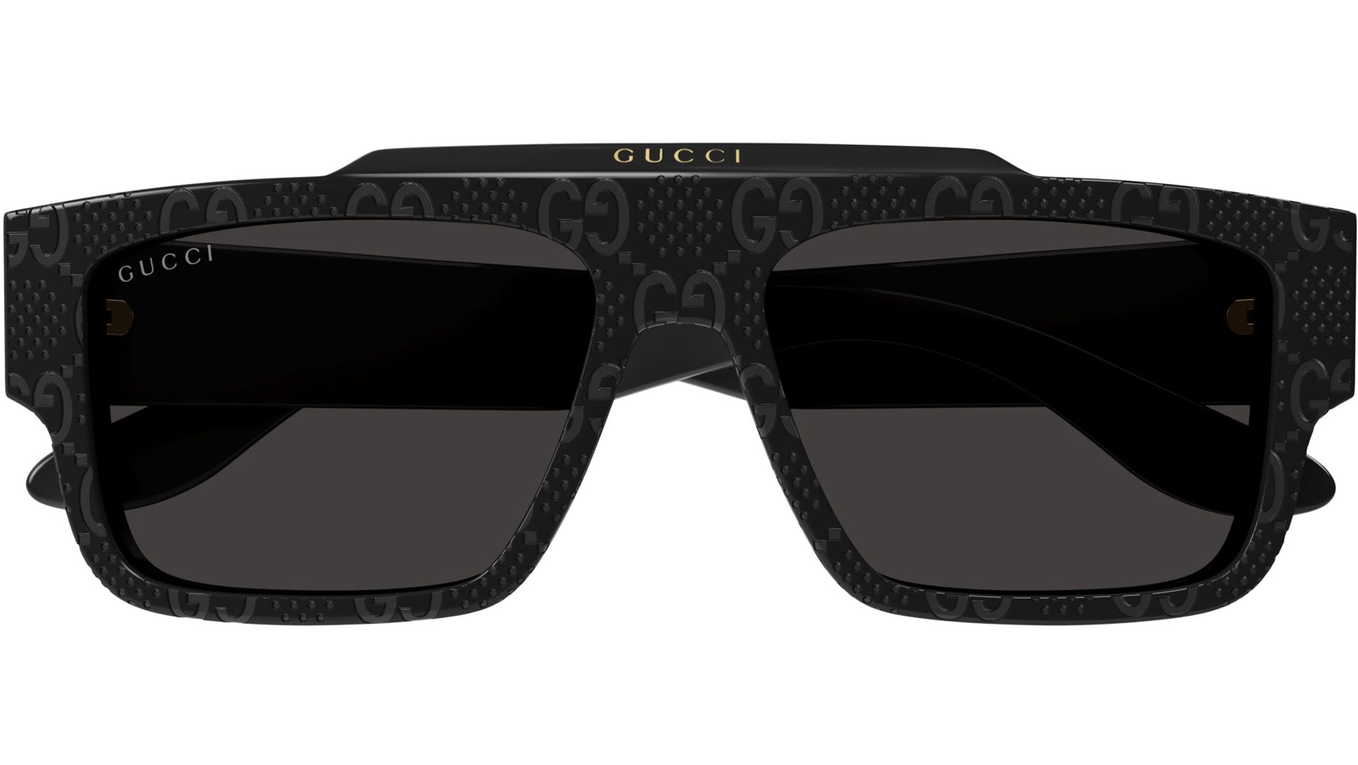 Gucci Lettering sunglasses model GG1460S rectangle recycled acetate frame color code 006 shiny solid black / Guccissima pattern with black temple and solid grey lens.