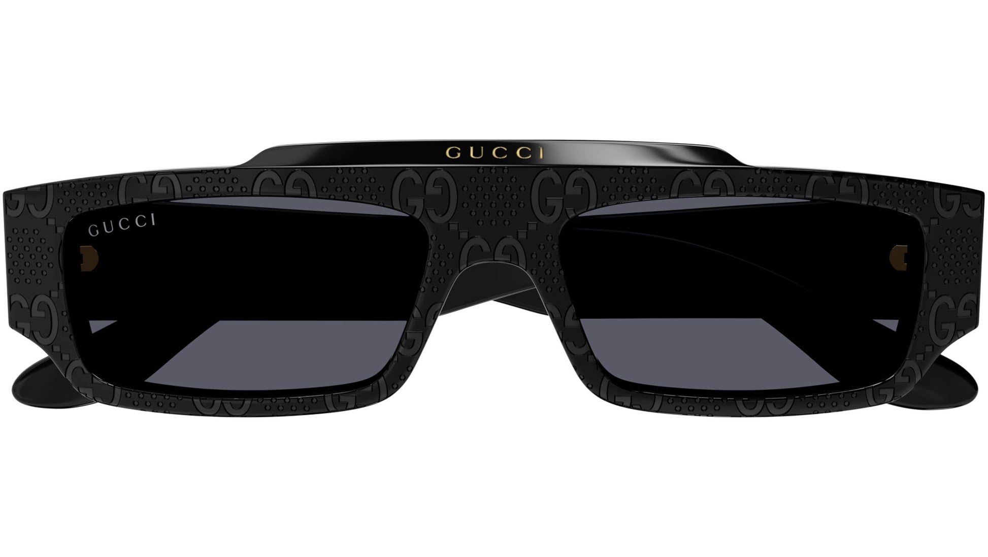 Gucci Lettering sunglasses model GG1592S rectangle recycled acetate frame color code 001 shiny solid black with Guccissima pattern with black temple and solid grey lens.