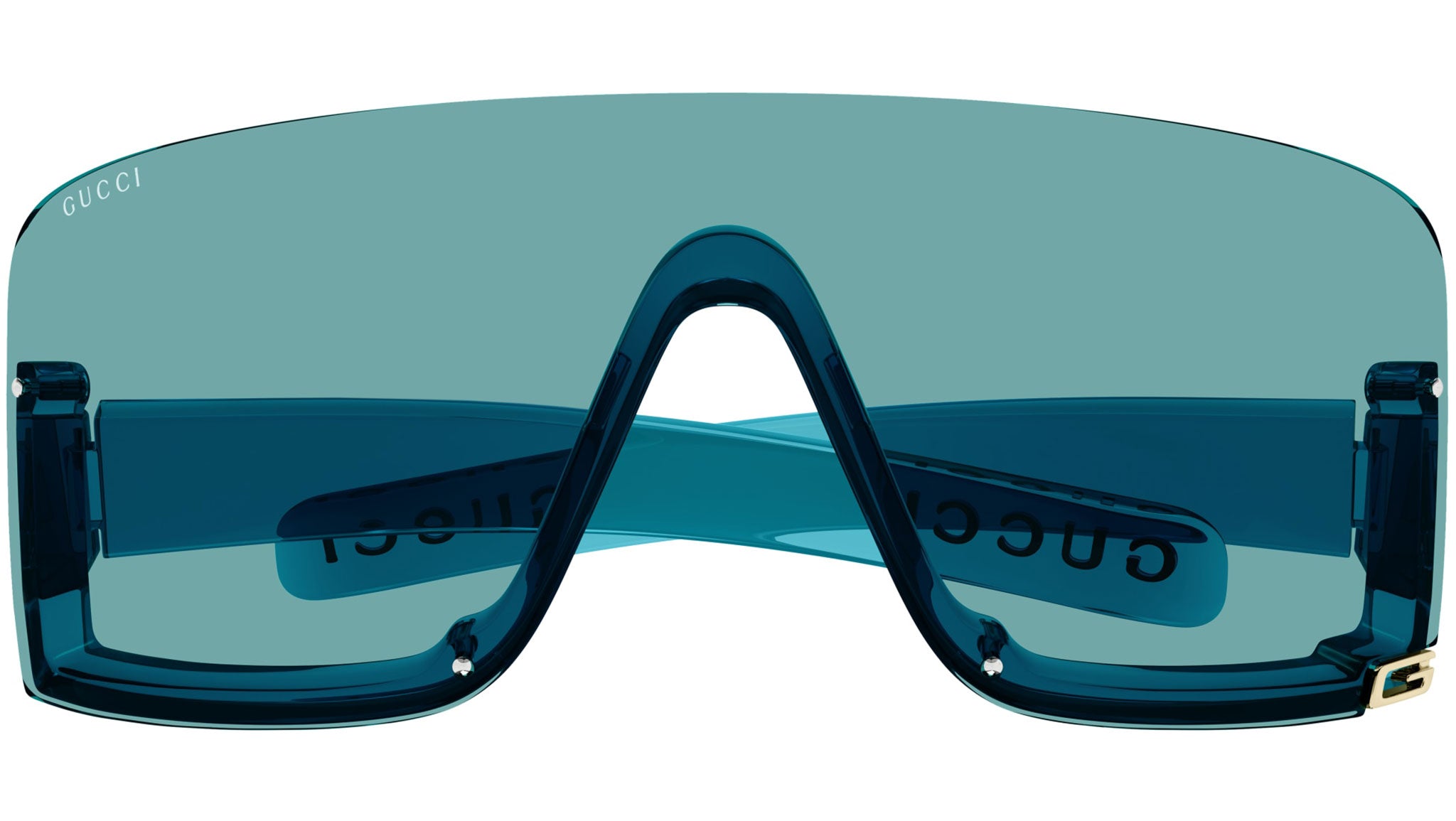 Gucci sunglasses model GG1637S Fashion eyewear collection shield injection frame featuring shiny turquoise frame and light-blue lens.