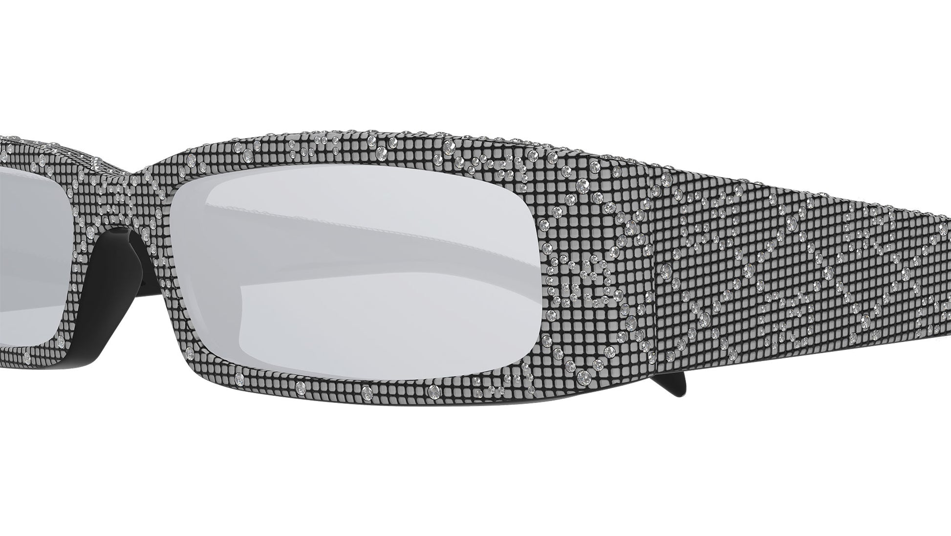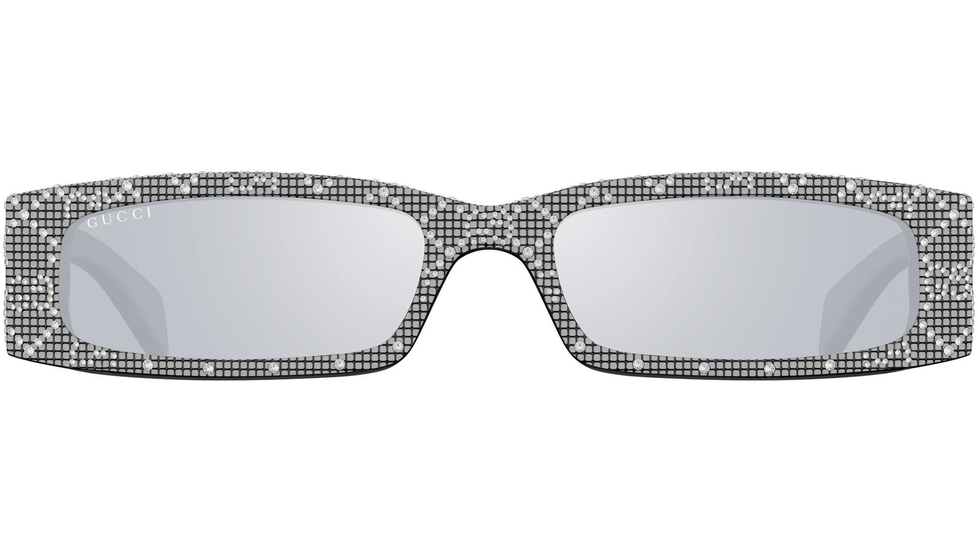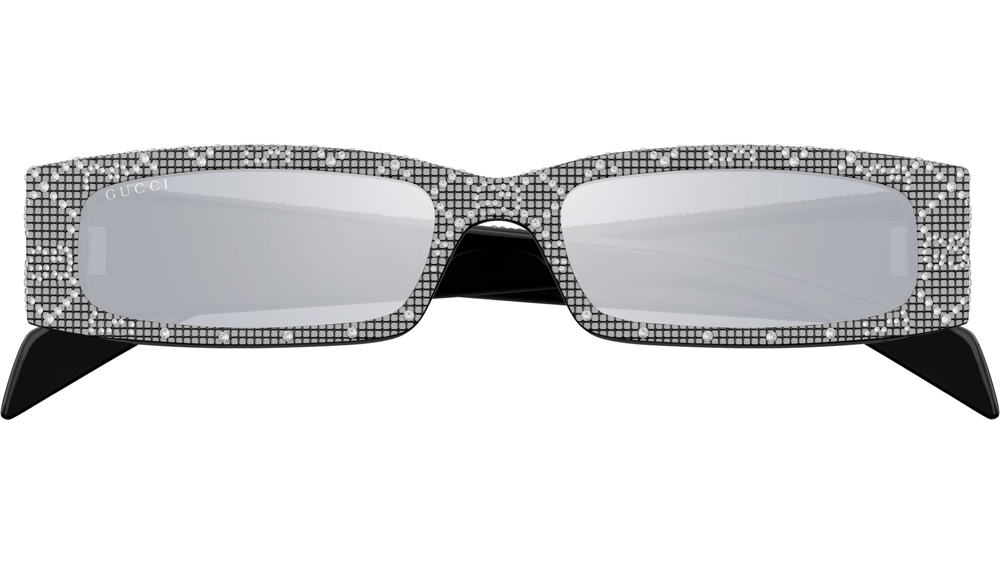Gucci sunglasses model GG1780S Fashion line rectangle recycled acetate frame color code 001 shiny black with crystal strass all over and shiny silver color with black temple and solid smoke base + multilayer silver lenses. Authorized Gucci online reseller. Your glasses will come with the original case and accessories and will be covered by a 12-month global warranty.