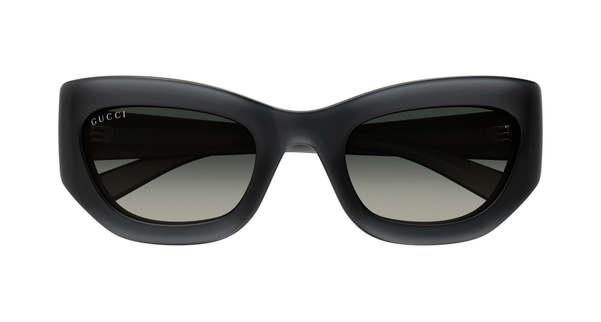 Gucci GG1784S 001 sunglasses for women, featuring matte milky dark grey cat eye injection frame and double gradient grey + light grey bio nylon lenses. Brand line: Emblem. Style code: GG1784S. Color code: 001. Made in Italy. Authorized Gucci online reseller. Your glasses will include the original case and accessories and are covered by a 12-month global warranty.