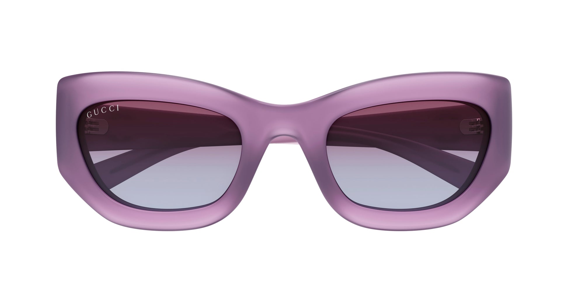 Gucci GG1784S 004 sunglasses for women, featuring matte milky lilac cat eye injection frame and double gradient violet + light blue bio nylon lenses. Brand line: Emblem. Style code: GG1784S. Color code: 004. Made in Italy. Authorized Gucci online reseller. Your glasses will include the original case and accessories and are covered by a 12-month global warranty.