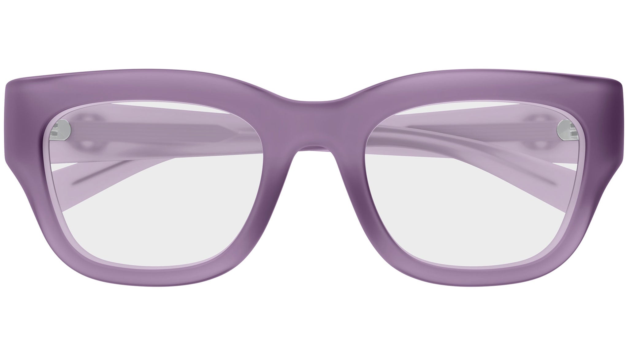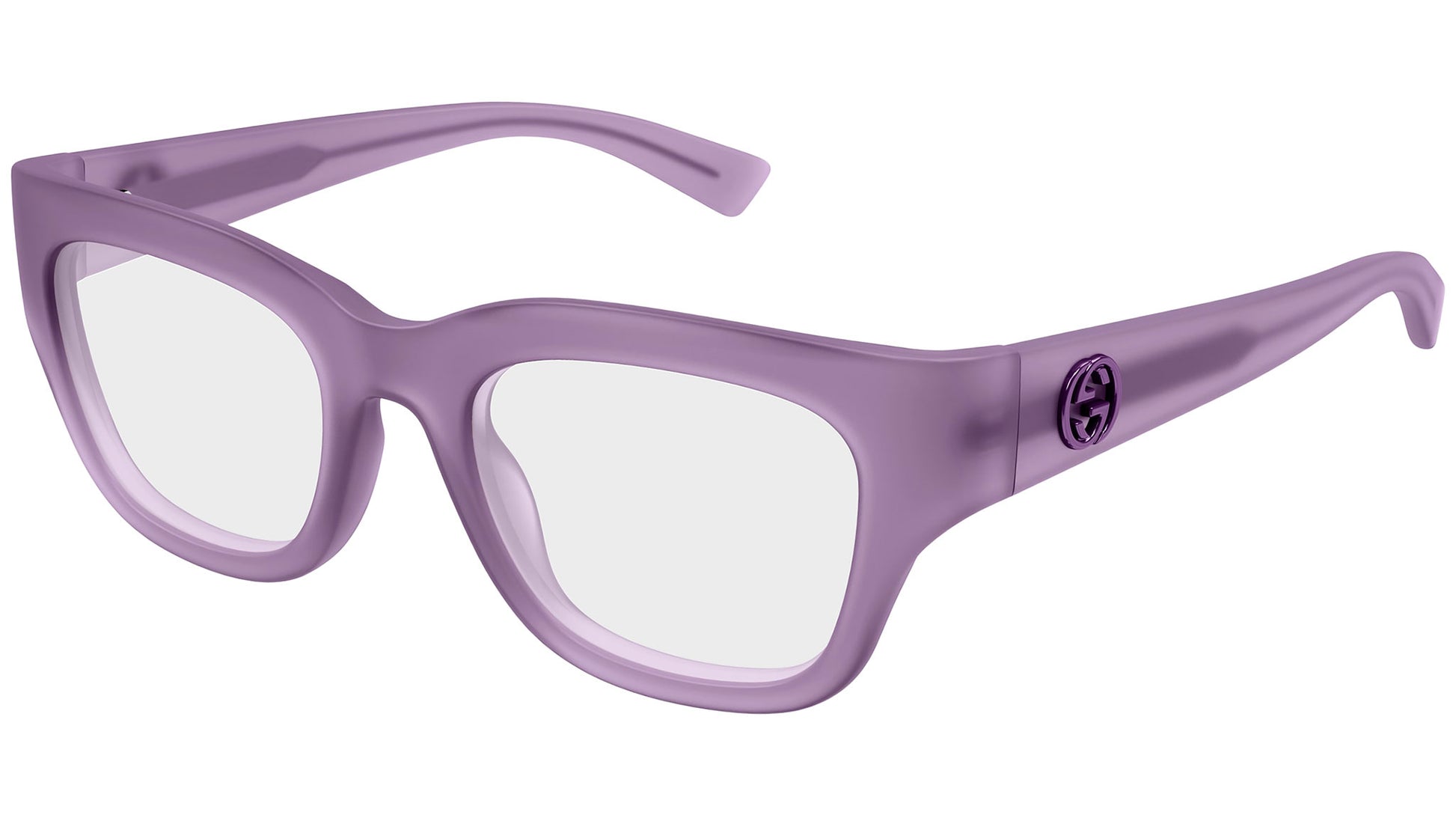 Gucci GG1785O 003 glasses for women, featuring matte milky lilac rectangular injection frame and demo lenses. Brand line: Emblem. Style code: GG1785O. Color code: 003. Made in Italy. Authorized Gucci online reseller. Your glasses will include the original case and accessories and are covered by a 12-month global warranty.