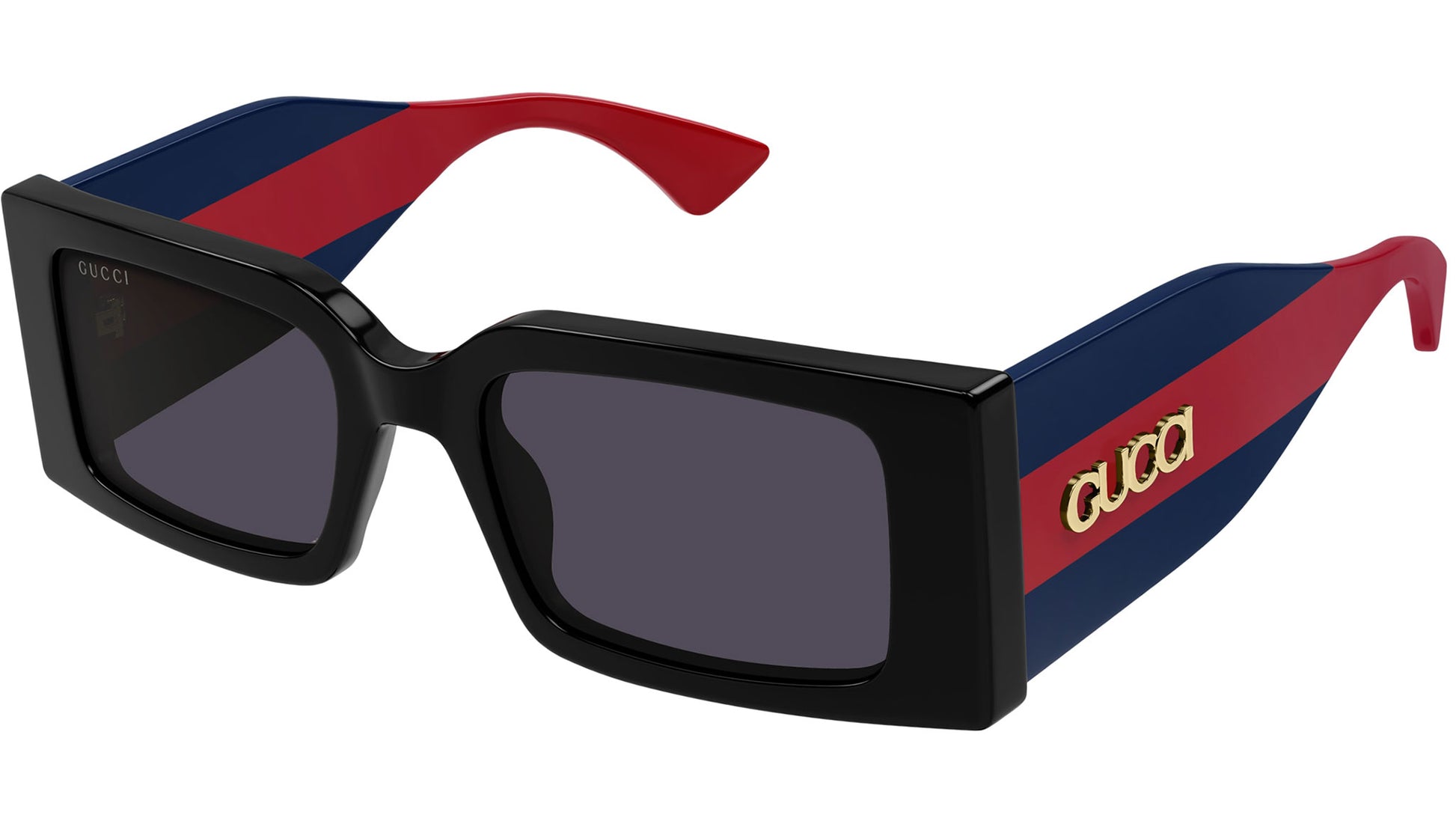 Gucci GG1860S 004 sunglasses for women, featuring shiny solid black rectangular recycled acetate frame and solid dark violet bio nylon lenses. Brand line: Web. Style code: GG1860S. Color code: 004. Made in Japan. Authorized Gucci online reseller. Your glasses will include the original case and accessories and are covered by a 12-month global warranty.