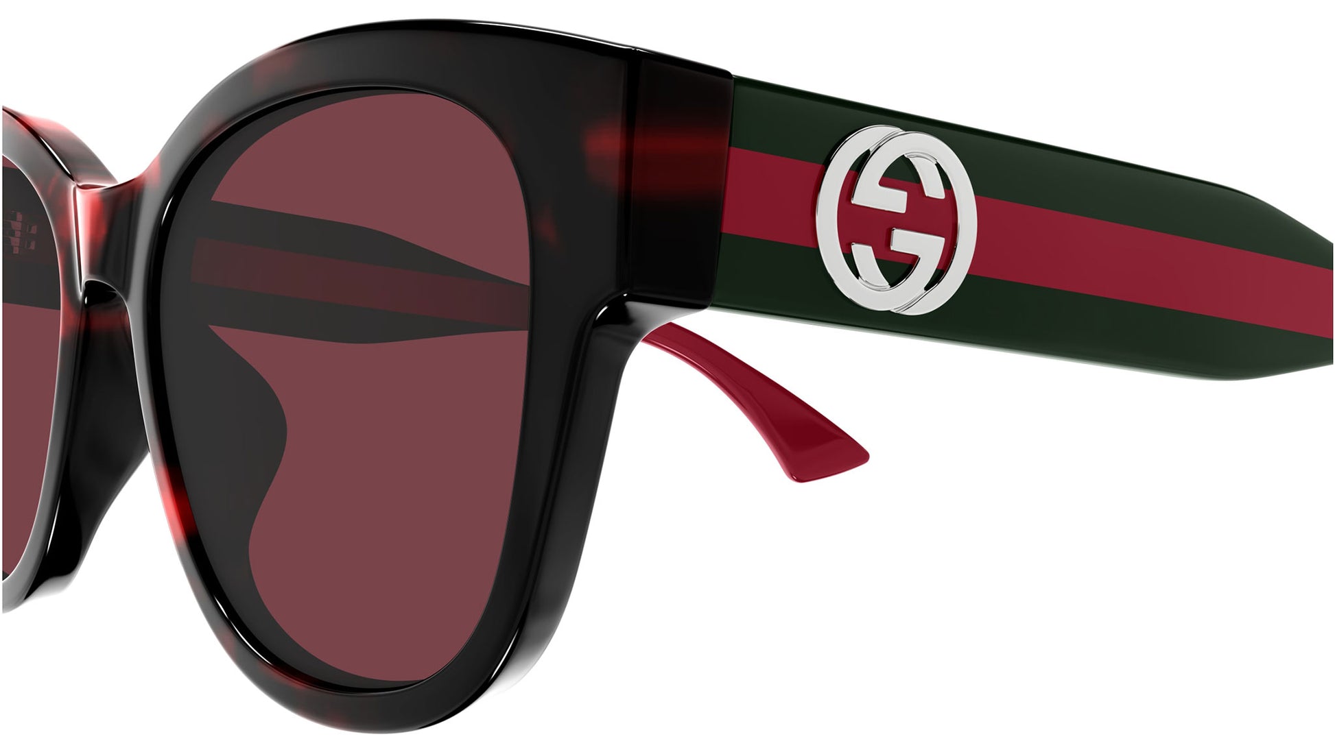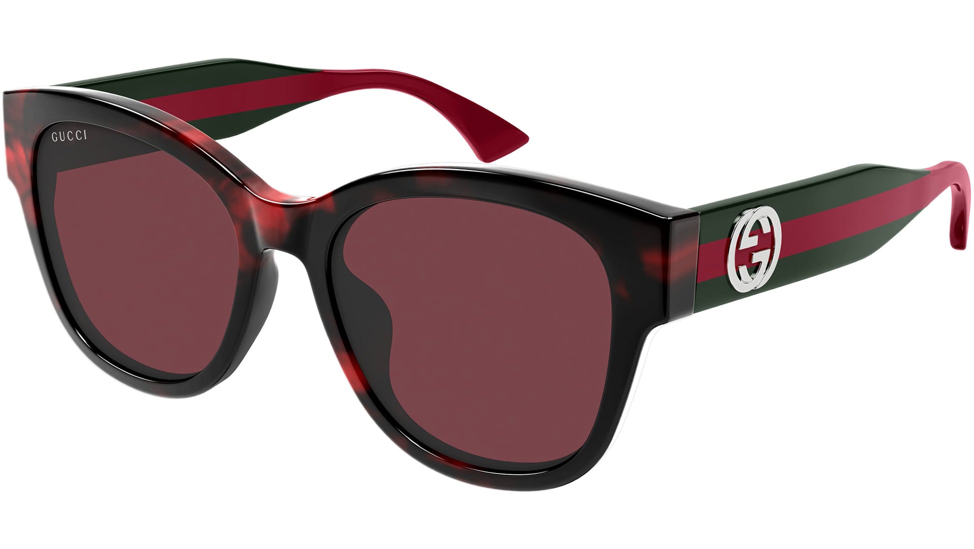 Gucci GG1866SK 003 sunglasses for women, featuring shiny melange burgundy classic havana butterfly recycled acetate frame and solid burgundy bio nylon lenses. Brand line: Web. Style code: GG1866SK. Color code: 003. Made in Japan. Authorized Gucci online reseller. Your glasses will include the original case and accessories and are covered by a 12-month global warranty.