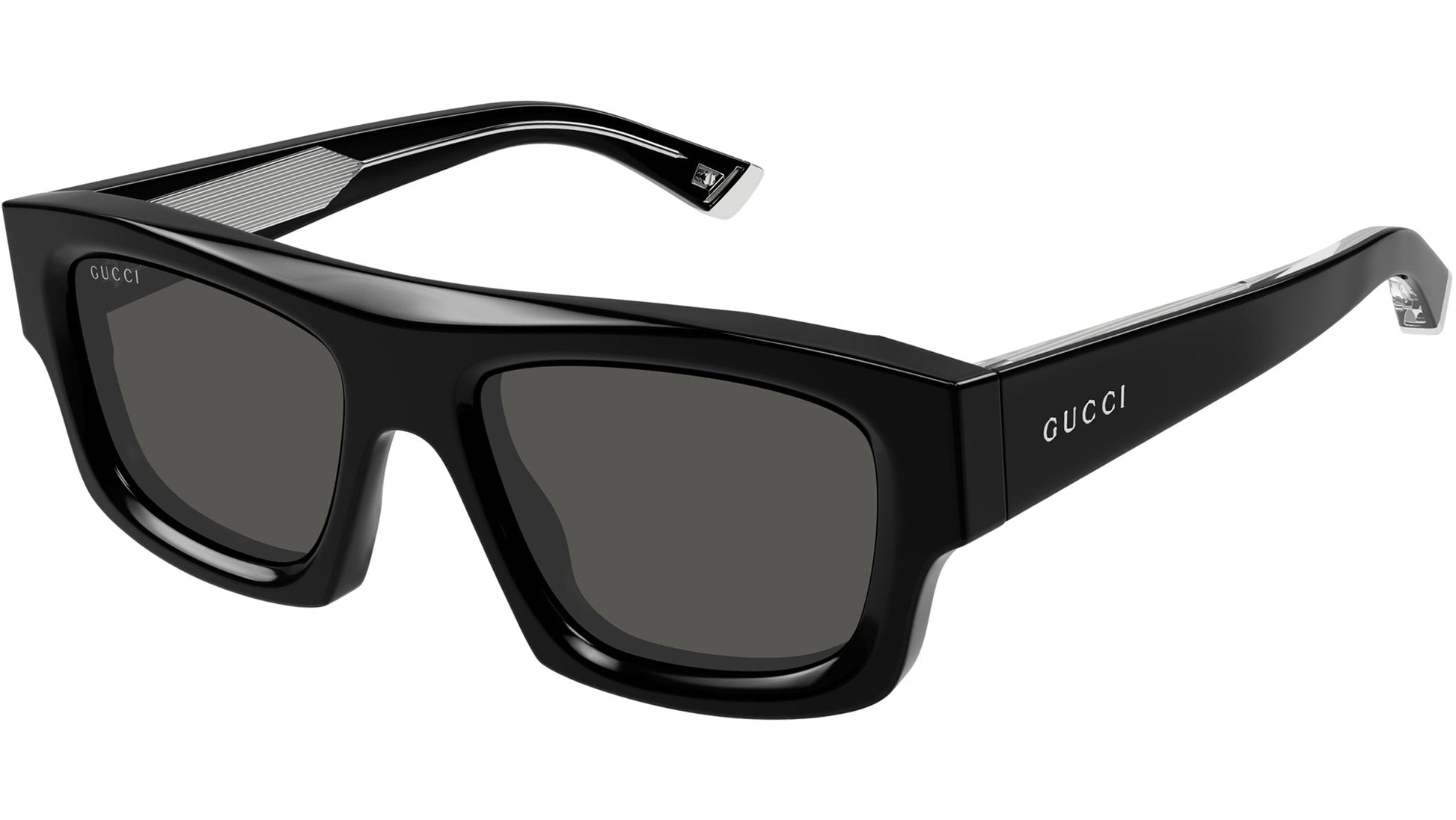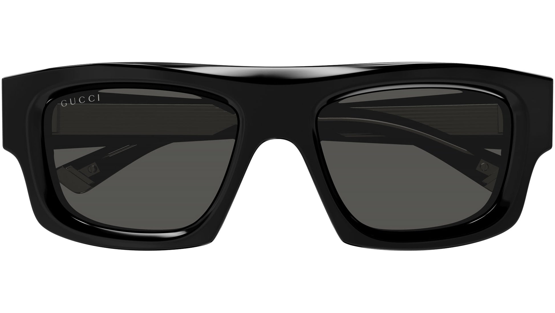 Gucci GG1926S 002 sunglasses for men, featuring shiny black rectangular recycled acetate frame and solid grey bio nylon lenses. Brand line: Eyewear. Style code: GG1926S. Color code: 002. Made in Italy. Authorized Gucci online reseller. Your glasses will include the original case and accessories and are covered by a 12-month global warranty.