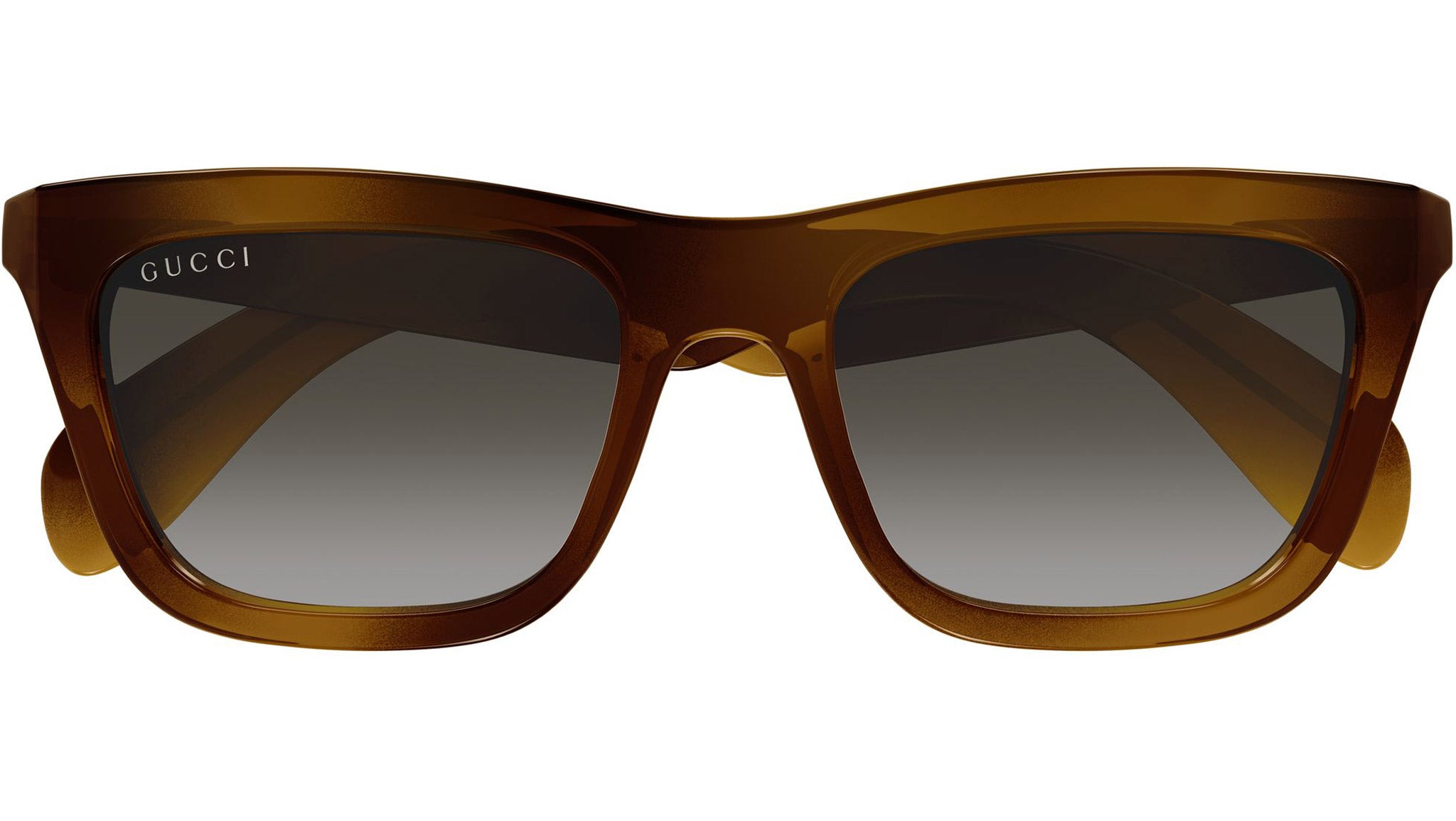 Gucci GG1933S 002 sunglasses for men, featuring shiny brown / amber havana rectangular injection frame and gradient warm grey bio nylon lenses. Brand line: Institutional Logo. Style code: GG1933S. Color code: 002. Made in Italy. Authorized Gucci online reseller. Your glasses will include the original case and accessories and are covered by a 12-month global warranty.