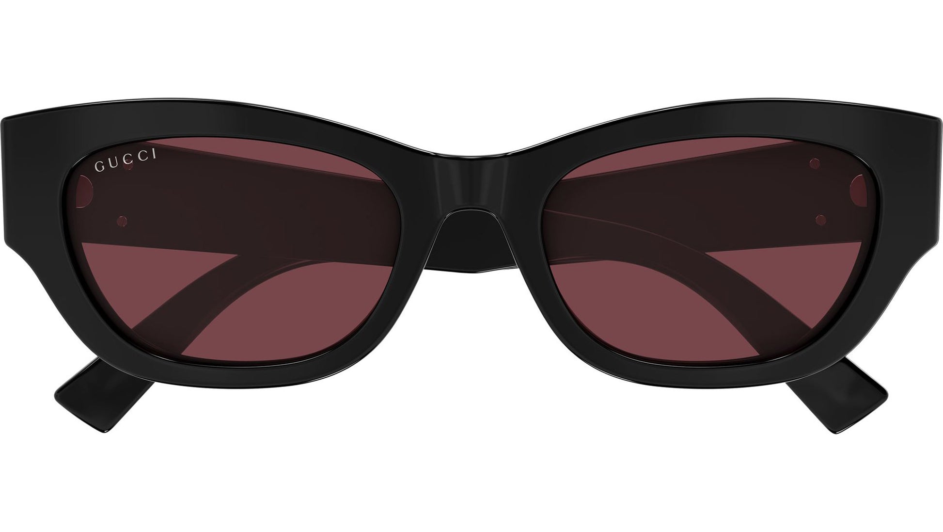 Gucci GG1954SA 004 sunglasses for women, featuring shiny solid black cat eye recycled acetate frame and solid burgundy bio nylon lenses. Brand line: Emblem. Style code: GG1954SA. Color code: 004. Made in Italy. Authorized Gucci online reseller. Your glasses will include the original case and accessories and are covered by a 12-month global warranty.