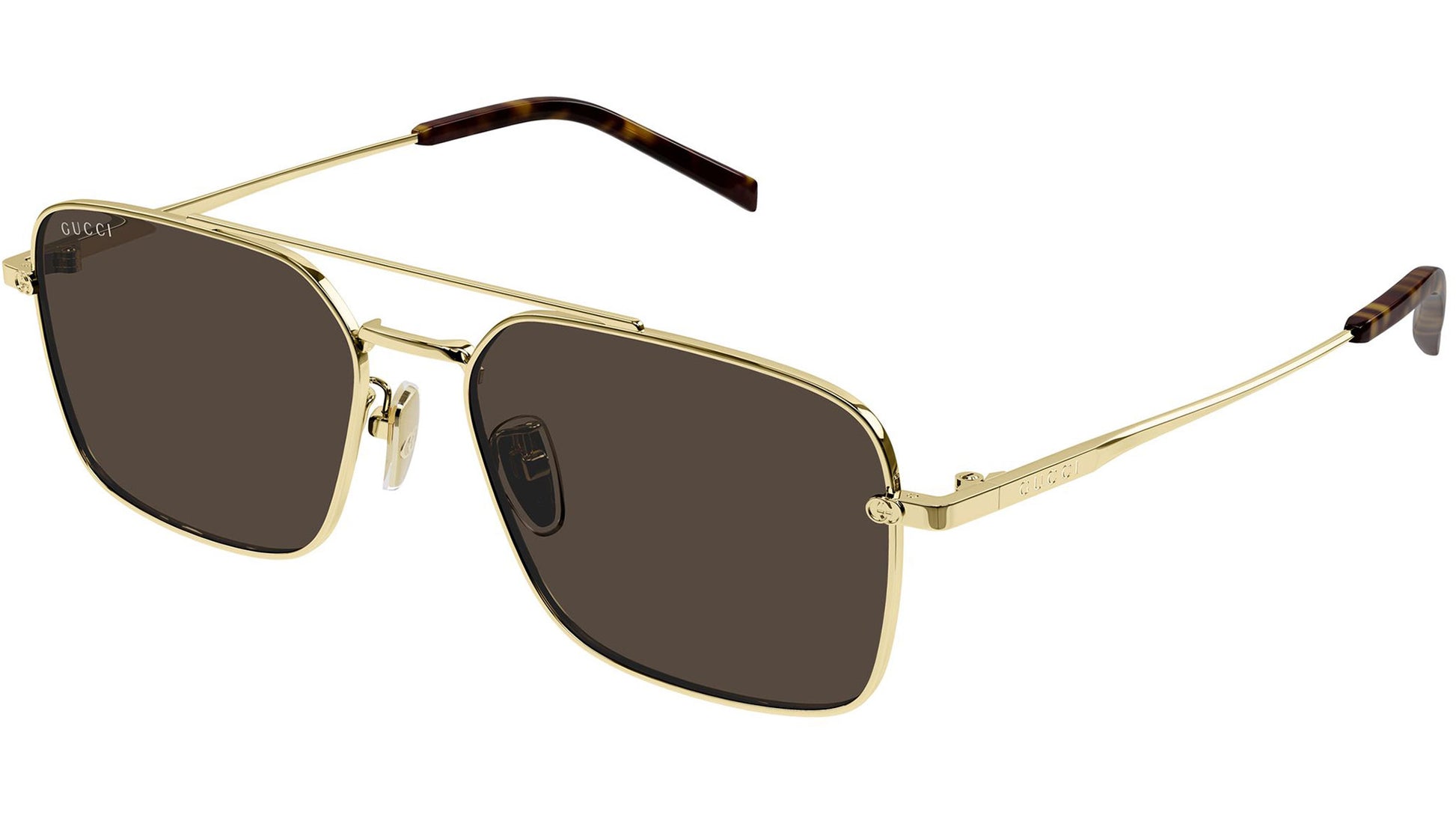 Gucci GG1957SA 002 sunglasses for men, featuring shiny endura gold rectangular metal frame and solid brown bio nylon lenses. Brand line: Institutional Logo. Style code: GG1957SA. Color code: 002. Made in Japan. Authorized Gucci online reseller. Your glasses will include the original case and accessories and are covered by a 12-month global warranty.