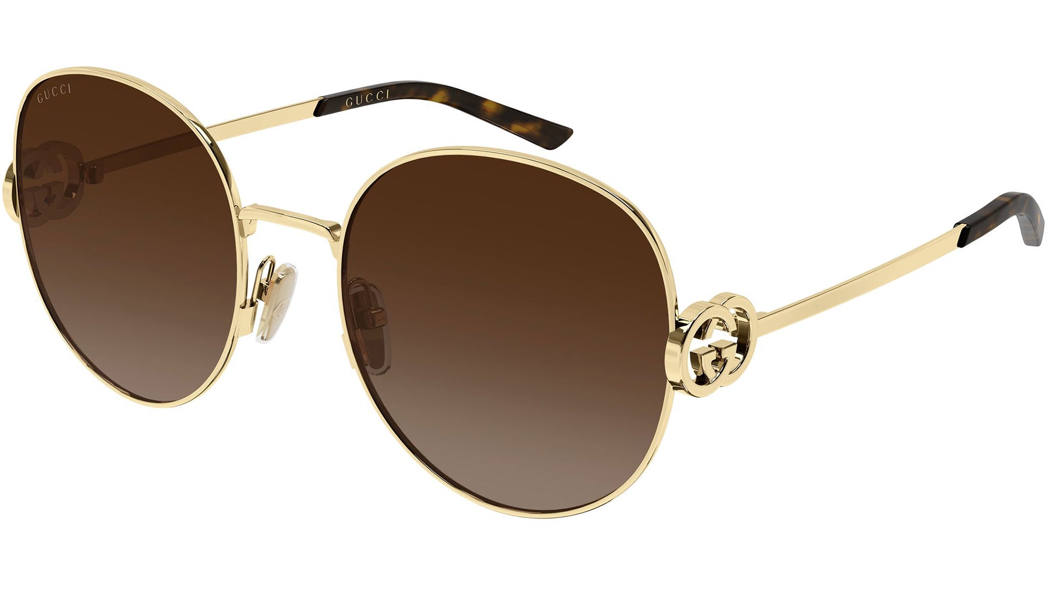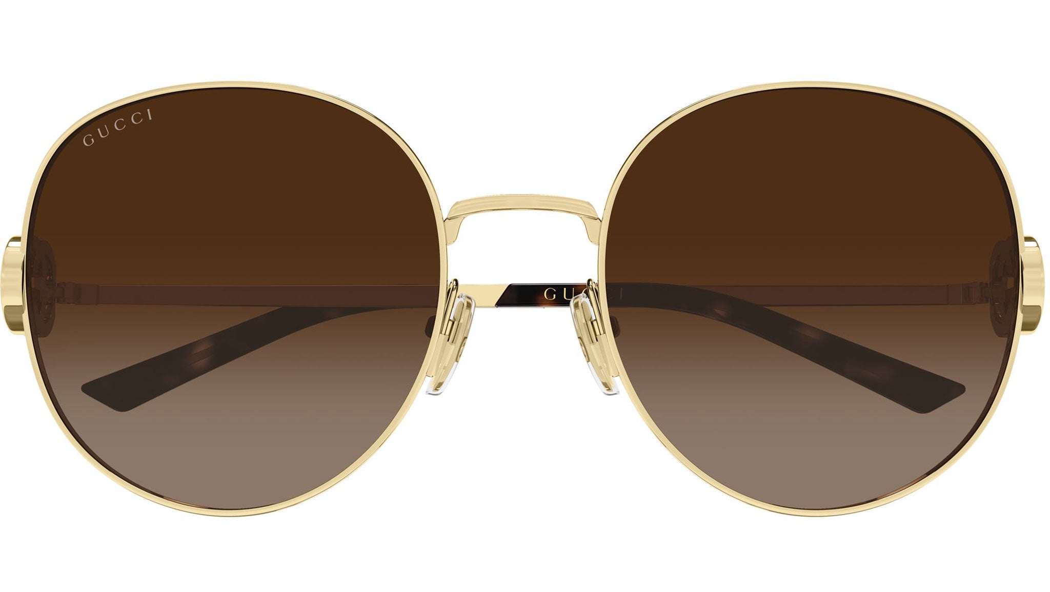 Gucci GG2047S 003 sunglasses for women, featuring shiny endura gold panthos metal frame and gradient brown bio nylon lenses. Brand line: Emblem. Style code: GG2047S. Color code: 003. Made in Italy. Authorized Gucci online reseller. Your glasses will include the original case and accessories and are covered by a 12-month global warranty.