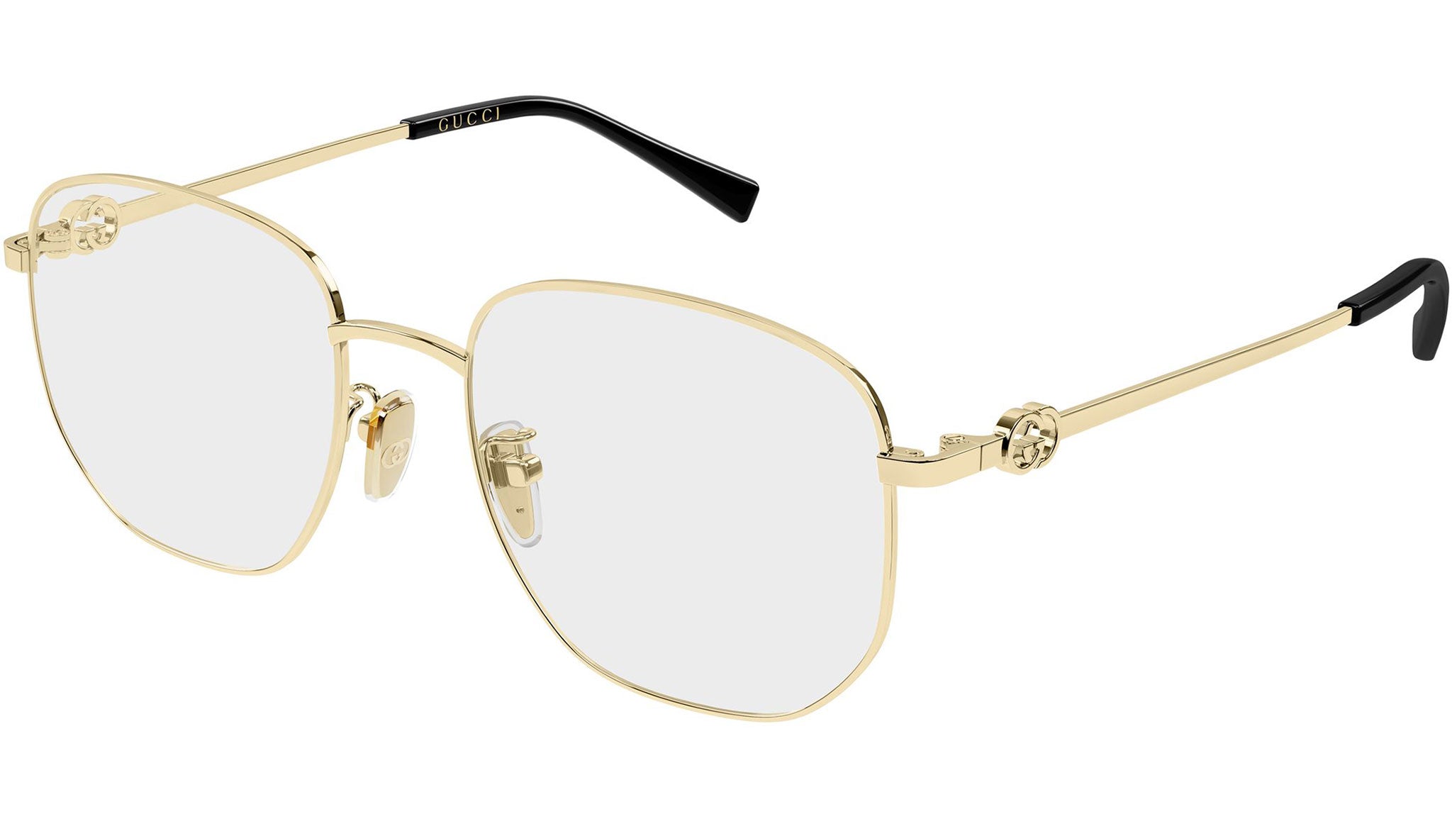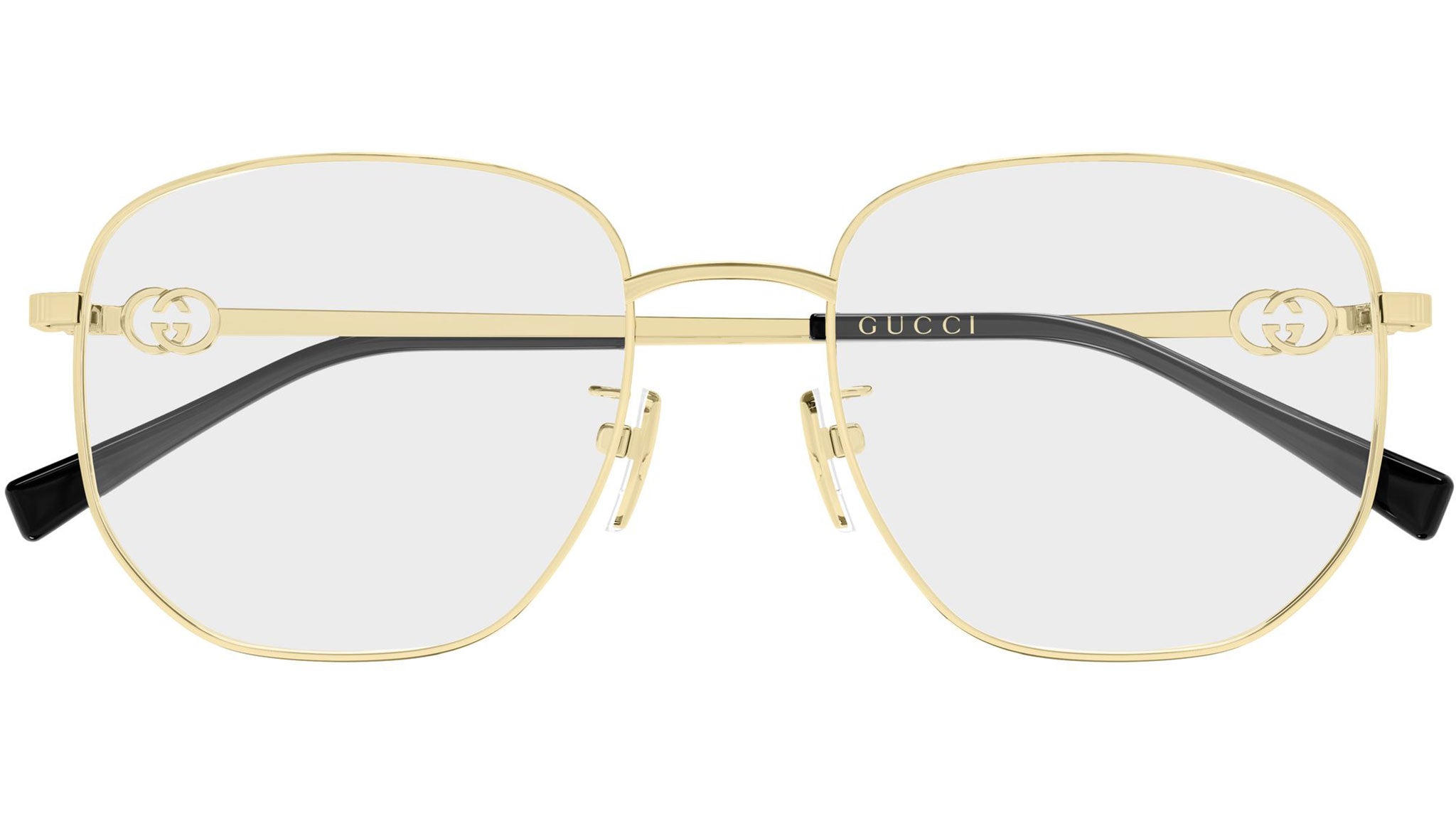 Gucci GG2146OA 001 glasses for women, featuring shiny endura gold rectangular metal frame and demo lenses. Brand line: Emblem. Style code: GG2146OA. Color code: 001. Made in Japan. Authorized Gucci online reseller. Your glasses will include the original case and accessories and are covered by a 12-month global warranty.