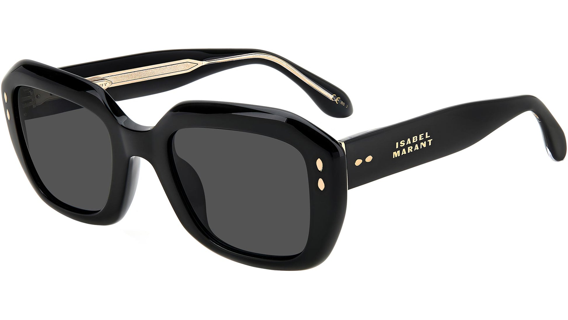 Isabel Marant IM 0108/G/S 807 IR black acetate rectangle Sunglasses. Isabel Marant’s The New eyewear collection is revisited with distinctive rounded edges for a softer look with the same fashionable attitude. Each pair celebrates the brand's hallmark detail with leaf-shaped end tips and silver leaf rivets on the front and temples. Standing out with a narrow rectangular silhouette, these sunglasses feature metal temple cores and lasered logo hinges. Isabel Marant's brand-new logo embellishes the left temple.