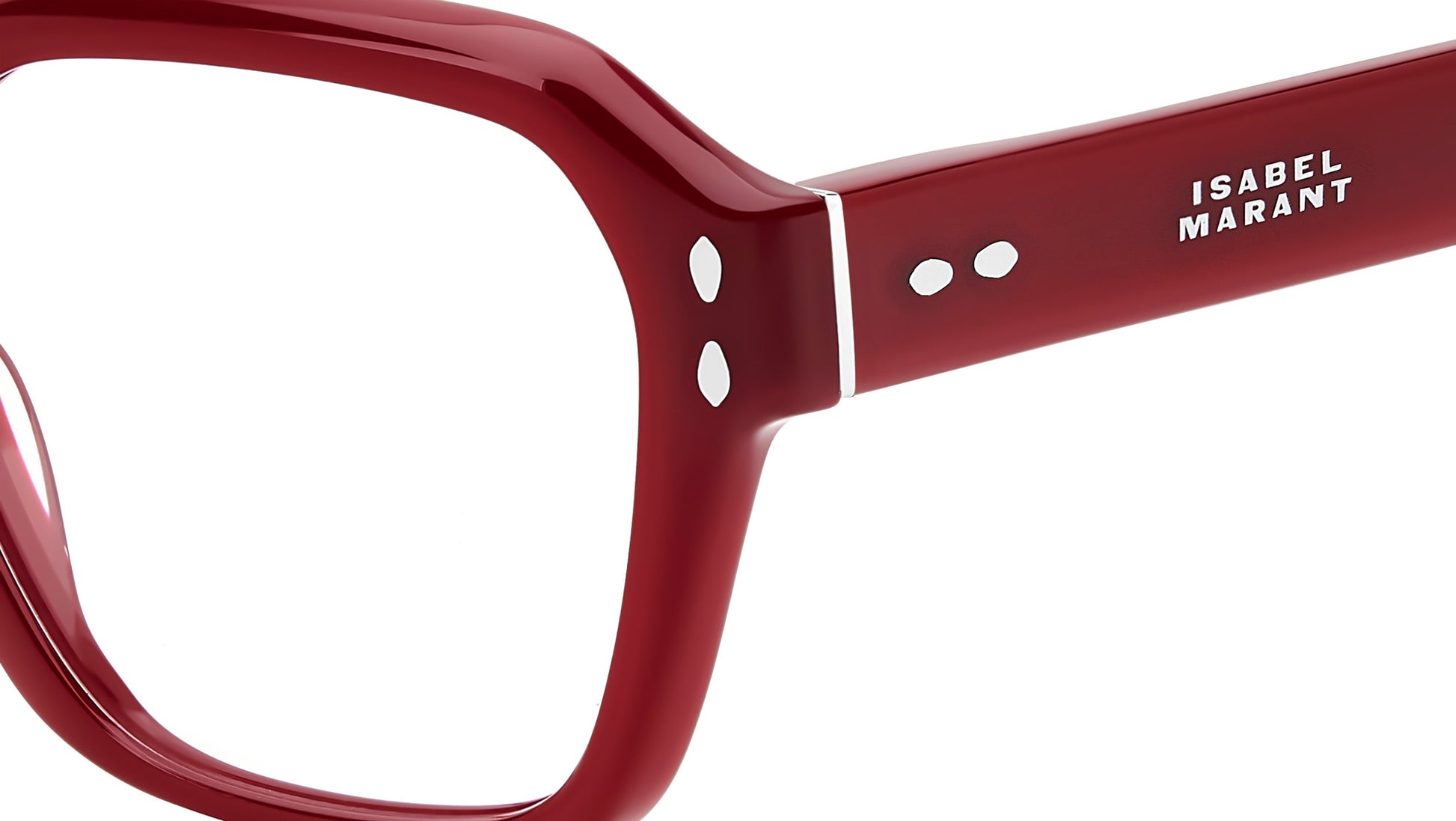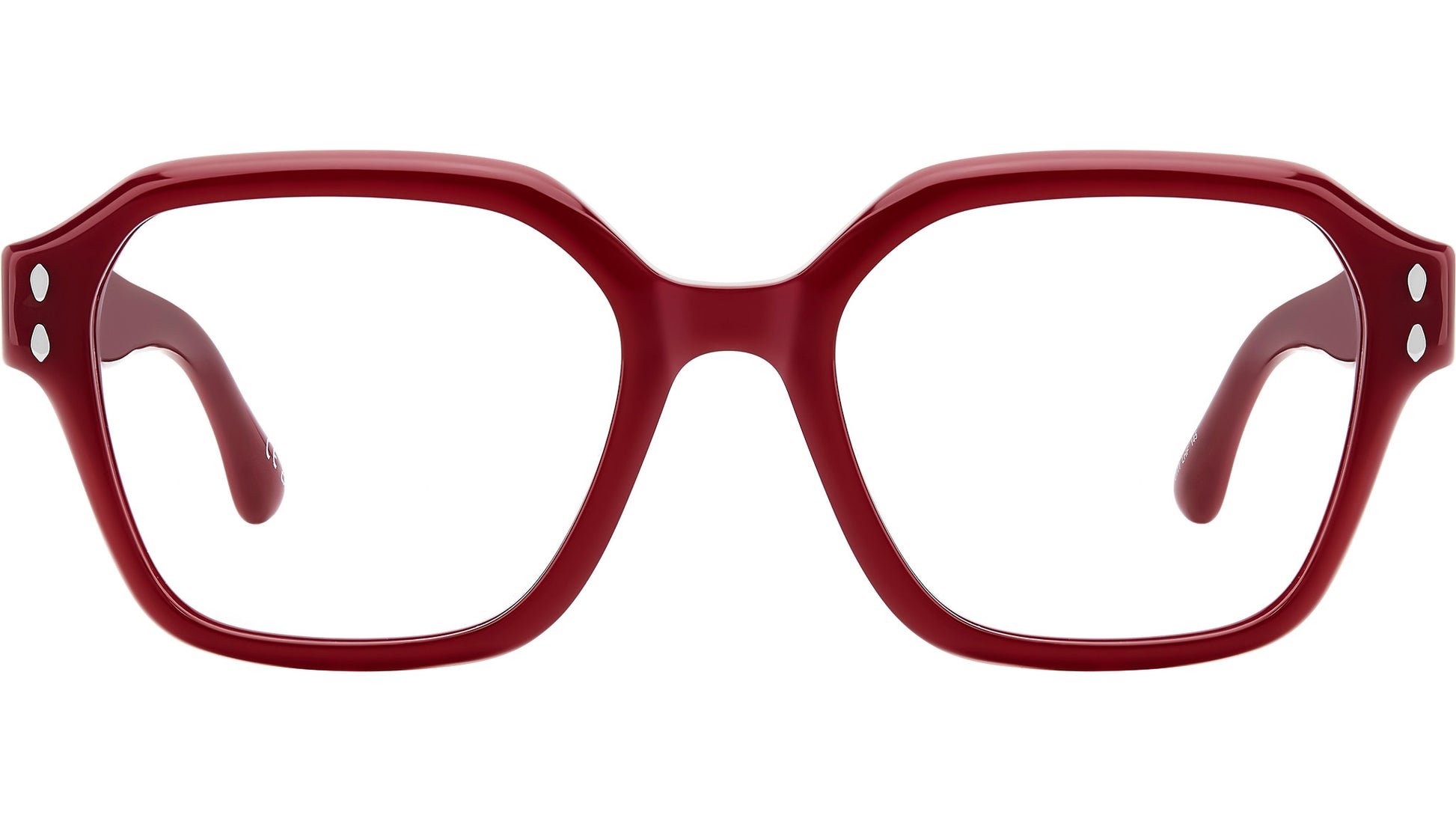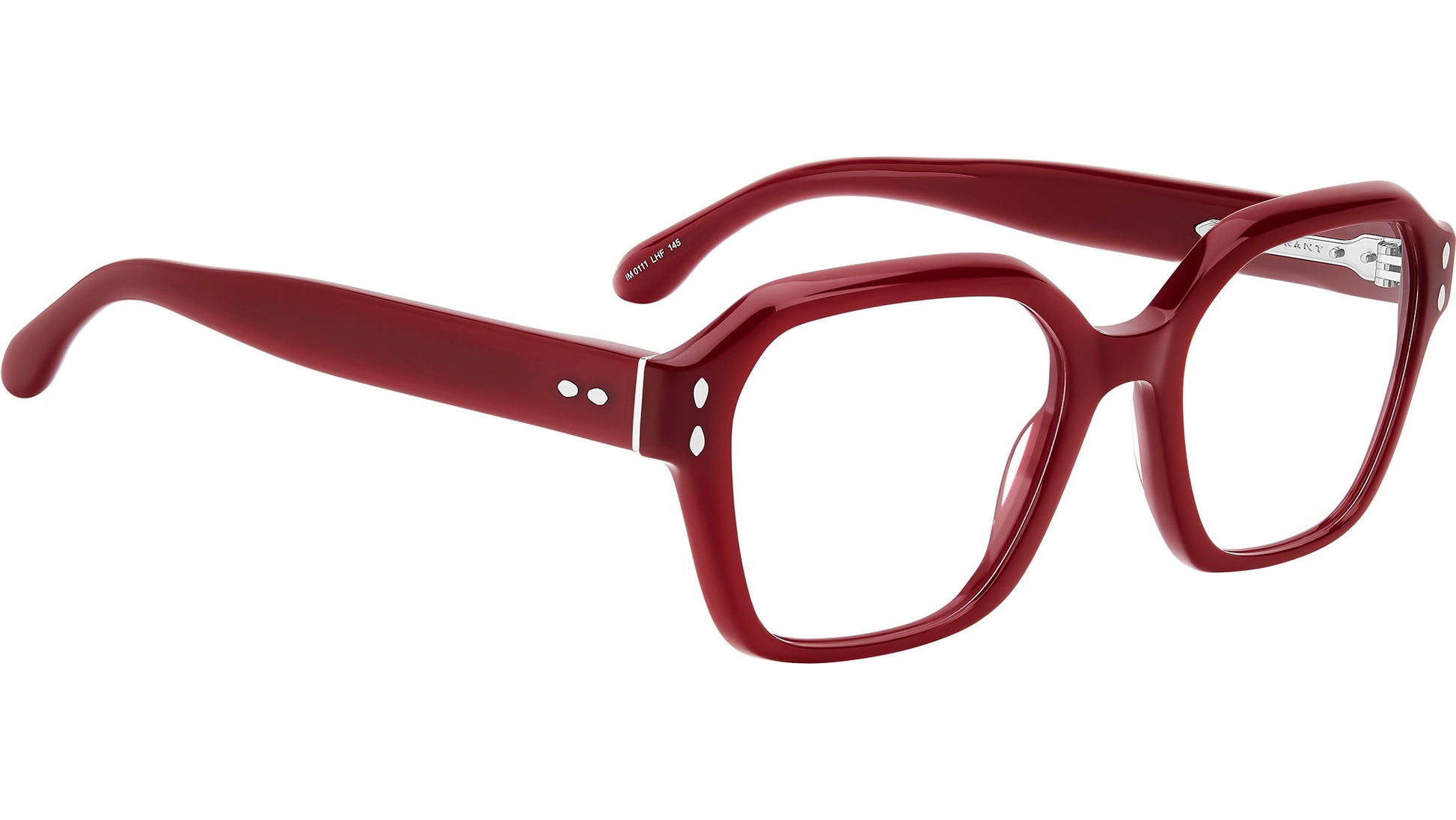 Isabel Marant IM 0111 LHF glasses for women, featuring burgundy rectangular acetate frame and demo lenses. Isabel Marant’s "The New" eyewear line is revisited with distinctive rounded edges for a softer look with the same fashionable attitude. Each pair celebrates the brand's hallmark detail with leaf-shaped end tips and silver leaf rivets on the front and temples. Updating a rectangular shape with gently angled edges, these optical glasses feature metal temple cores and lasered logo hinges. Isabel Marant's brand-new logo adorns the left temple. Brand line: The New. Style code: 107231. Color code: LHF. Authorized Isabel Marant online reseller. Your glasses will include the original case and accessories and are covered by a 12-month global warranty.