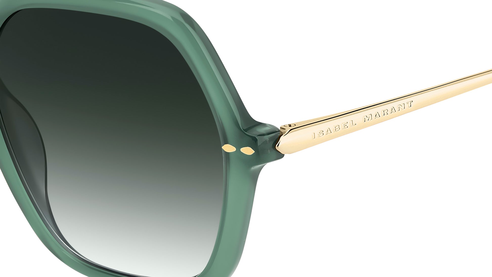 Isabel Marant IM 0206/G/S 1ED 9K sunglasses for women, featuring green squared acetate frame and green shaded lenses. "The Luck" eyewear line exudes sophisticated attitude through sleek yet powerful shapes that perfectly encapsulate the very essence of Isabel Marant. These sun frames feature tapered metal temples that take cues from the brand's beloved leaf motif, flowing seamlessly into a geometric acetate front with slimmed down profiles for a weightless feel. Lasered logo lettering, front metal trims and shaped end tips add a signature touch. Brand line: The Luck. Style code: 208044. Color code: 1ED 9K. Authorized Isabel Marant online reseller. Your glasses will include the original case and accessories and are covered by a 12-month global warranty.